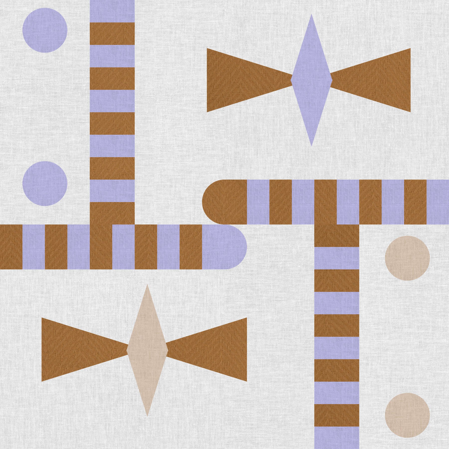 Experience the tactile beauty of 'Modern Woven Textures' wallpaper. This design seamlessly blends geometric shapes with the visual appeal of woven fabrics. The interplay of soft lavender and rich brown creates a sophisticated contrast against a neutral linen backdrop. The repetitive yet varied arrangement of stripes, circles, and stylized bowties adds visual interest without being overwhelming. It's a perfect choice for creating a tranquil yet modern atmosphere in any room of the house, from bedrooms and living rooms to hallways and even offices.