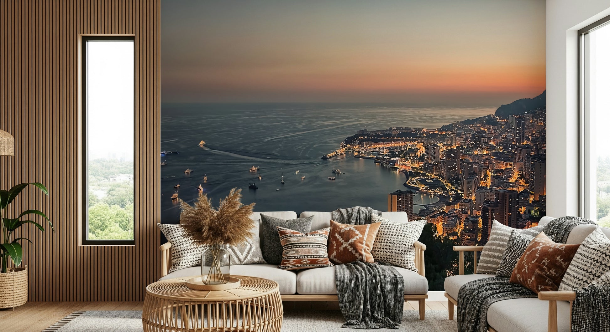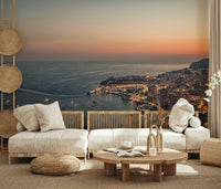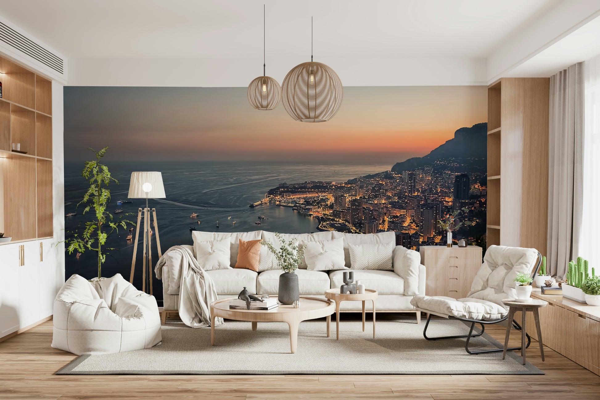 Experience the radiant beauty of Monaco at twilight with this stunning wallpaper for walls. The design captures the city's twinkling lights against the darkening sky and the vast expanse of the sea. Its colours mix from the fading oranges and pinks of the sunset to the deep blues of the water, creating a tranquil mood. Ideal for a living room or bedroom, the calming colours add peace to any space. Consider using it in a home office to foster creativity. This wallpaper seamlessly integrates with modern or contemporary interiors.