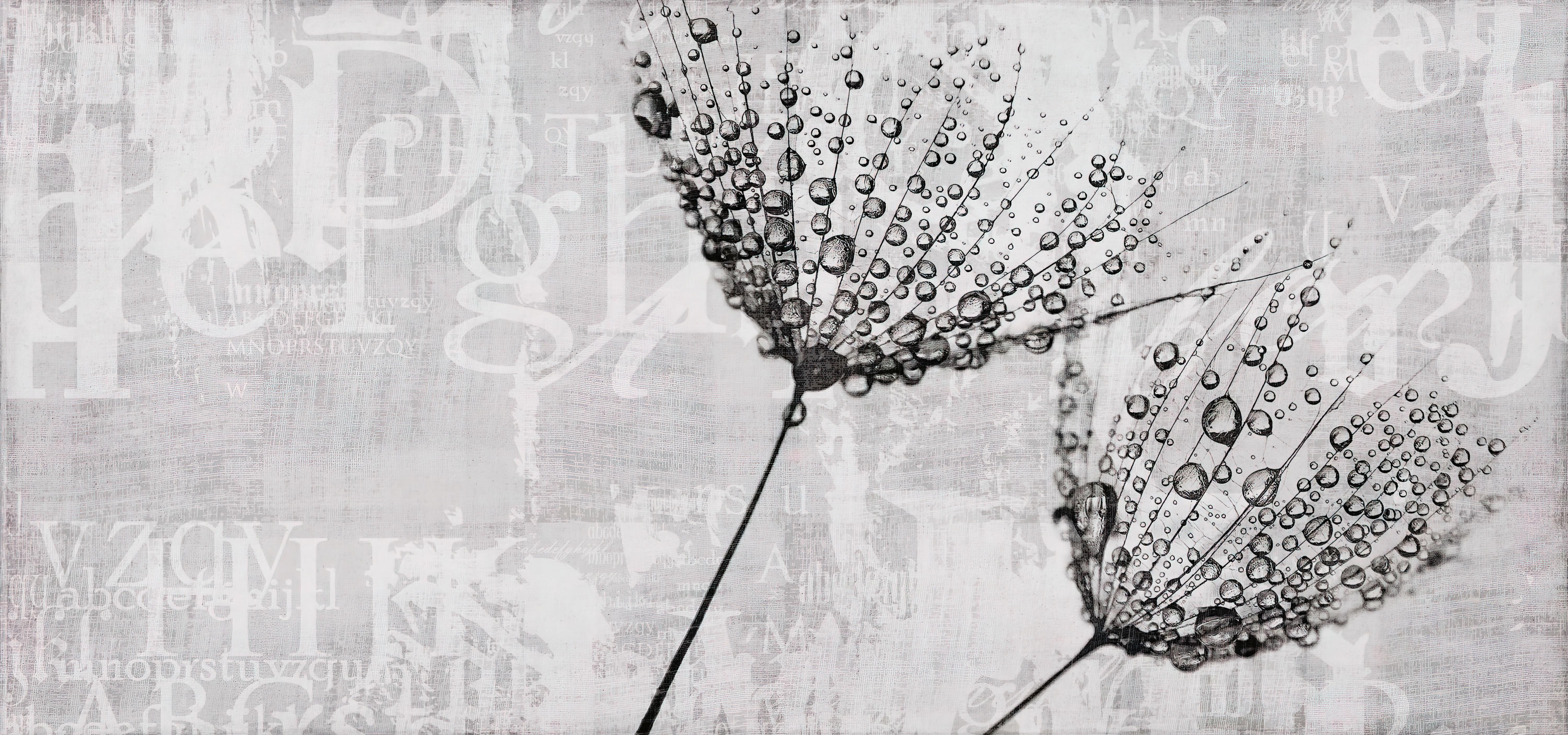 Grayscale dandelion seeds and droplets artistic wallpaper