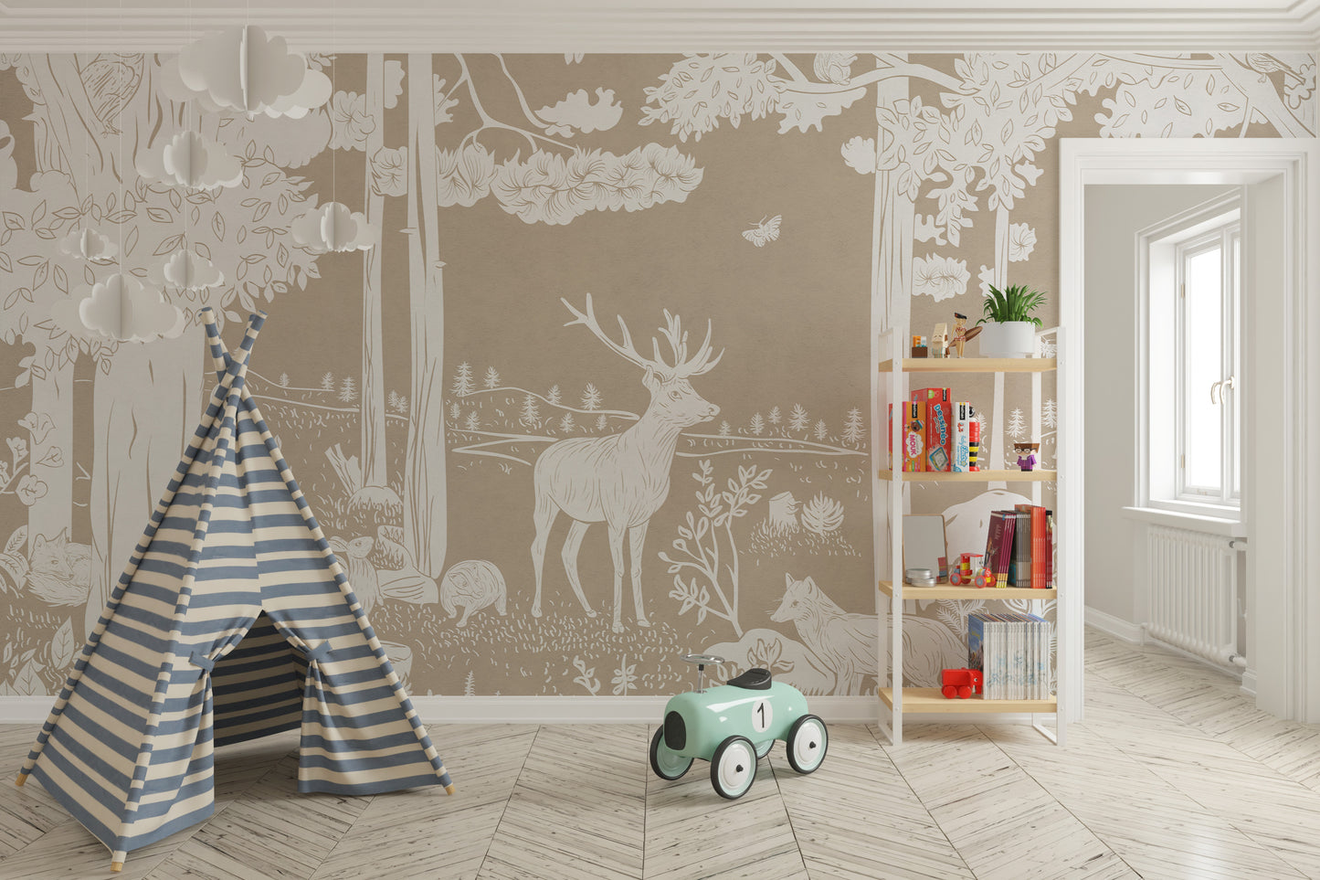 Enhance your nursery with the elegant monochrome forest brown wall mural. This nursery wallpaper depicts a tranquil forest scene, complete with charming woodland animals and lush foliage. The monochrome design in brown tones creates a soothing ambiance, perfect for a restful nursery. The mural is made from durable, high-quality materials, ensuring it stands up to everyday wear and tear. Its versatile design fits well with a variety of nursery themes and decors. Order the Monochrome Forest Brown Wall Mural to bring a unique touch to your nursery. Buy now and enjoy Free Shipping!