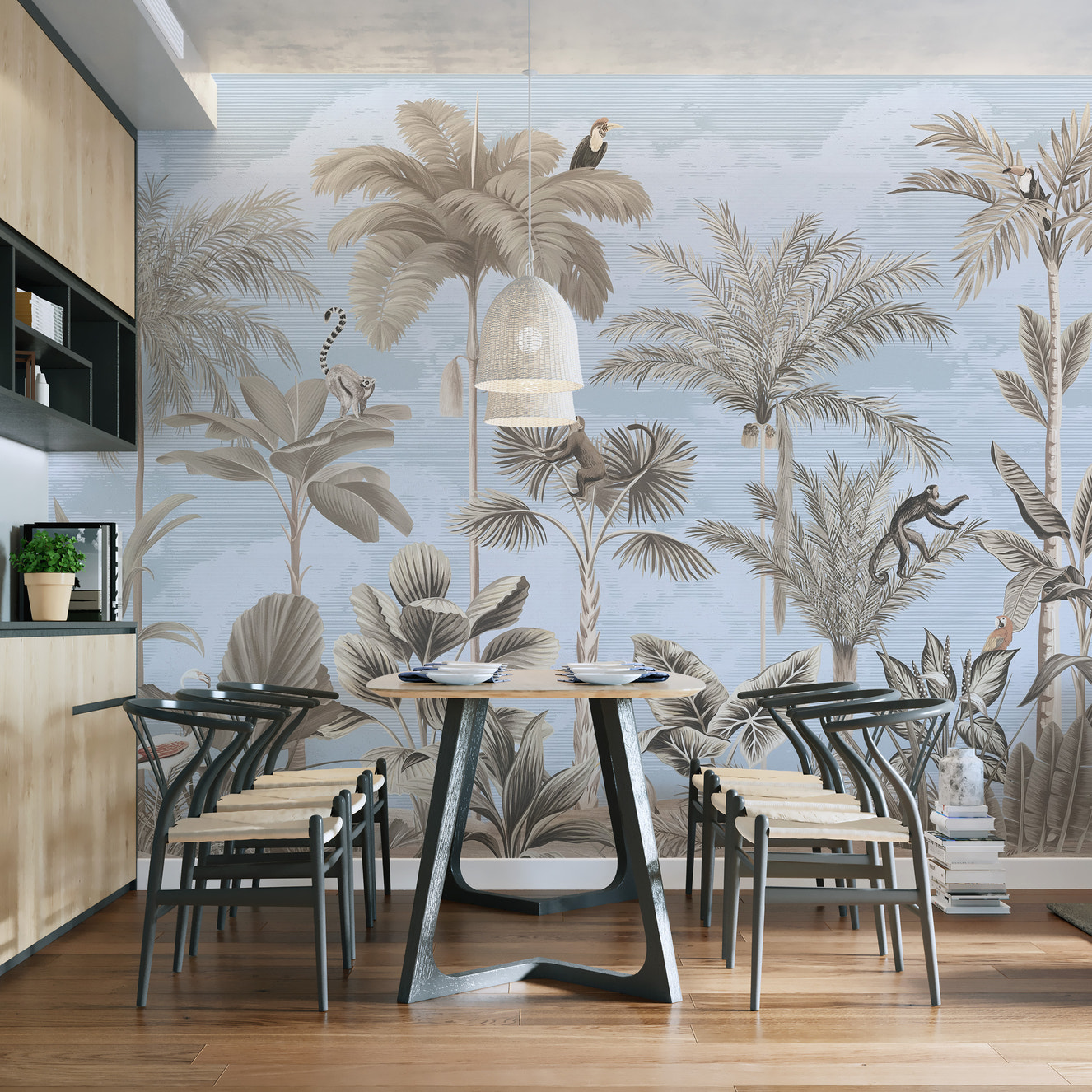 Modern woodland wallpaper mural in grayscale design