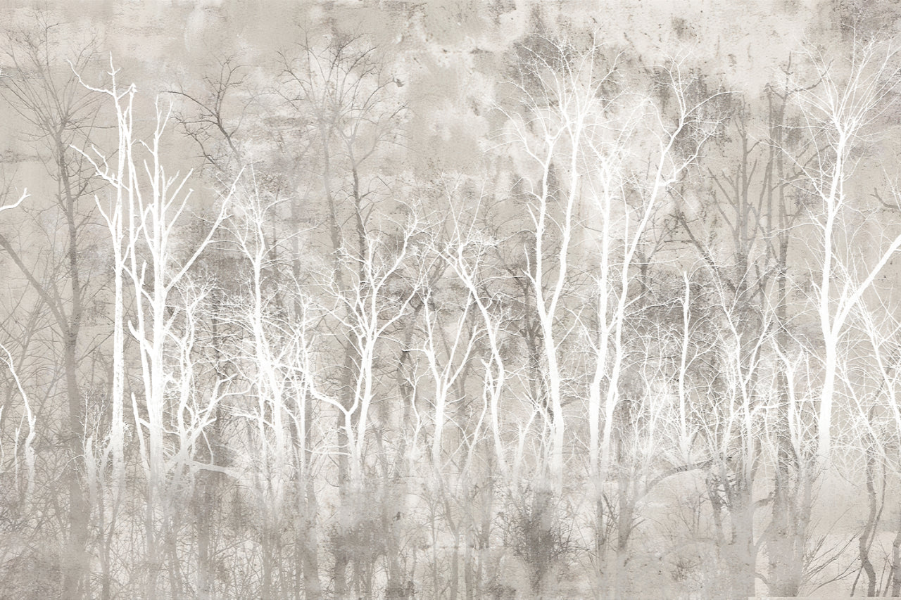 Neutral forest wall mural featuring delicate tree silhouettes