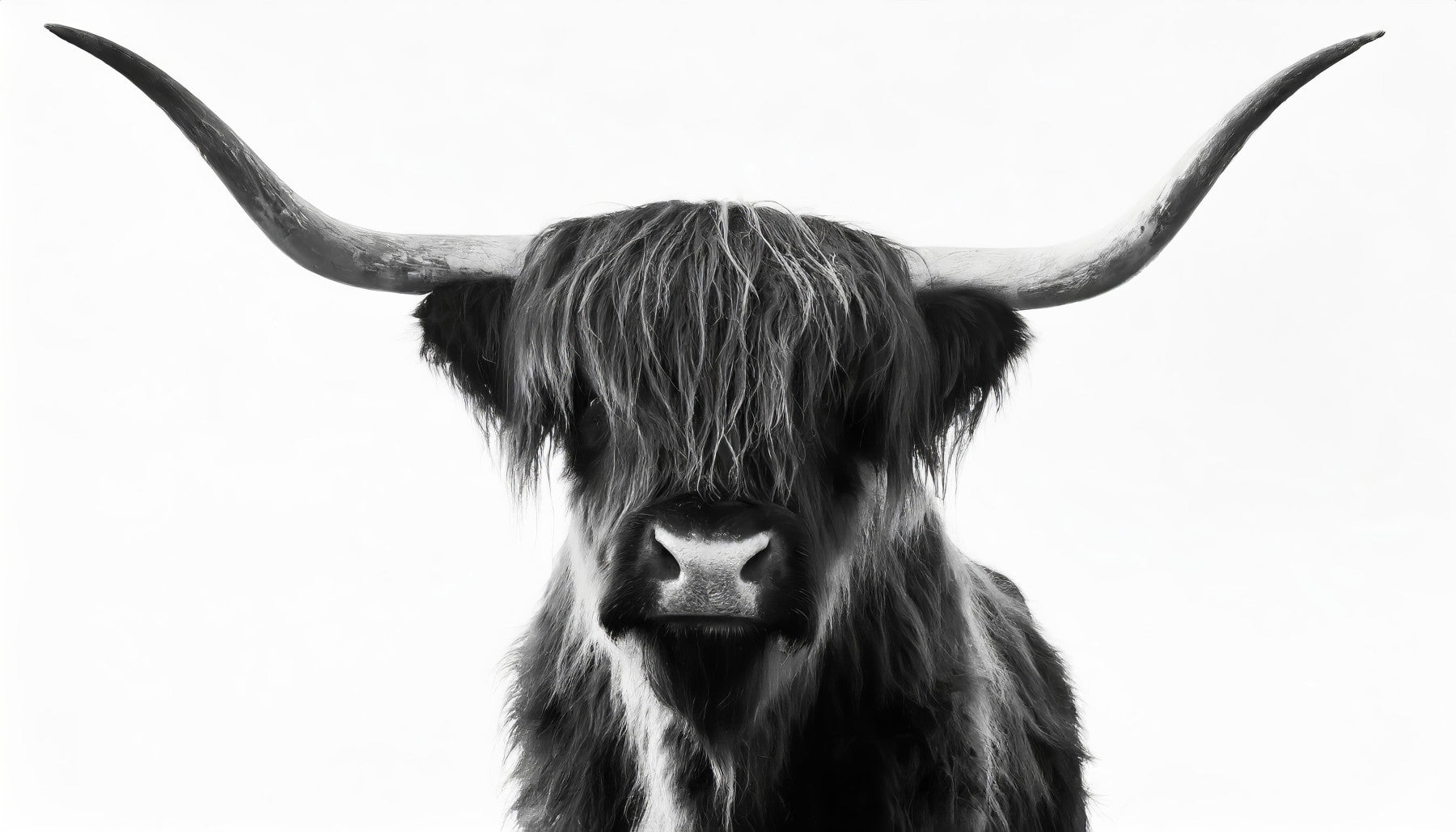A bold and imposing close-up of a Highland cow rendered in striking black and white. The image focuses on the animal's face, highlighting its rugged features and impressive horns. The textured fur creates a sense of depth, while the monochromatic palette lends a timeless quality. This wallpaper is ideal for those seeking a blend of rustic charm and modern aesthetic, perfect for creating a dramatic focal point in any room. Bring a touch of the wild and untamed into your home with this captivating portrait.