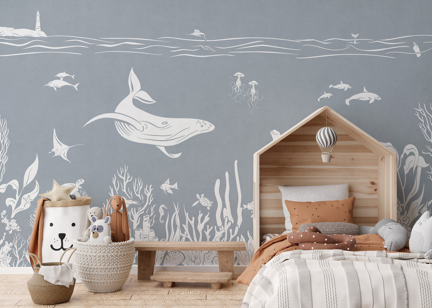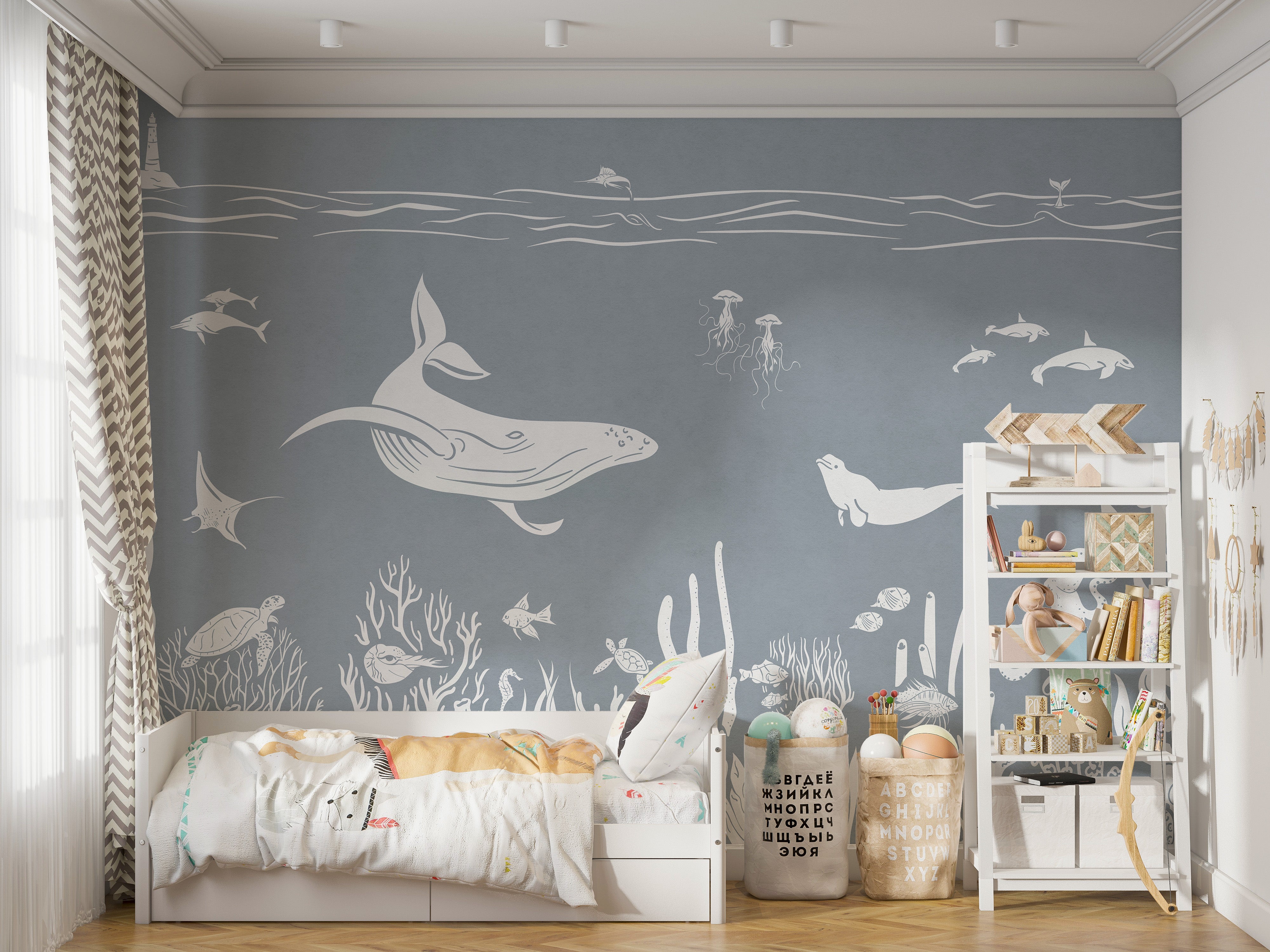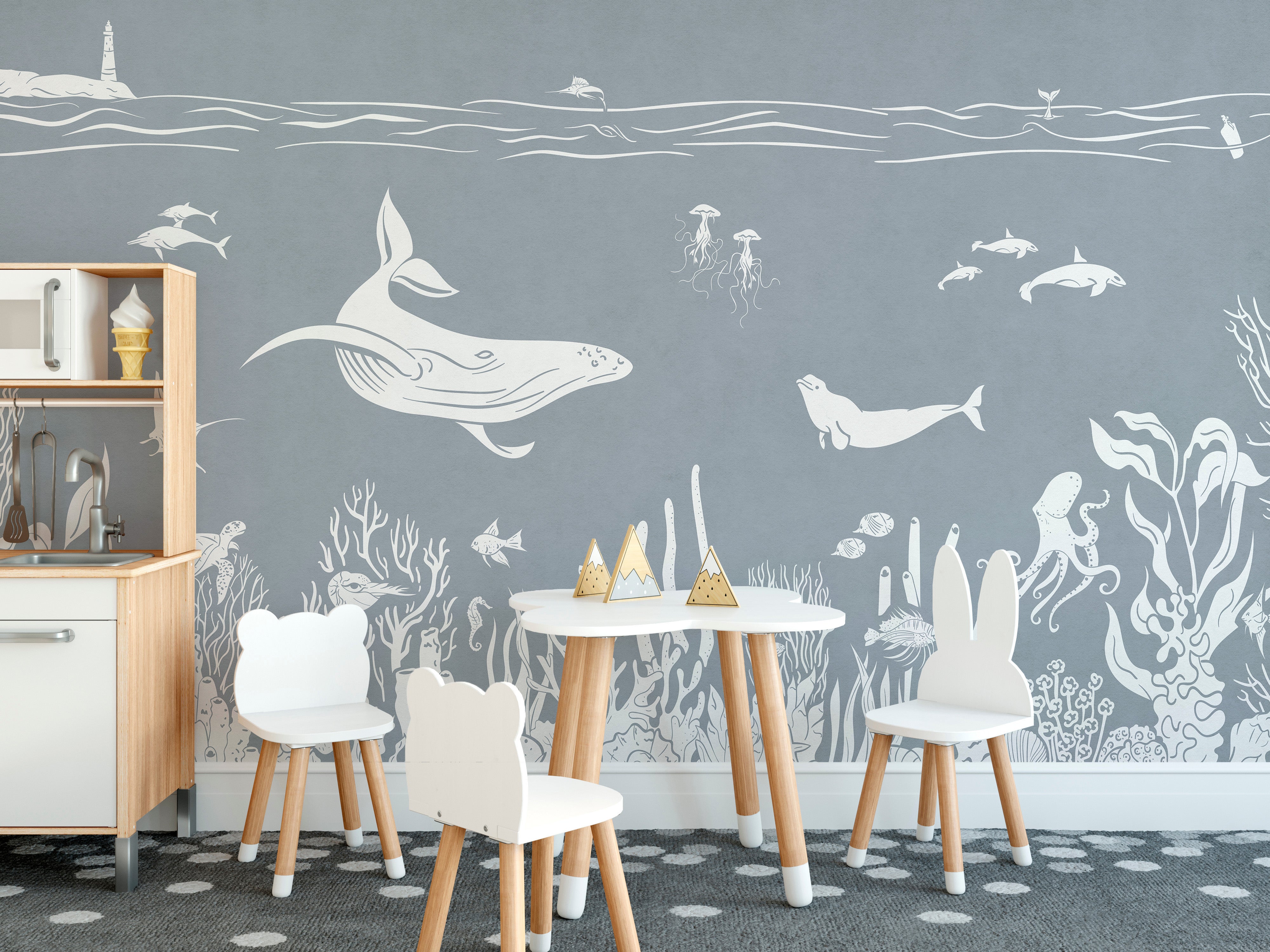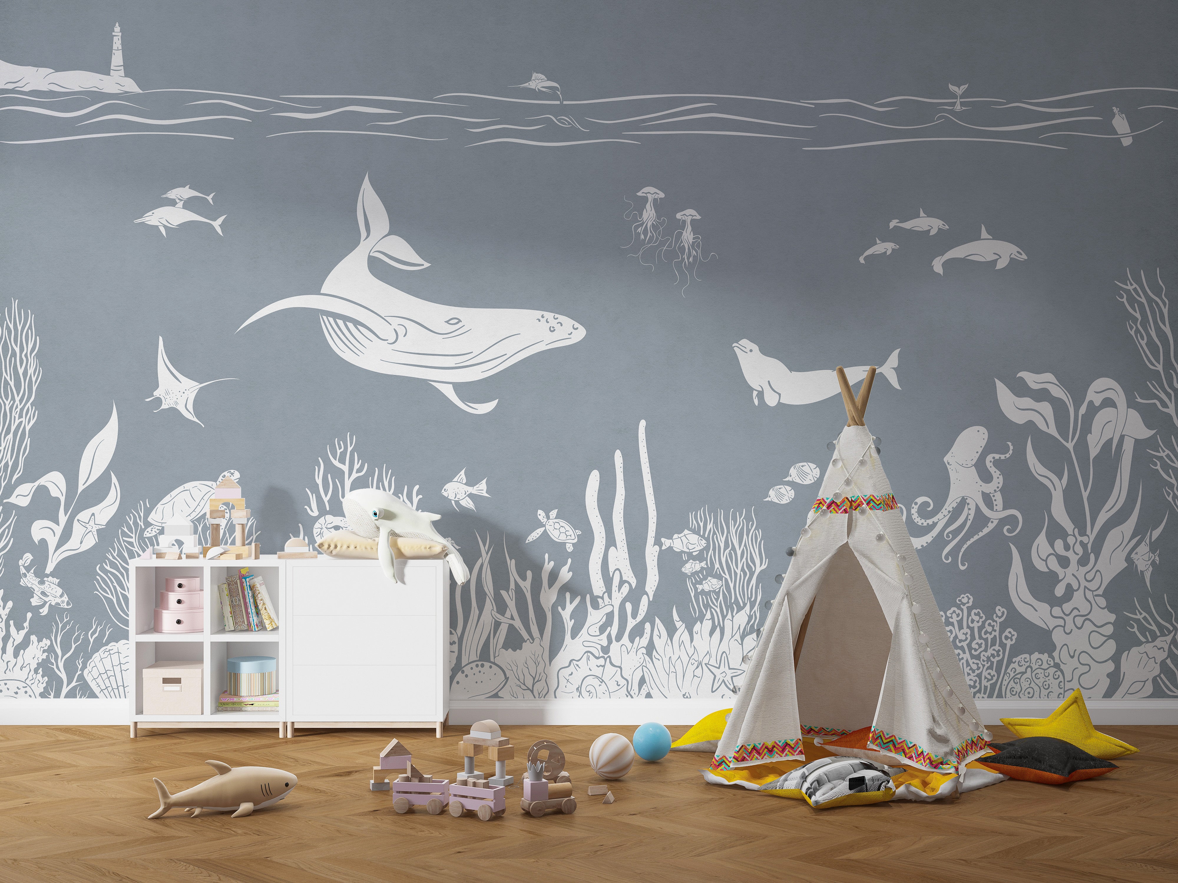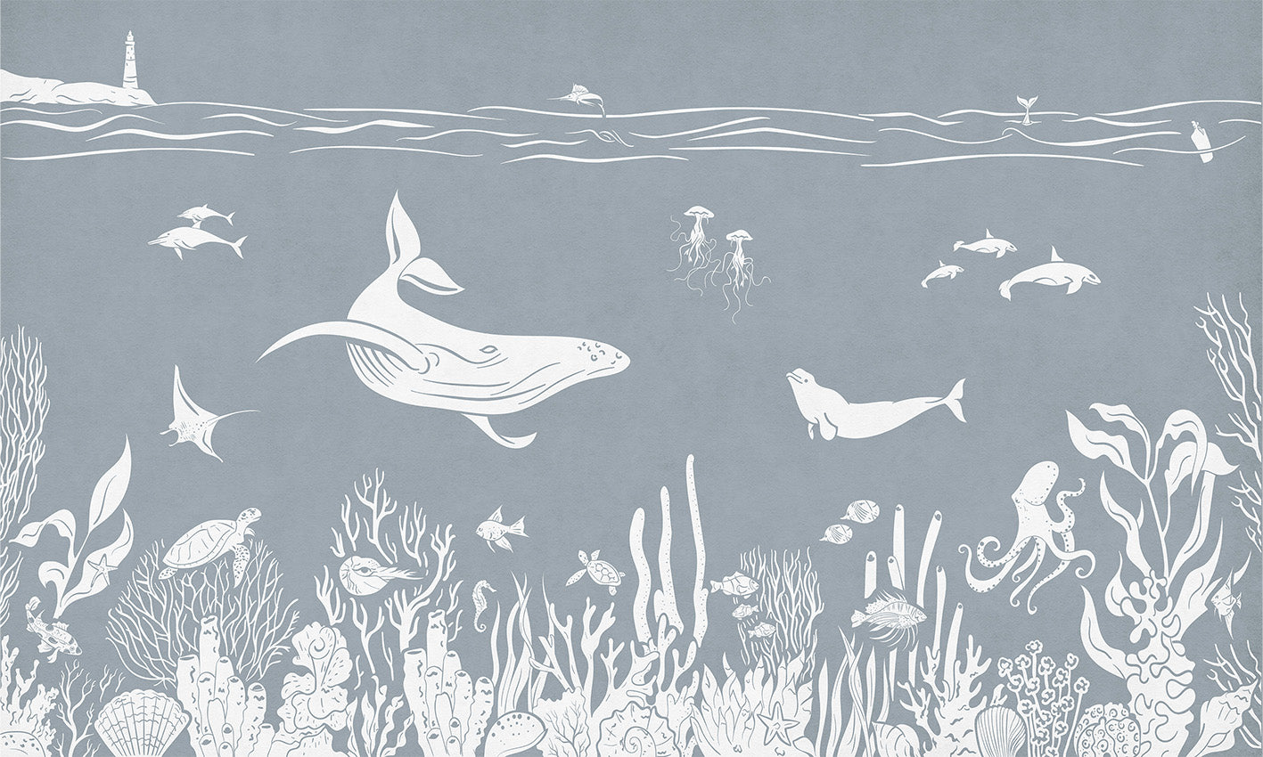 Dive into the enchanting world of marine life with the monochrome sea blue wallpaper mural. This underwater wallpaper mural is designed to bring the beauty and mystery of the ocean right into your home. Featuring detailed illustrations of sea creatures such as whales, jellyfish, and corals, this mural is perfect for creating a serene and unique atmosphere in any room. The high-quality materials used ensure durability and ease of application. Perfect for living rooms, bedrooms, or even bathrooms, the monochrome sea blue wallpaper mural is a must-have for marine enthusiasts. Purchase it now and enjoy the calming and beautiful underwater scene.