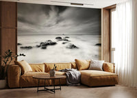 This black and white seascape brings a calming presence to your space. The soft, blurred water contrasts with the solid rocks, creating a sense of tranquility and power. The monochrome palette makes it versatile for a variety of interiors. Use this wallpaper for walls to add depth to a living room or a soothing vibe to a bedroom. The minimalist style pairs well with modern and classic decor alike. It brings a touch of natural beauty indoors.
