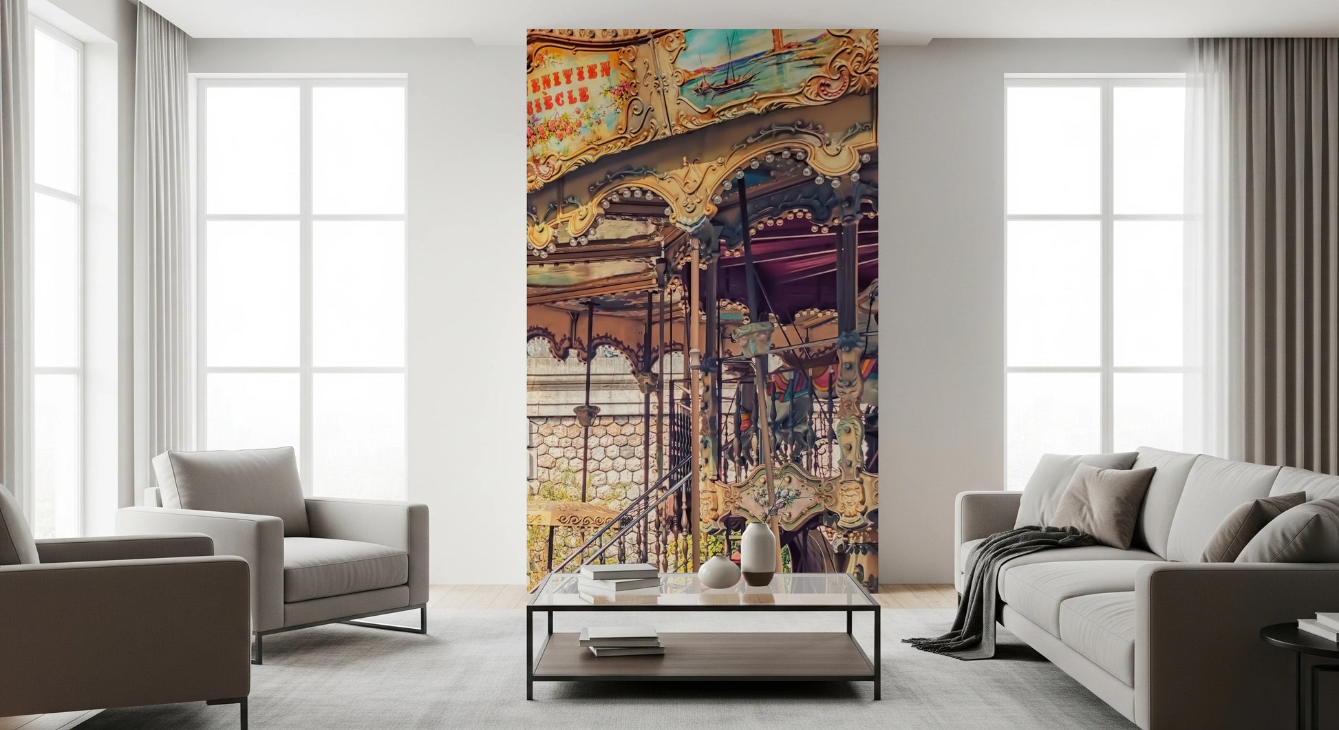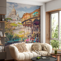 Bring the spirit of Montmartre to your walls with this delightful wallpaper for walls. A beautiful carousel takes centre stage, inviting you to step onto a timeless ride. The Sacré-Cœur Basilica rises majestically in the background, adding a touch of grandeur to the scene. Warm tones of beige and rose with touches of blue harmonise with the surrounding greenery. This mural creates an uplifting and cheerful atmosphere in dining rooms, living rooms, or even hallways. It evokes the feeling of a sunny Parisian day and the joy of simple pleasures.