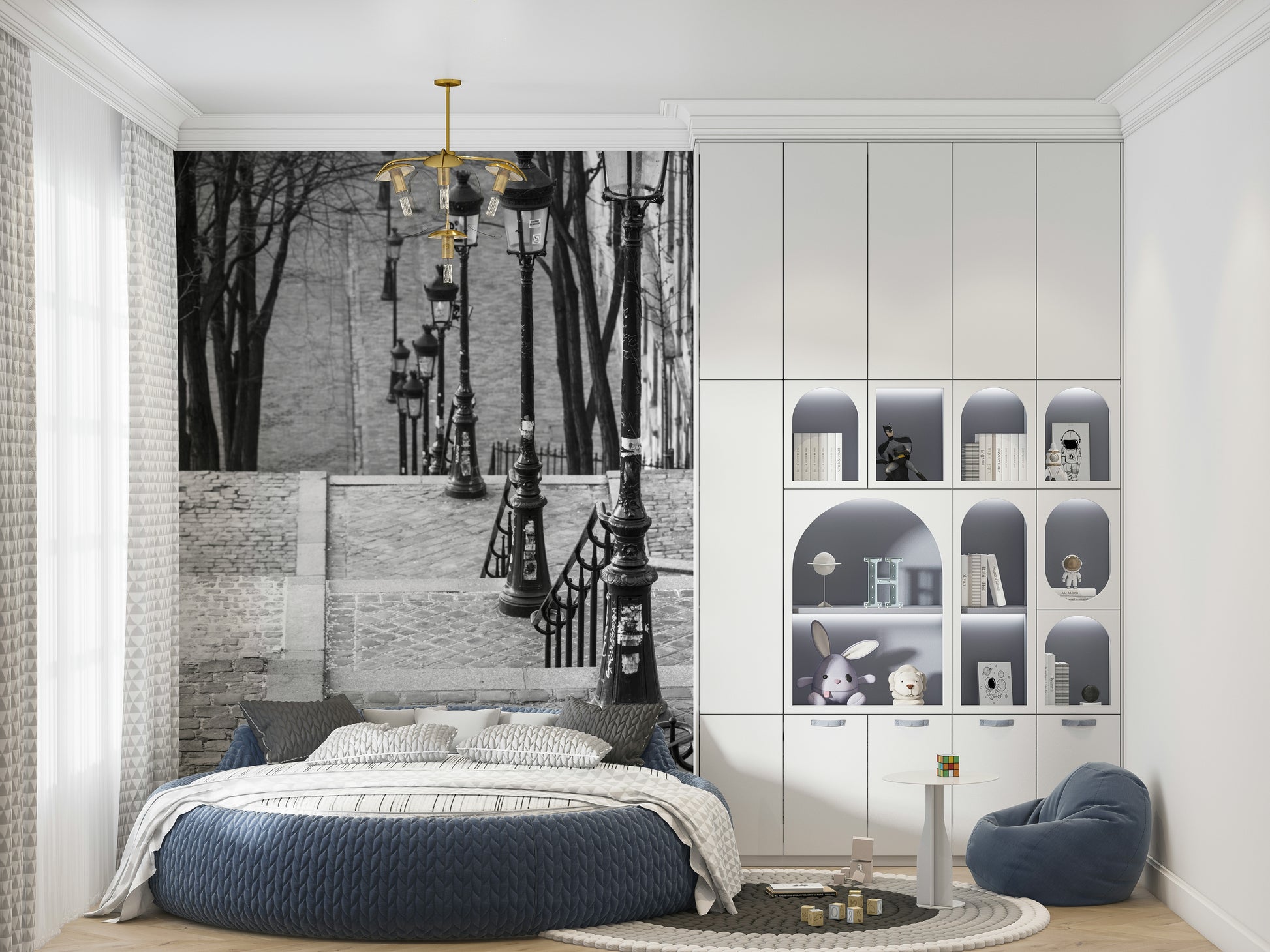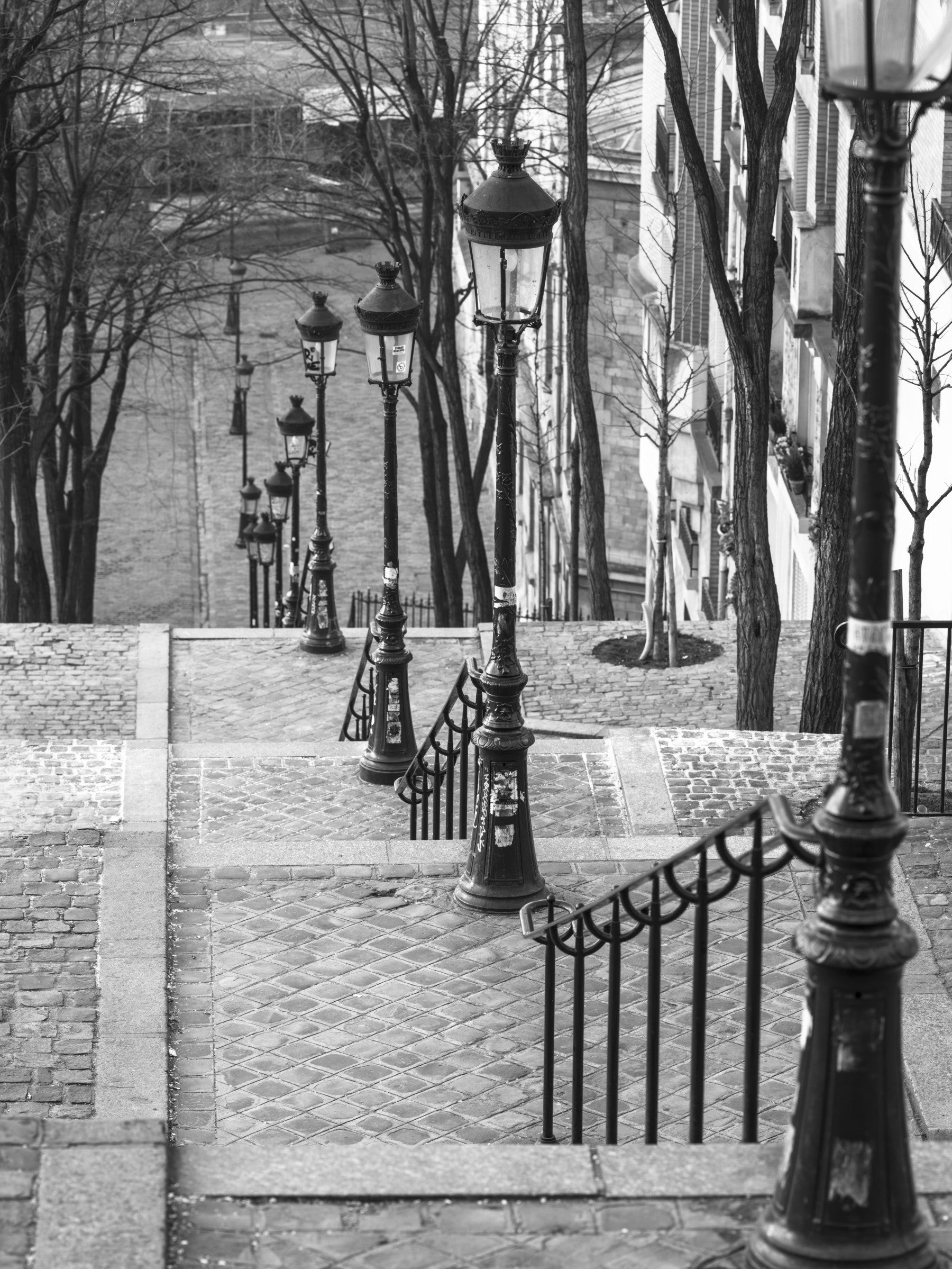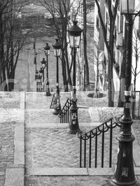 The famous staircase in Montmartre, Paris, France. Evoke the timeless charm of Paris with this evocative wall décor. "Montmartre Steps" captures the essence of this iconic Parisian neighbourhood, showcasing a view down the textured cobblestone steps, flanked by elegant lampposts and slender trees reaching towards the sky. The monochromatic palette lends a classic, sophisticated air, transforming your space with a touch of European elegance. Each detail, from the intricate ironwork of the railings to the weathered texture of the stone, whispers stories of artists, history, and the unique allure of Montmartre. This piece will add architectural interest, a sense of depth, and a touch of Parisian chic to any room. Perfect for creating a focal point, this wall covering will transport you to the heart of bohemian Paris, adding a layer of refined wanderlust to your interior design.