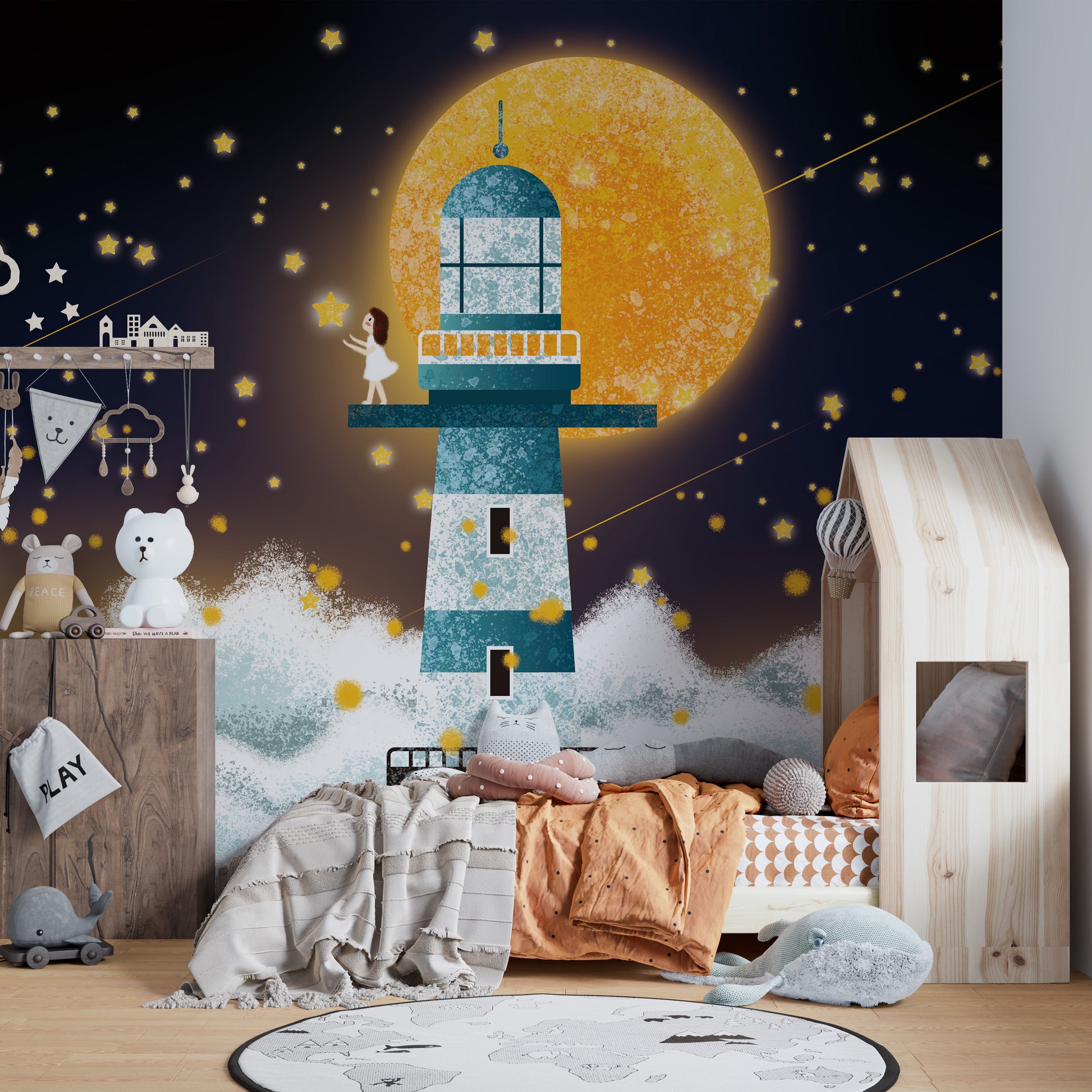 Falling stars moonlight art mural wallpaper is an enchanting choice for children's room decor. This celestial-themed wallpaper features a mesmerizing scene of shimmering stars cascading from a luminous moon, set against a serene night sky. Ideal for creating a peaceful and calming atmosphere in any kid's bedroom, this moon-inspired wallpaper captivates the imagination and brings a touch of the cosmos indoors. Its elegant design not only enhances the room's aesthetic but also fosters a tranquil and soothing environment, perfect for nurturing dreams and creativity. This wallpaper is a beautiful addition for anyone looking to add a celestial charm to their little one's space.