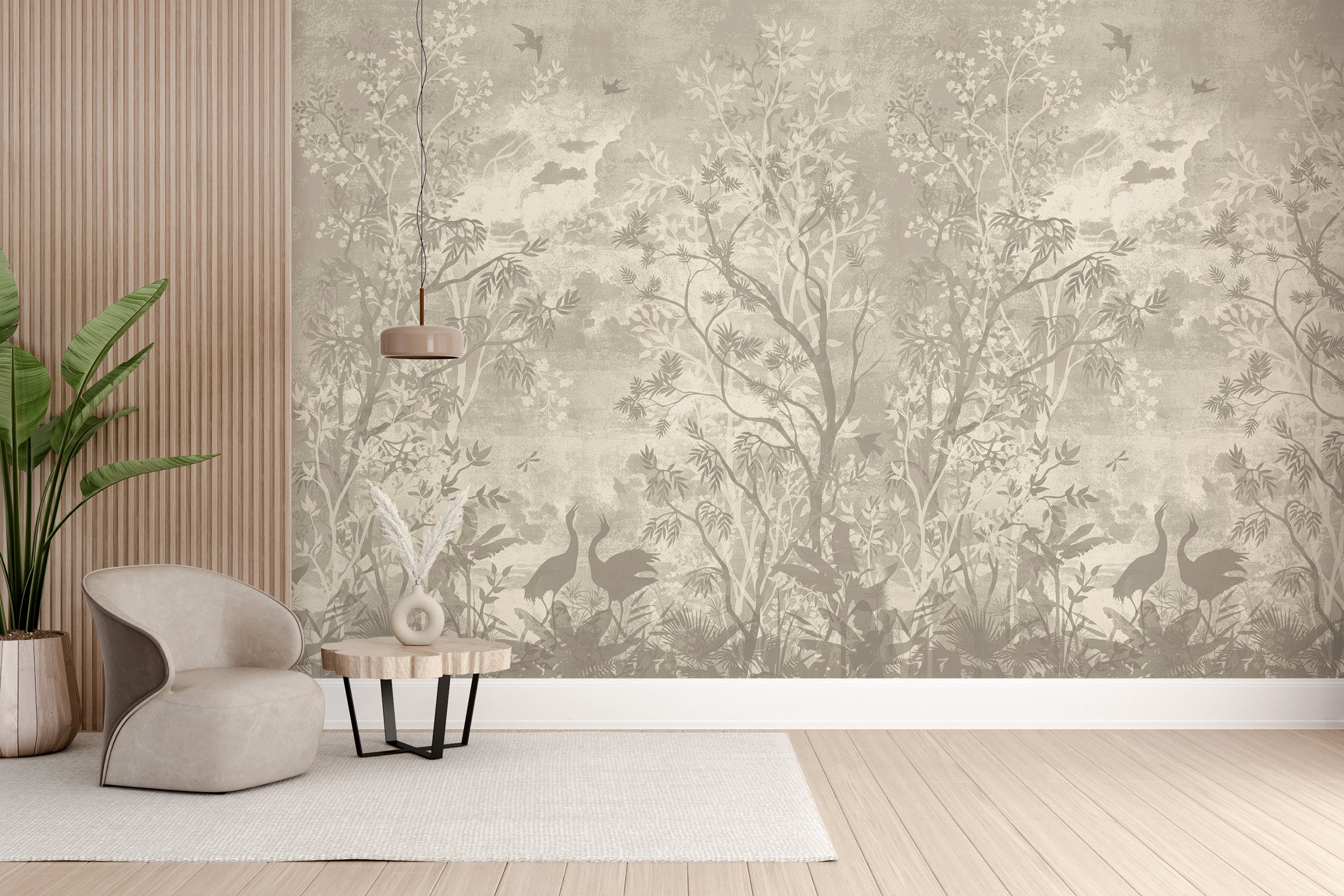 Elegant moonlit aves mural with soft tones