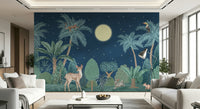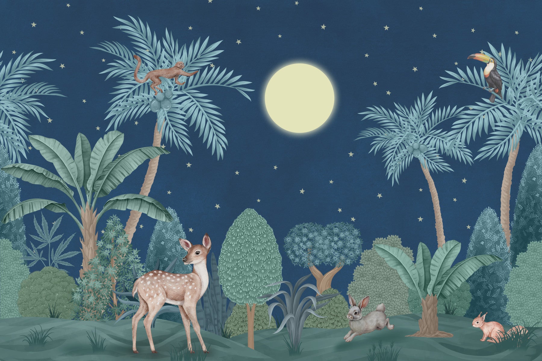 Transform your living space with this enchanting jungle scene. Soft greens and muted browns create a tranquil landscape against a deep blue, star-speckled night sky. This wallpaper for walls brings nature indoors, perfect for creating a serene bedroom or a calming nursery. Imagine a soothing ambiance where friendly animals roam beneath palm trees bathed in moonlight. This design works beautifully as a feature wall, adding depth and a touch of whimsy to any room. Embrace the quiet allure of a moonlit night with this captivating wall décor.