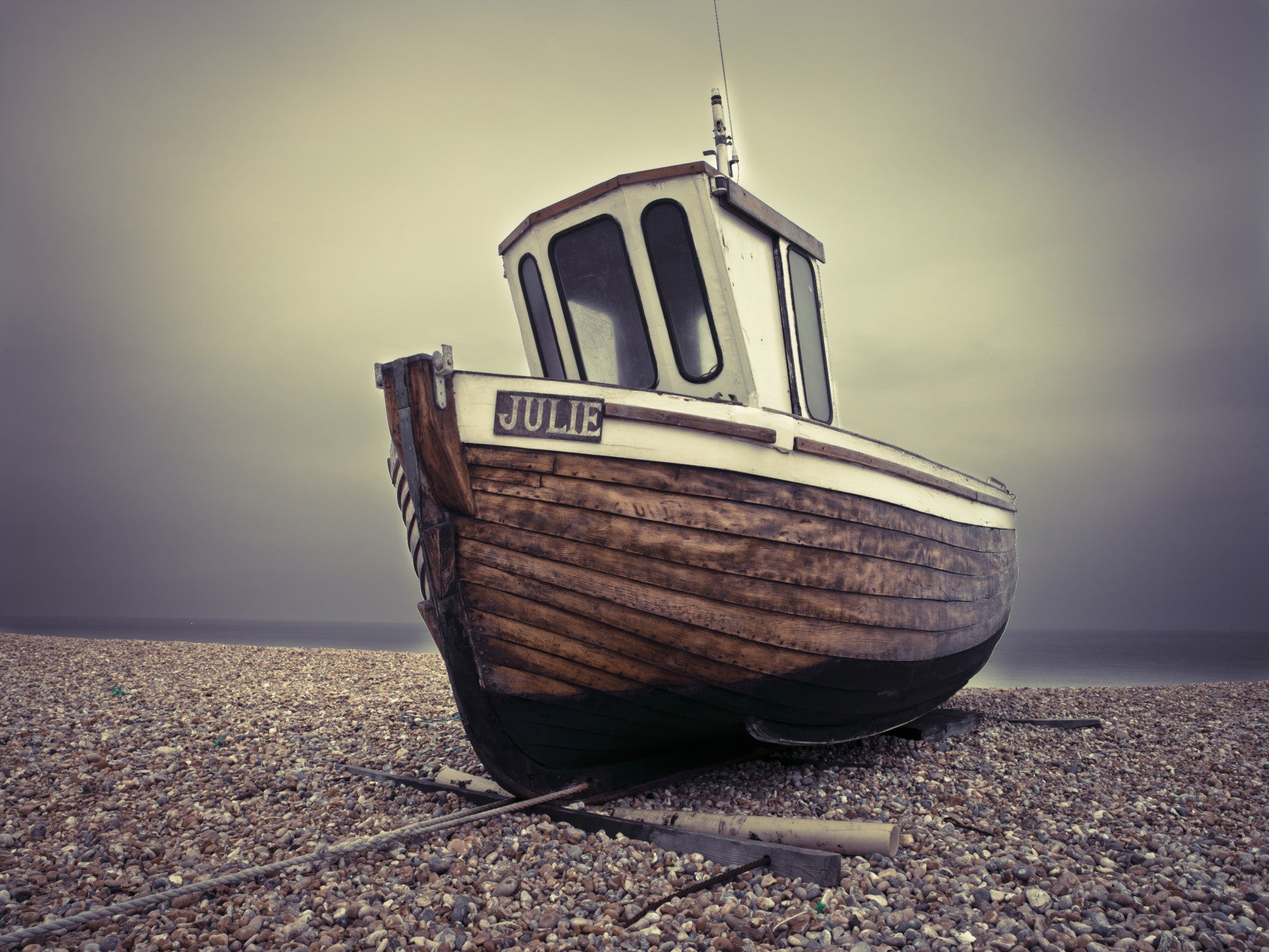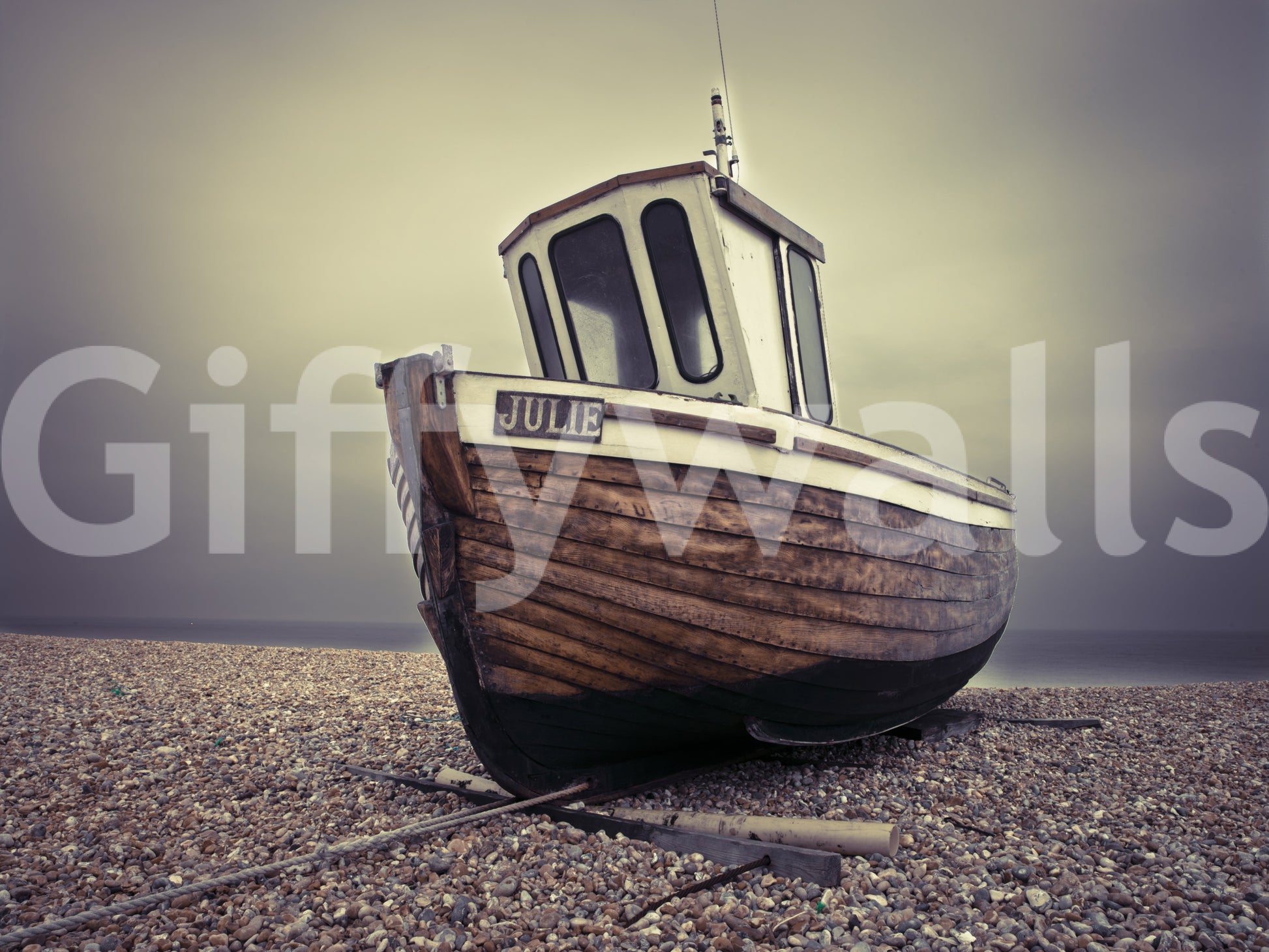 Evoke the serenity of the seaside with “Moored Tranquility,” a wall décor piece that captures the essence of quiet contemplation. This evocative image showcases a weathered fishing boat, named “Julie,” resting peacefully on a pebbled shore. The muted tones of the sky and sea create a soothing backdrop, highlighting the rich textures of the boat's wooden hull.