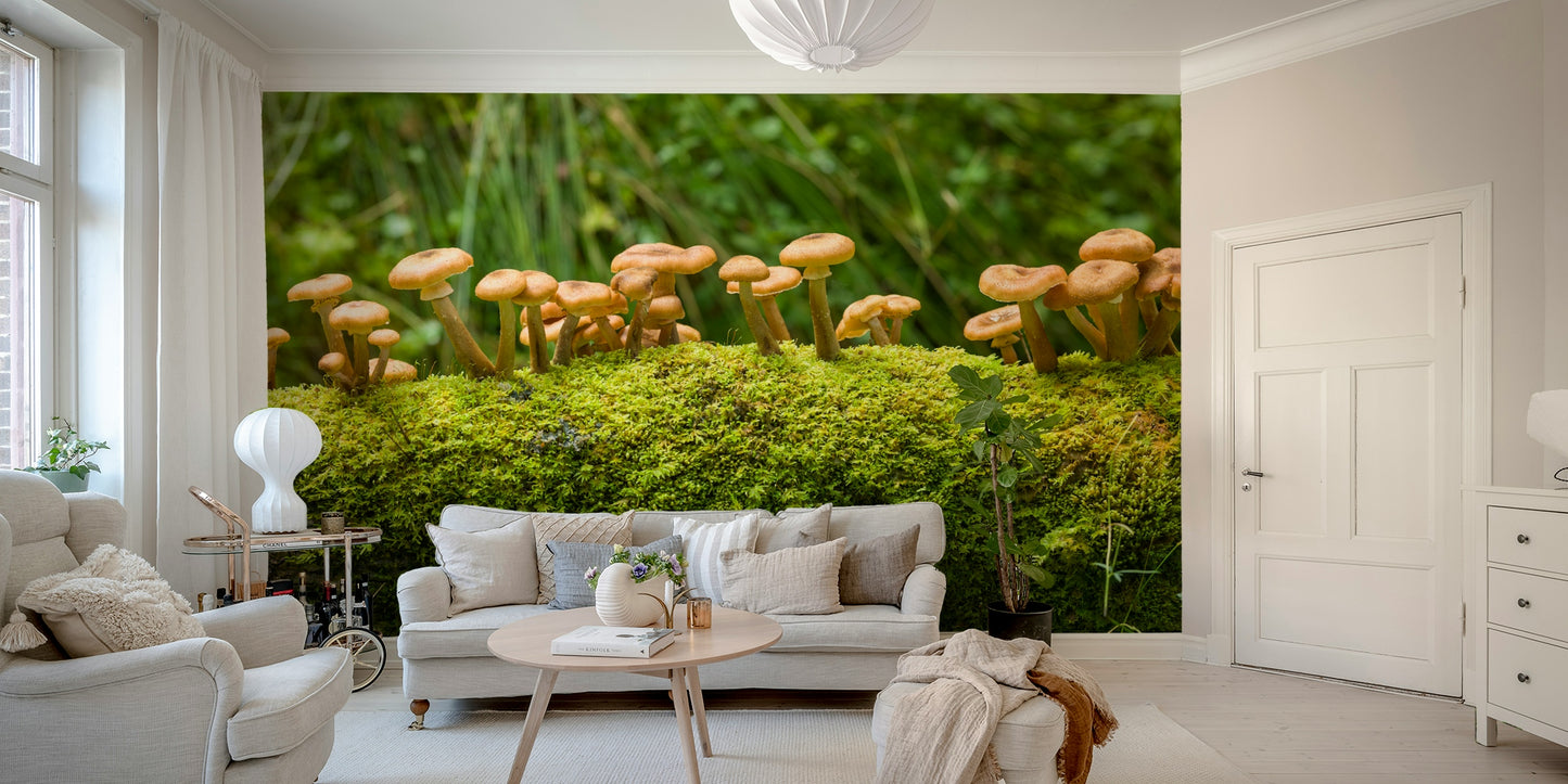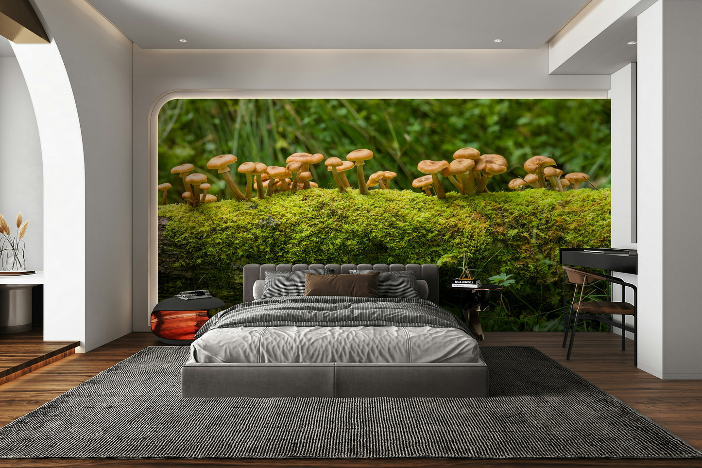 Detailed mossy log mushrooms wall mural for earthy vibes