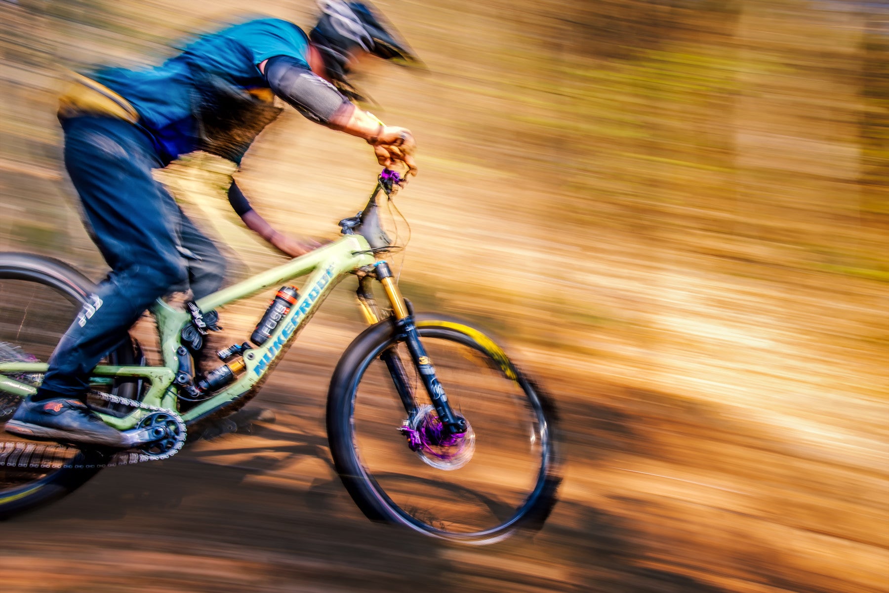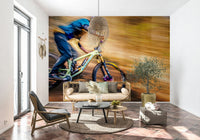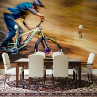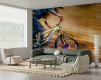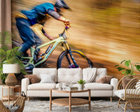 Experience the thrill of speed with this vibrant wallpaper for walls. An action shot captures a mountain biker racing down a golden trail, the motion blur emphasising the rapid pace. Earthy tones dominate, creating a warm, energetic backdrop. It introduces movement and excitement to a home office, teen room, or even a dynamic living space. The linear blur guides the eye, lengthening the room and making it appear more spacious.