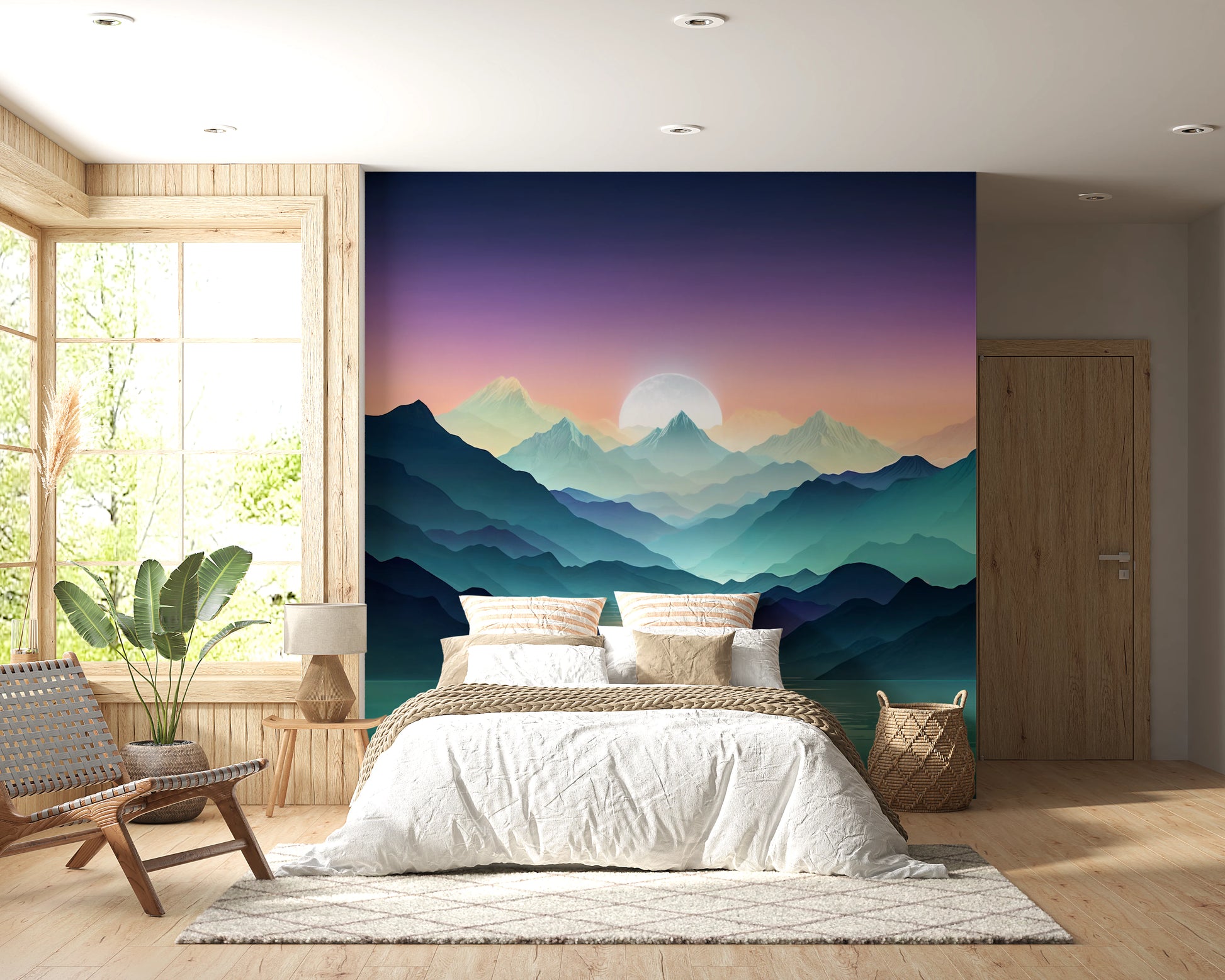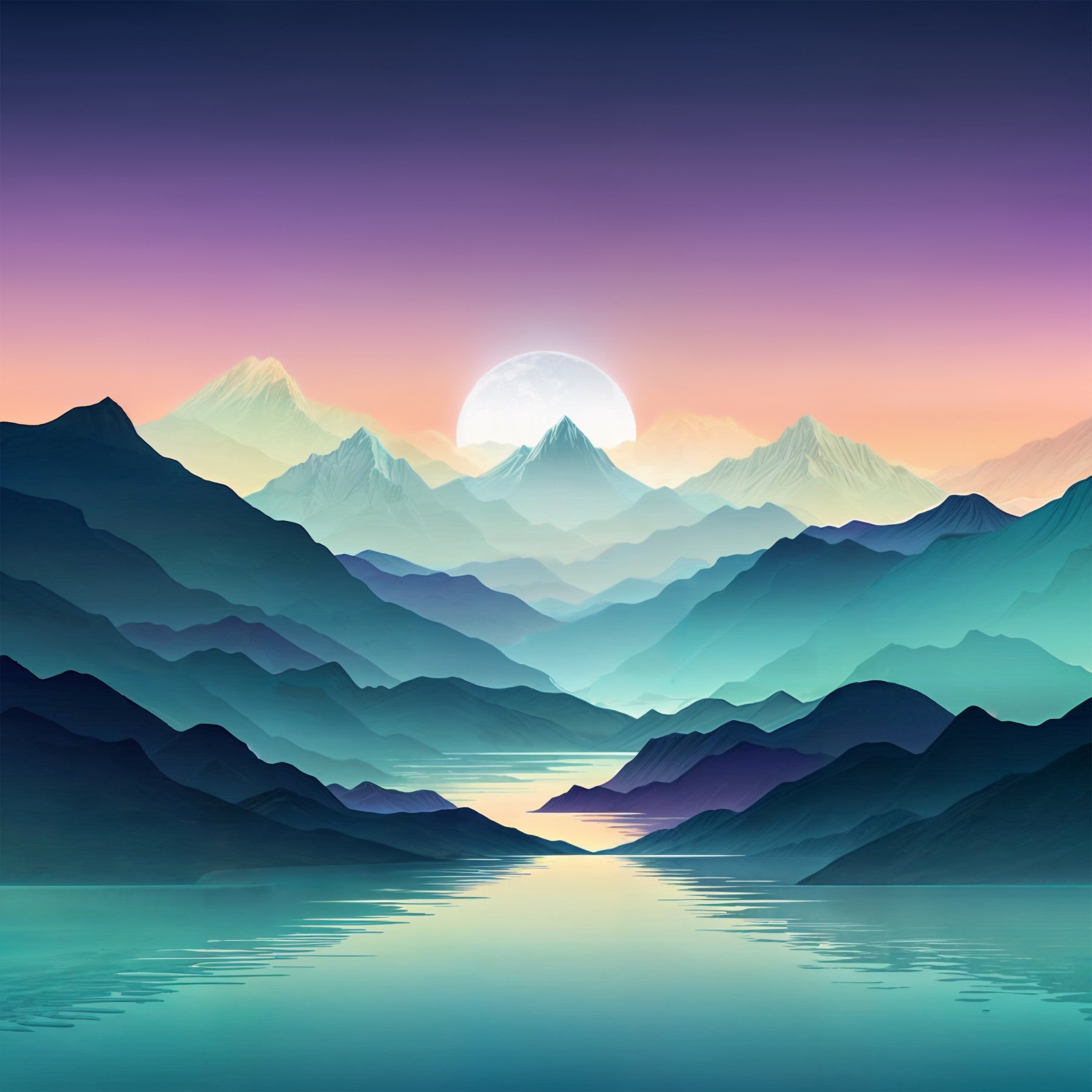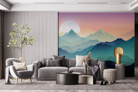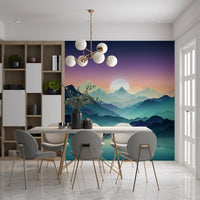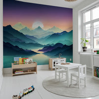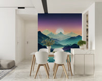 Transform your living space with Mountain Serenity, a visually calming wallpaper for walls. This design presents a serene mountain landscape, complete with an ethereal lake reflecting the pastel sky. The colour palette blends purples, blues, and greens in an ombré effect, creating a tranquil atmosphere. Perfect for bedrooms, living rooms, or meditation spaces, this wallpaper enhances natural light and complements minimalist or modern decor. Enjoy a peaceful sanctuary with this stylish and soothing design.