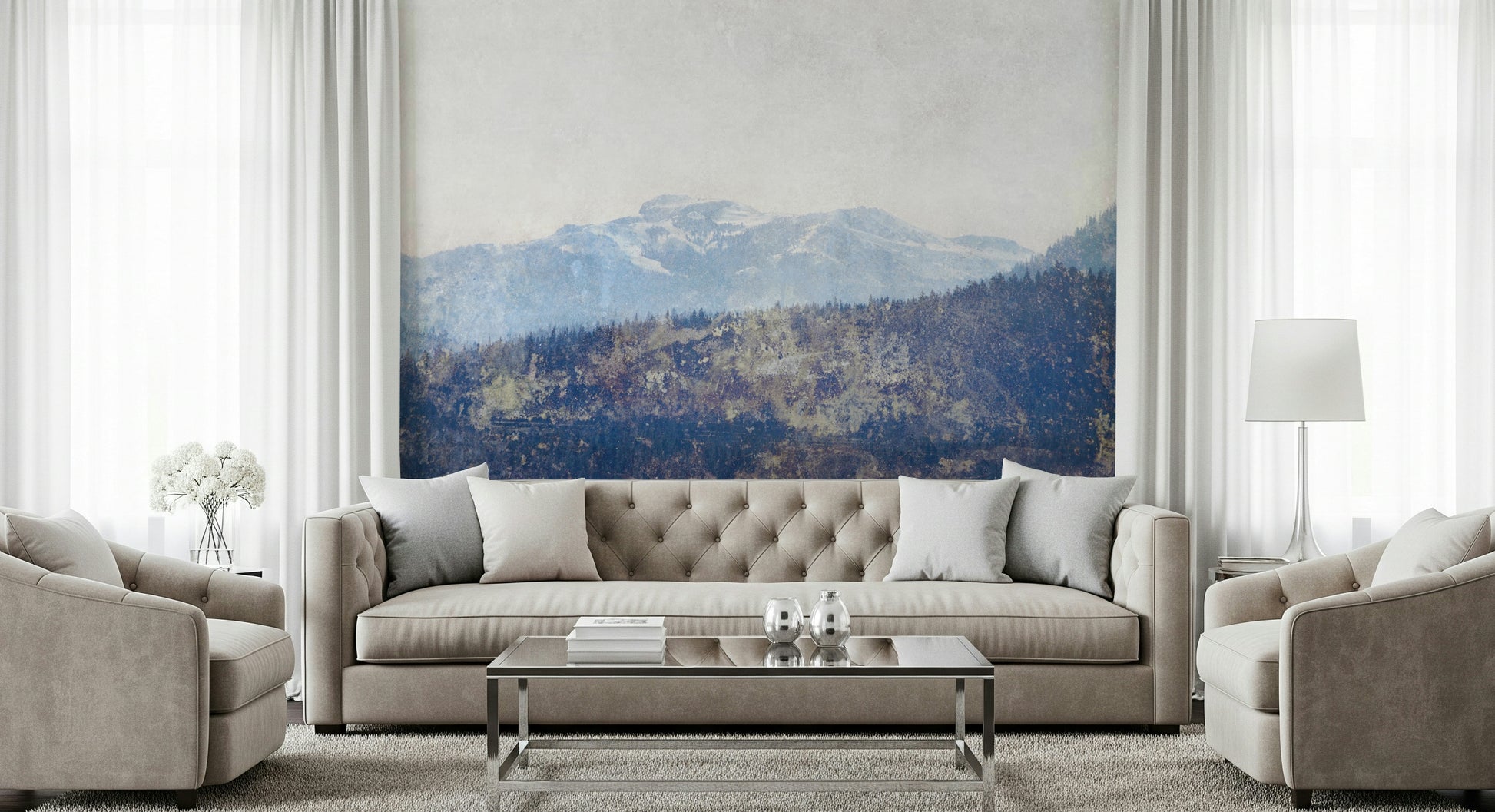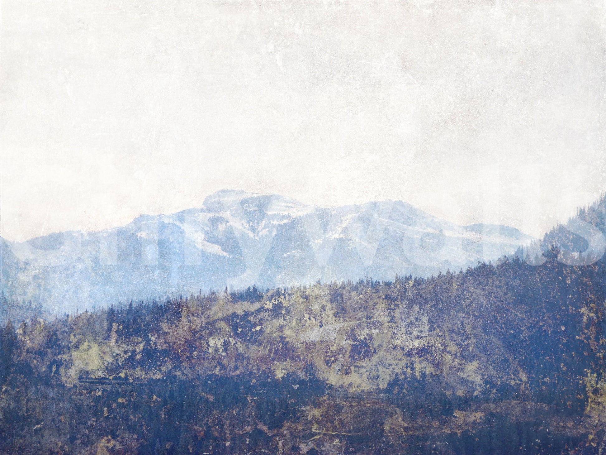 Evoke a serene, scenic mood with this textured mountain vista wallpaper. The design features an artistic rendering of snow-capped mountains and a dense forest, rendered in soft blues, greys and whites. The textured effect adds depth and visual interest. This wallpaper for walls transforms living rooms, bedrooms, or hallways into tranquil escapes. Enhance your decor; it provides a calming focus for any space.
