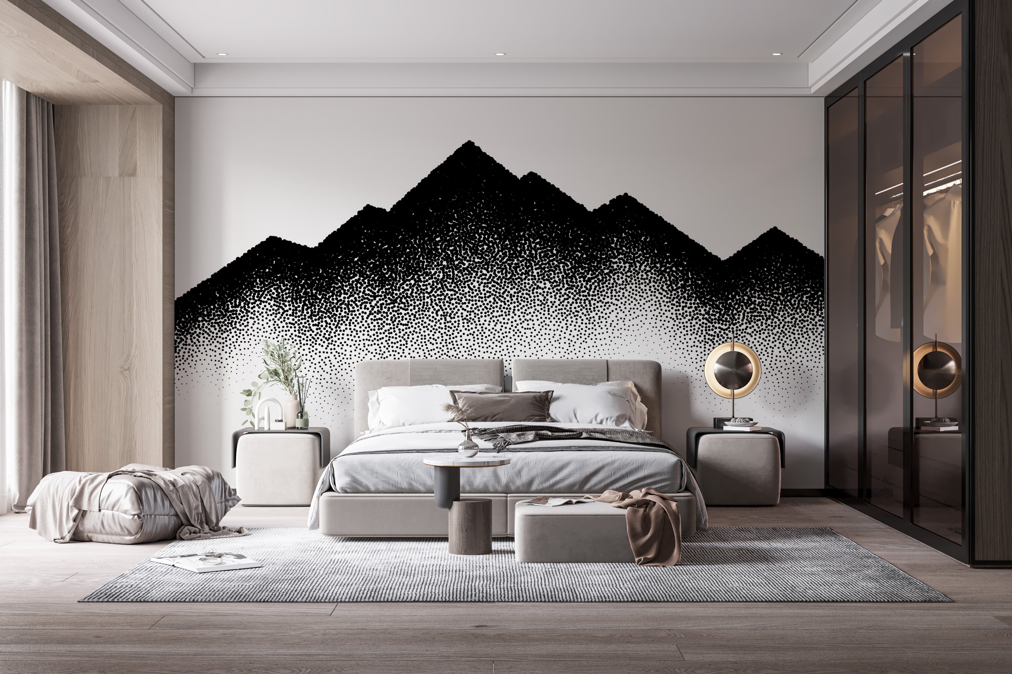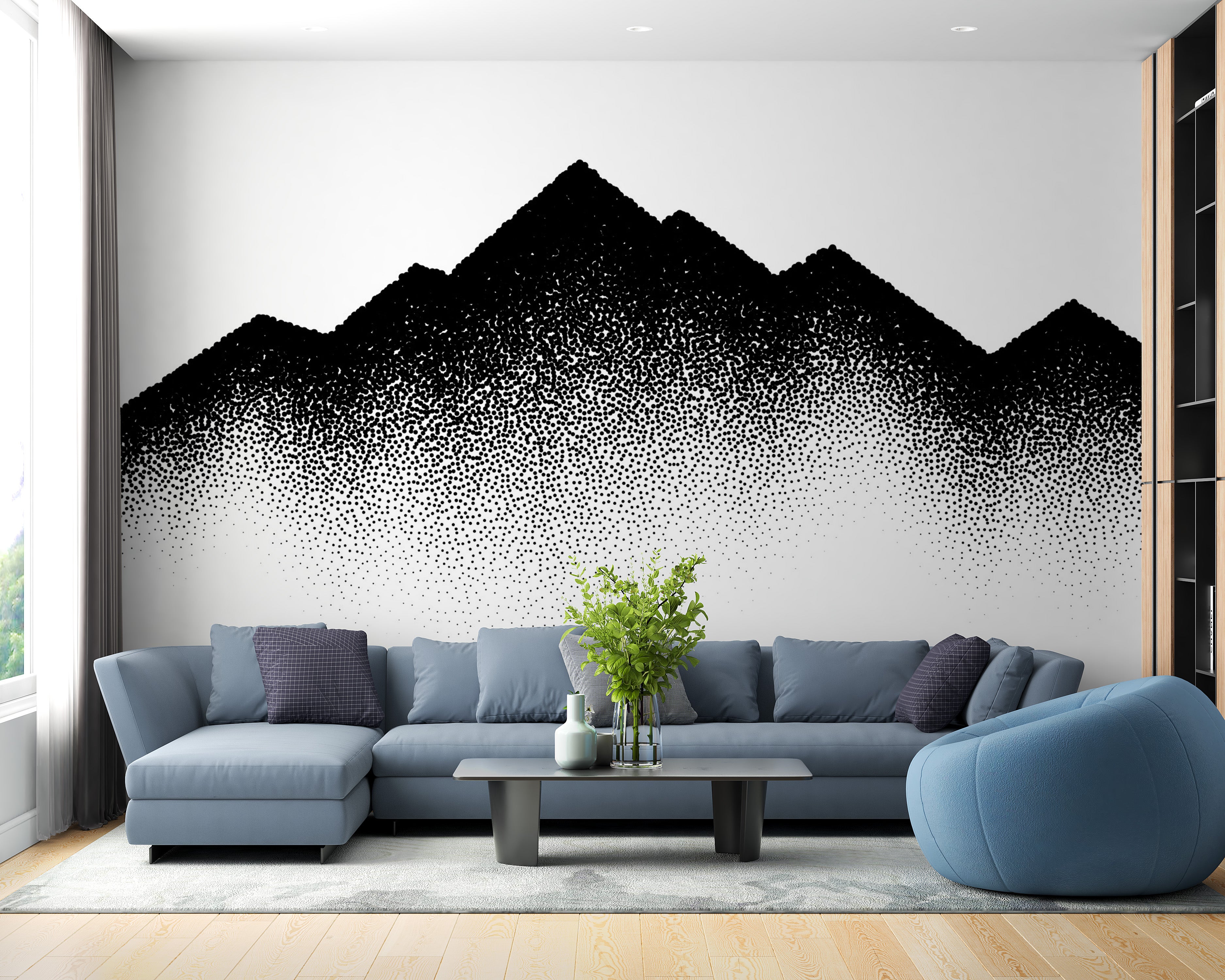 The black mountains and wave of dots mural wallpaper is an eye-catching design that marries the majesty of mountain silhouettes with a unique, cascading dot pattern. The bold contrast and minimalist approach create an aesthetic that is both modern and timeless, suitable for a living room wallpaper. It's a piece that not only serves as a backdrop but also as a conversation starter, with its abstract interpretation of nature. The mountain wallpaper segment stands tall, embodying strength and stability, while the flowing dots add a dynamic and artistic twist. Perfect for those who appreciate the beauty of natural landscapes and the elegance of minimalist art, this wallpaper promises to be a standout feature in any home decor.