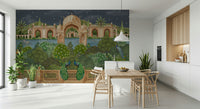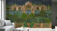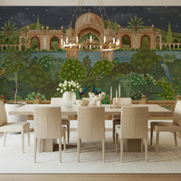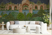 Bathe your walls in the serene grandeur of "Mughal Moonlight," a captivating composition that evokes the romance and opulence of a bygone era. Imagine yourself transported to the heart of a royal Mughal garden, where intricate architectural details meet lush natural beauty under a starlit sky. The design showcases a majestic palace reflected in tranquil waters, framed by verdant foliage teeming with peacocks and subtle hints of golden monkeys. Delicate arches and domes are bathed in a soft, ethereal glow, creating a sense of timeless elegance and peaceful contemplation. This wall décor piece promises to infuse your space with a sense of regal charm and understated luxury. The rich colour palette and intricate details create a visual feast, transforming any room into a sanctuary of beauty and tranquility. Let "Mughal Moonlight" be the centrepiece that elevates your home with its unique blend of historical inspiration and artistic finesse.