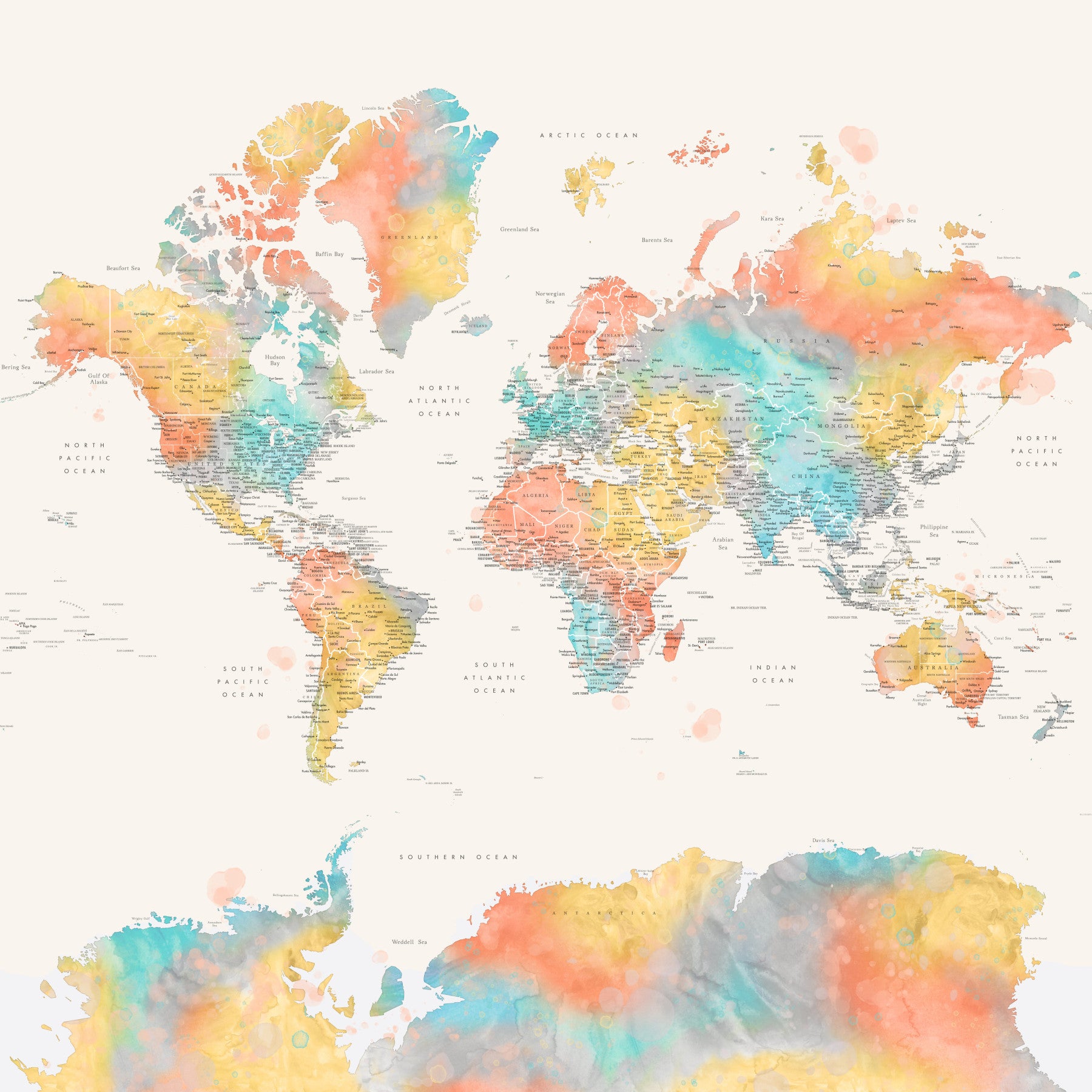 Bright world map in blended multicolor watercolor hues