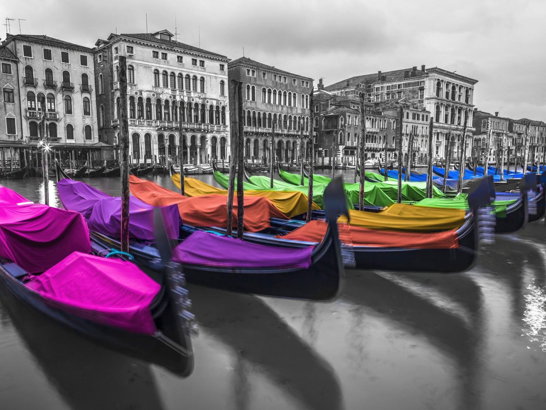Detailed mural of Venice’s iconic gondolas in bold colors