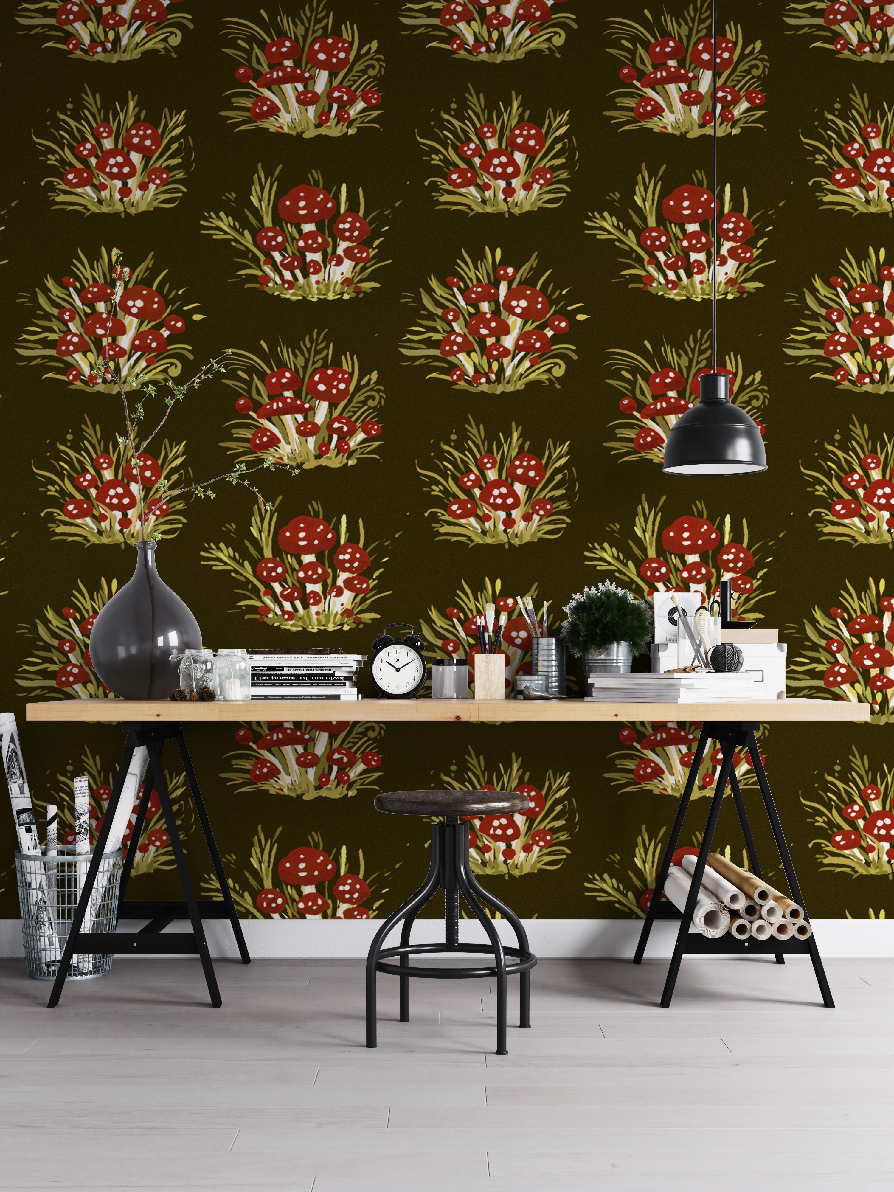 Mushroom Millefleurs Dark Wallpaper, Ideal for Nature-Inspired Spaces The dark background and the lonely clusters of mushrooms really make for an alluring, retro feel! The Millefleurs design adds a touch of class, making it suitable for use in every room throughout your house. This Wallpaper will be the perfect gentle warmth that your living room, bedroom or study needs. Order today and enjoy Free Shipping, Let a little of the enchanted forest into your home.