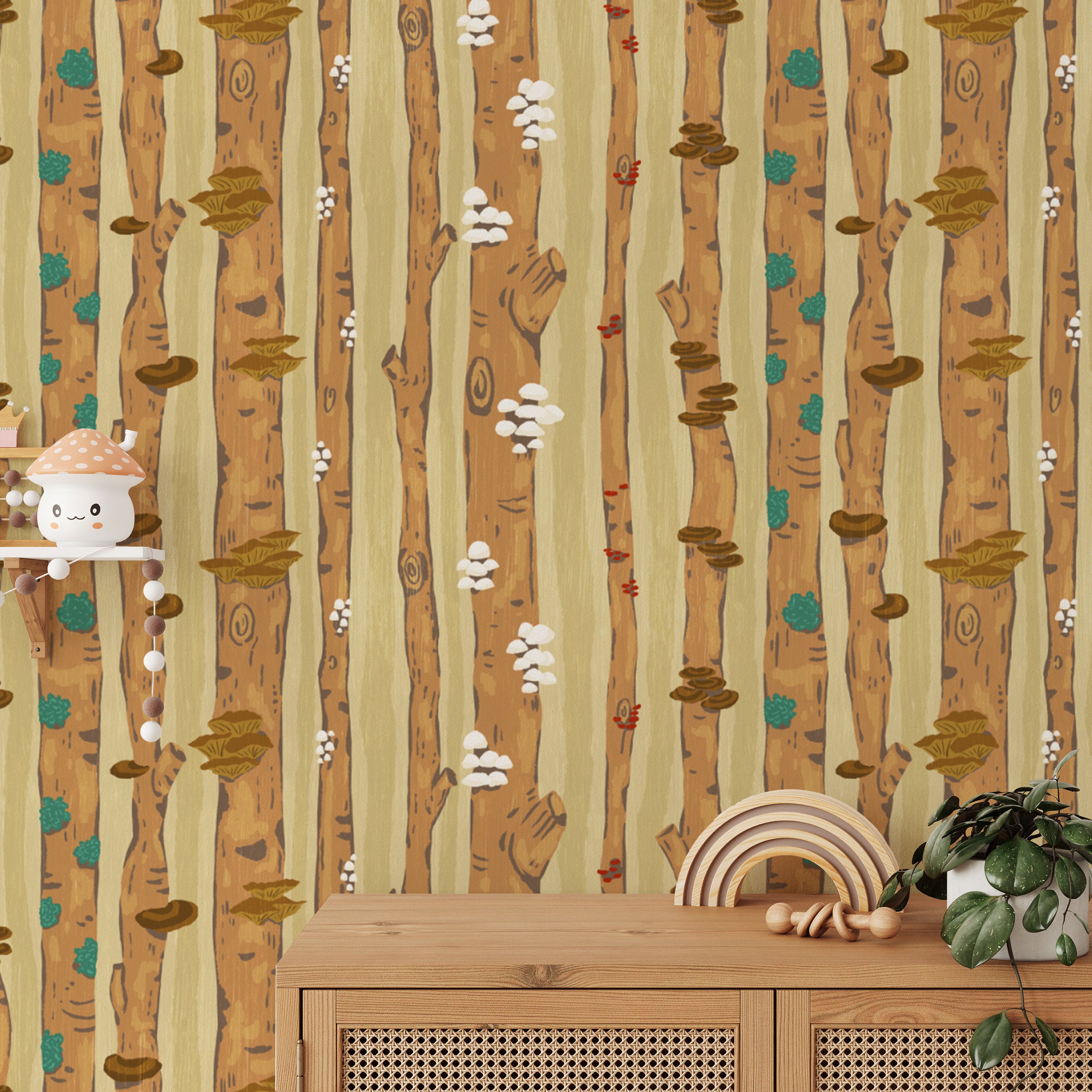 Nature-inspired mushroom tree trunk wallpaper for serene decor.
