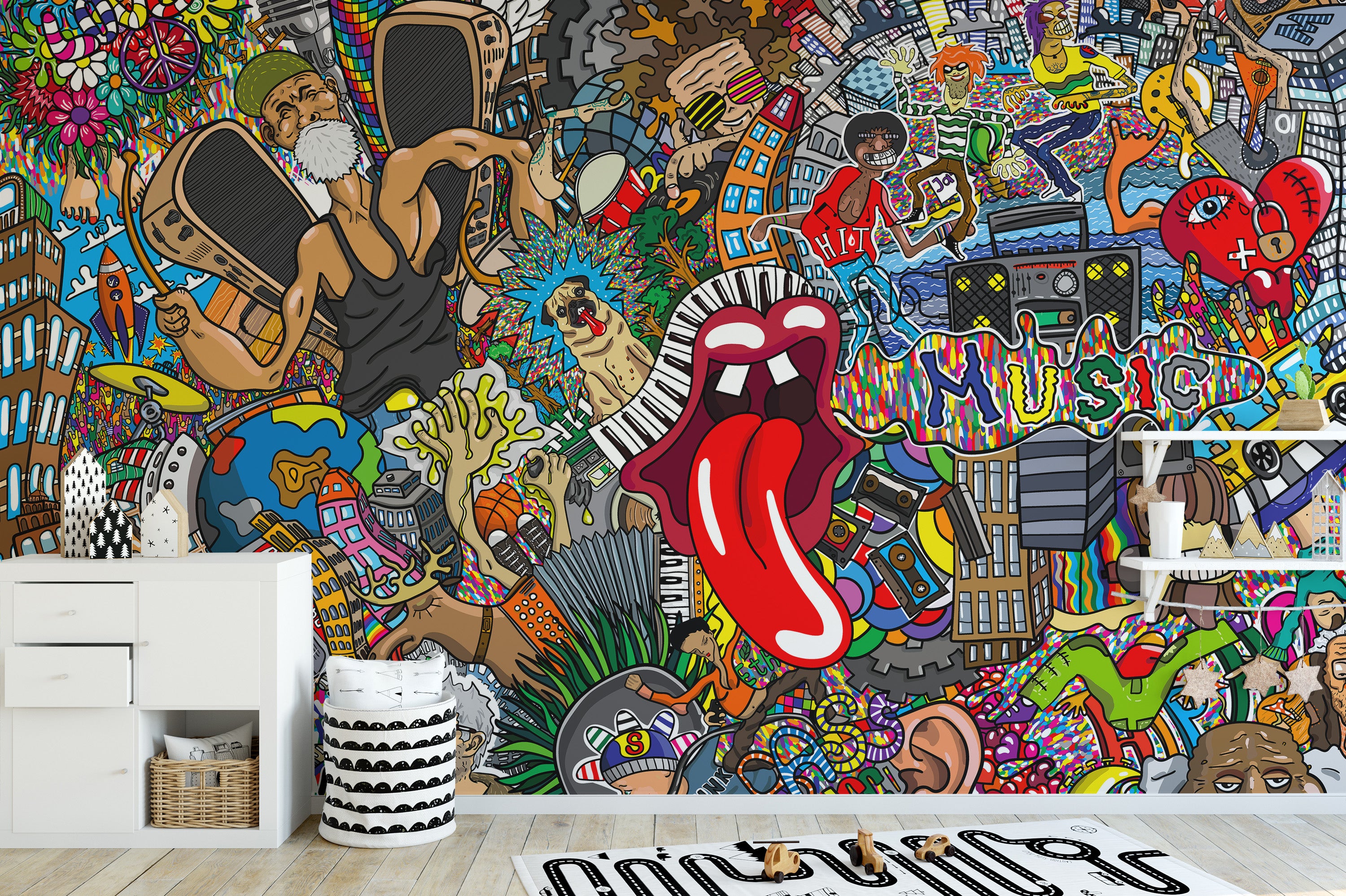 Vibrant electric music collage graffiti wallpaper mural for walls.