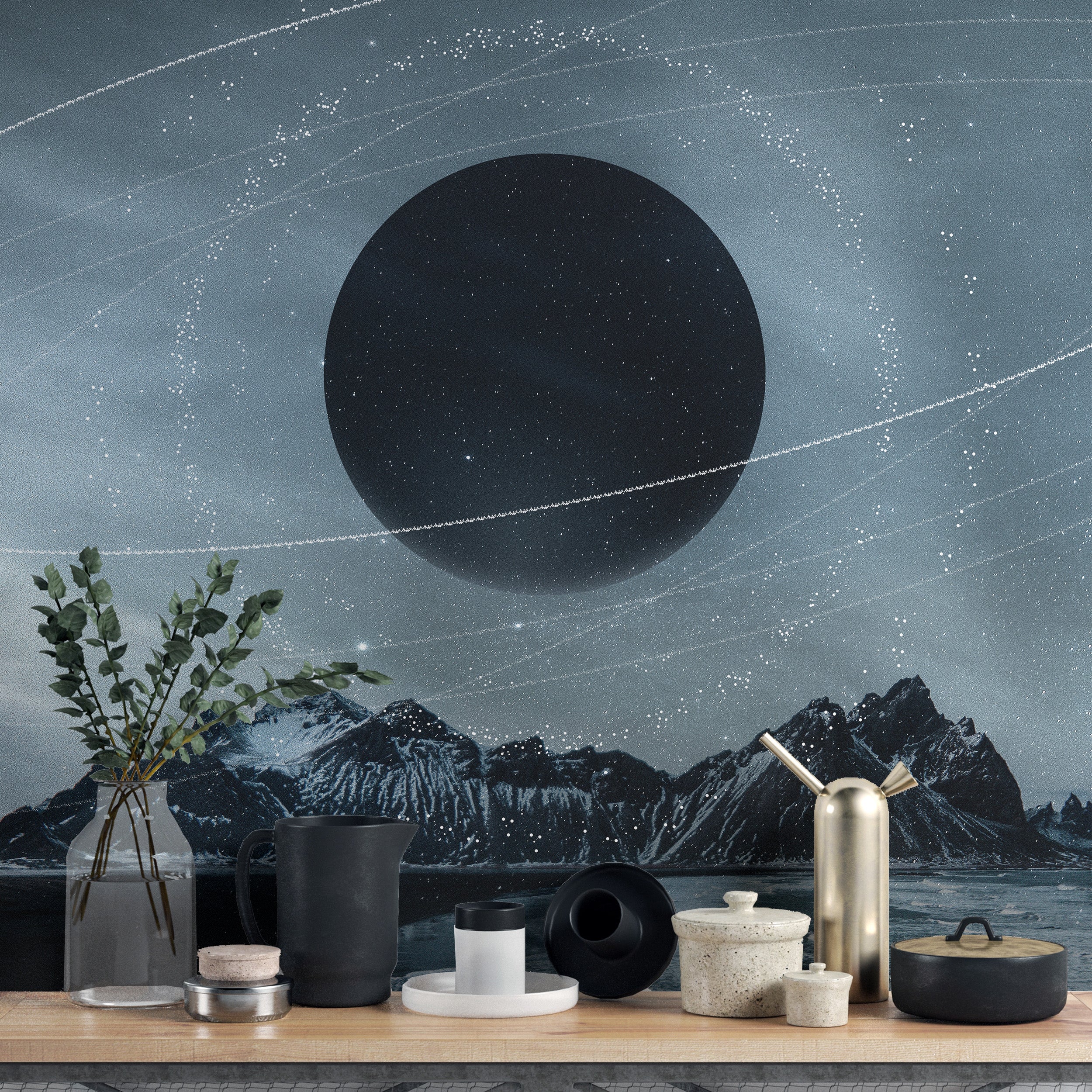Transform your space with the mystical cosmic black hole wallpaper, a breathtaking fusion of galaxy aesthetic wallpaper and dark space background. This mesmerizing design features a colossal black hole surrounded by starry cosmic elements set against a dramatic mountain landscape. Perfect for creating a futuristic landscape art vibe in bedrooms, offices, or gaming rooms. The celestial fantasy landscape adds a surreal, dreamlike ambience, making it a must-have for space lovers. Elevate your interiors with this outer space surrealism masterpiece. Crafted for easy application, this sci-fi space wallpaper turns any wall into an interstellar escape. Shop now and explore infinity!