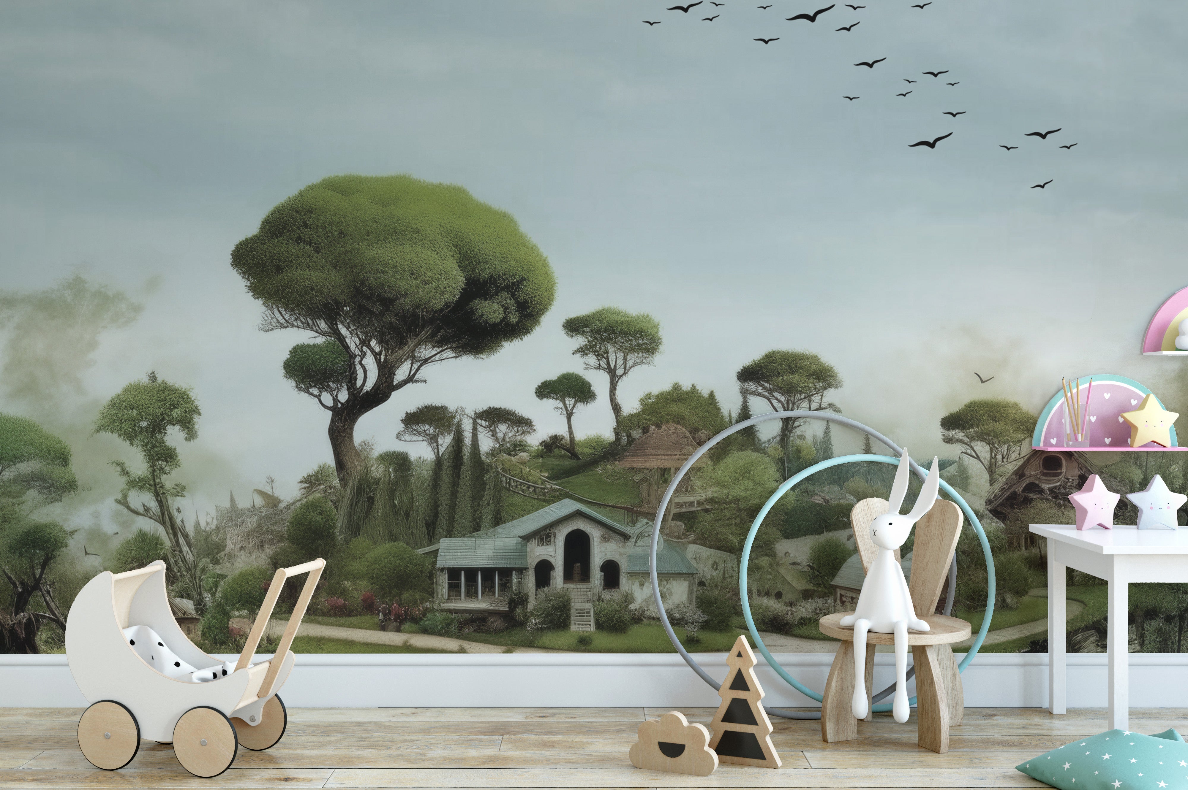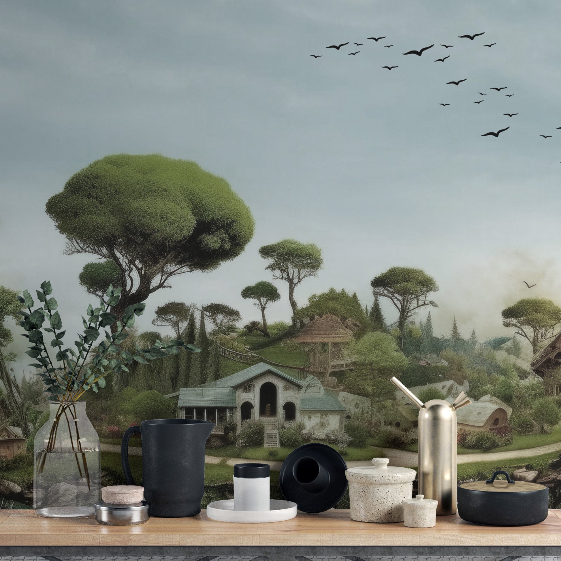 The mystical glade wall mural is a picturesque portrayal of an untouched haven where nature and quaint dwellings coexist perfectly. This piece of art invites the onlooker into a landscape where time slows, and the outside world gently fades away. It's a canvas where every tree, cottage, and winding path tells a silent story. As a backdrop, it doesn't merely adorn a wall but becomes a window to a world of serene beauty, encouraging moments of quiet contemplation and imagination. The mural stands as a testament to the beauty of pastoral life, offering a visual retreat to anyone who gazes upon its peaceful vista.