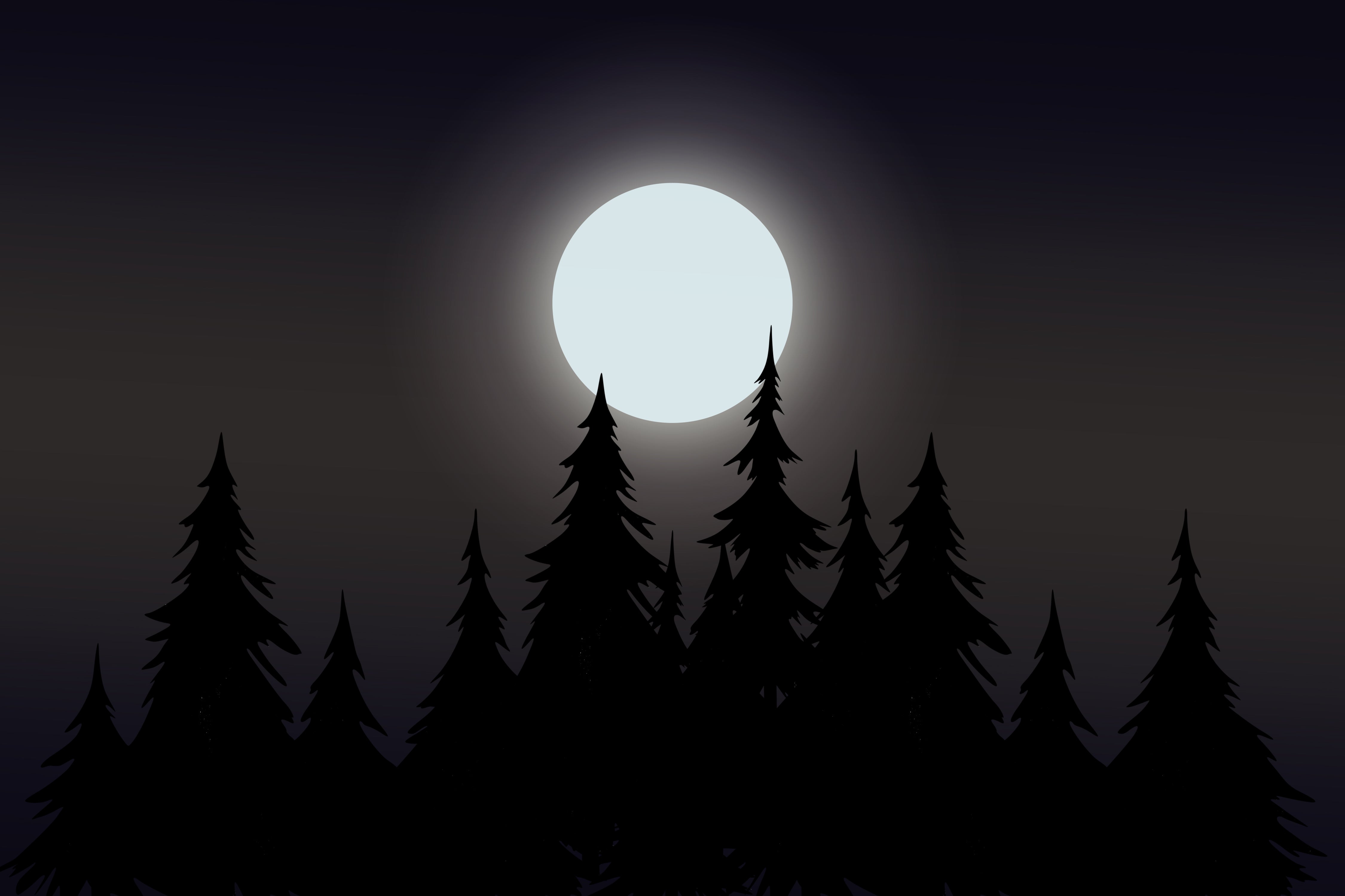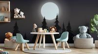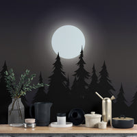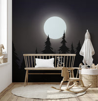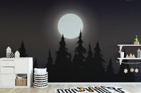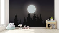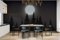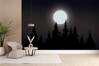 Create a captivating atmosphere with this mystical moonlit forest wallpaper. The glowing full moon casts a soft light over the dark silhouette of towering pine trees, bringing a serene yet mysterious vibe to any setting. The deep tones of the night sky forest wallpaper add depth and character, perfect for bedrooms, living spaces, or creative workspaces. This dark aesthetic moon wallpaper enhances the beauty of nature with its rich details and shadowy allure. Ideal for those who appreciate the charm of a midnight forest silhouette wallpaper, this design offers a timeless appeal with a touch of magic.