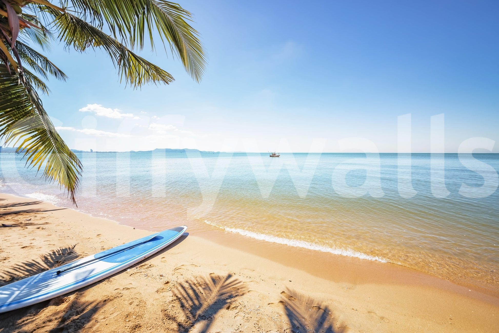 Bring the tranquility of a tropical shore into your home with this scenic wallpaper for walls. The soft turquoise waters meet the warm, sandy beach under a clear blue sky, framed by the gentle sway of palm leaves. A surfboard resting on the sand adds a touch of adventure to the serene landscape. The wallpaper creates a calming and inviting atmosphere, ideal for bedrooms, living rooms, or even a home office. Its vibrant yet soothing colours will enhance your space, making it feel brighter and more spacious. This wallpaper is perfect for creating a coastal retreat within your own home.