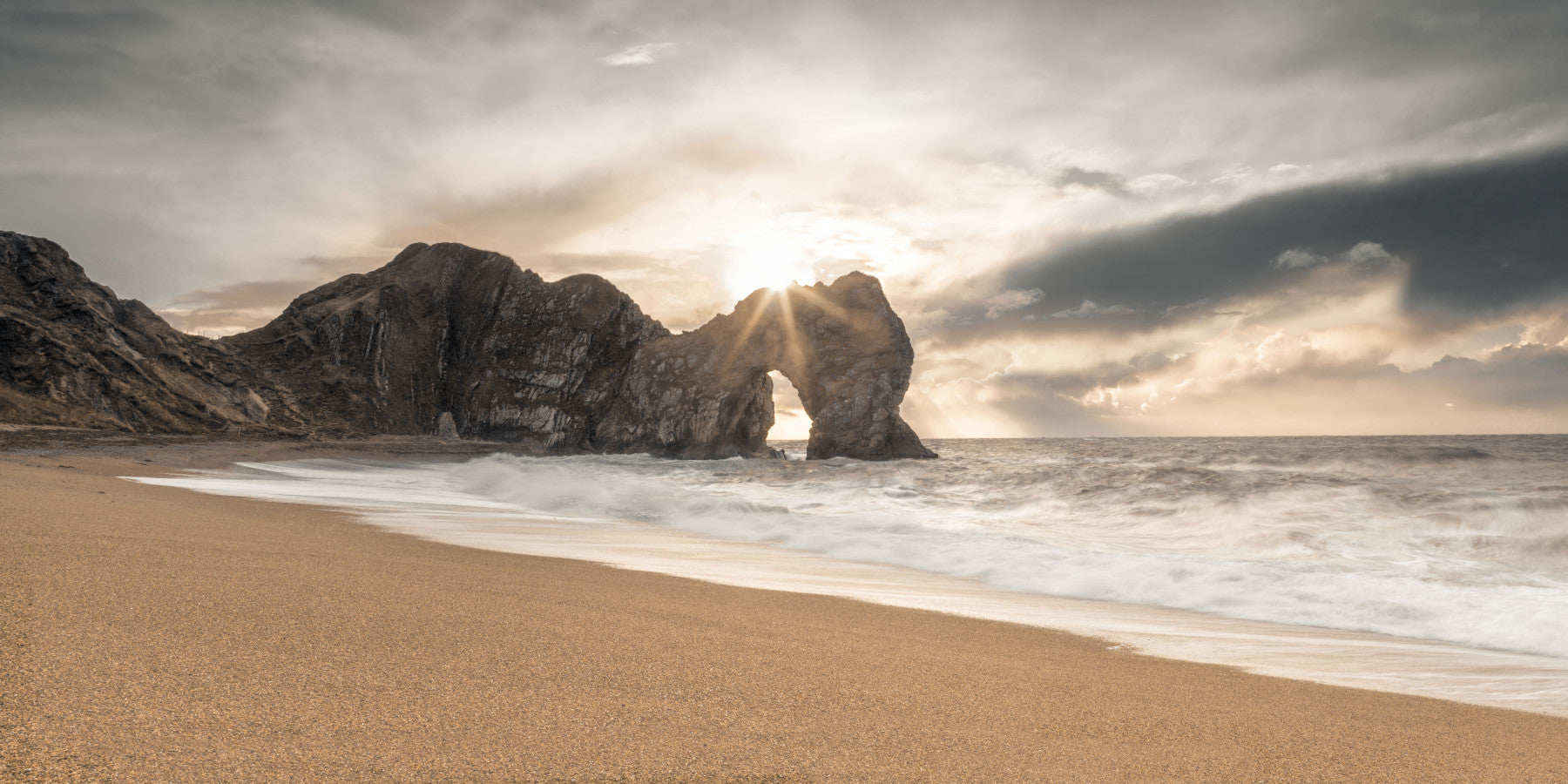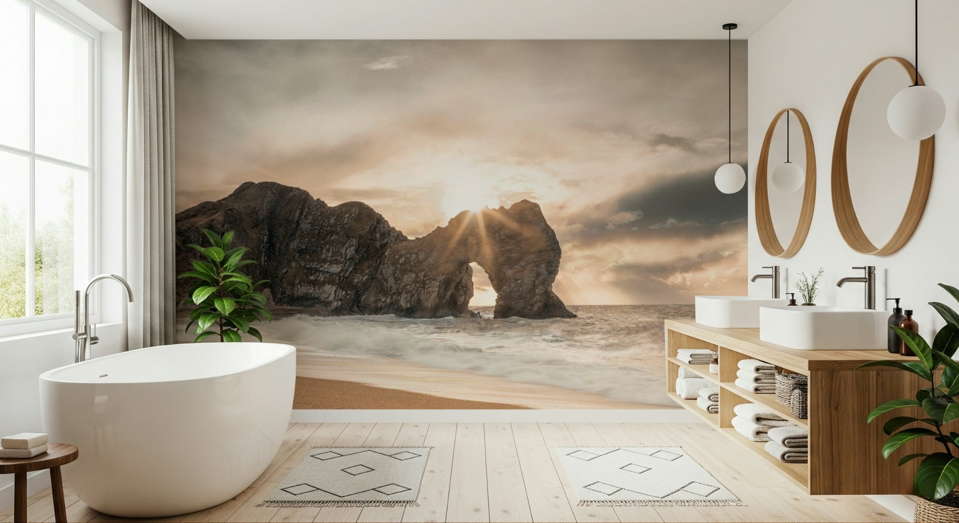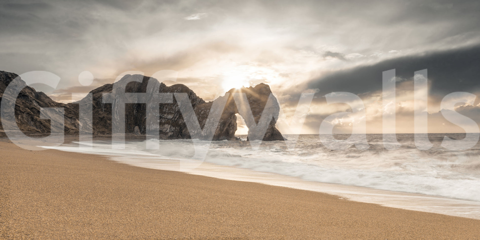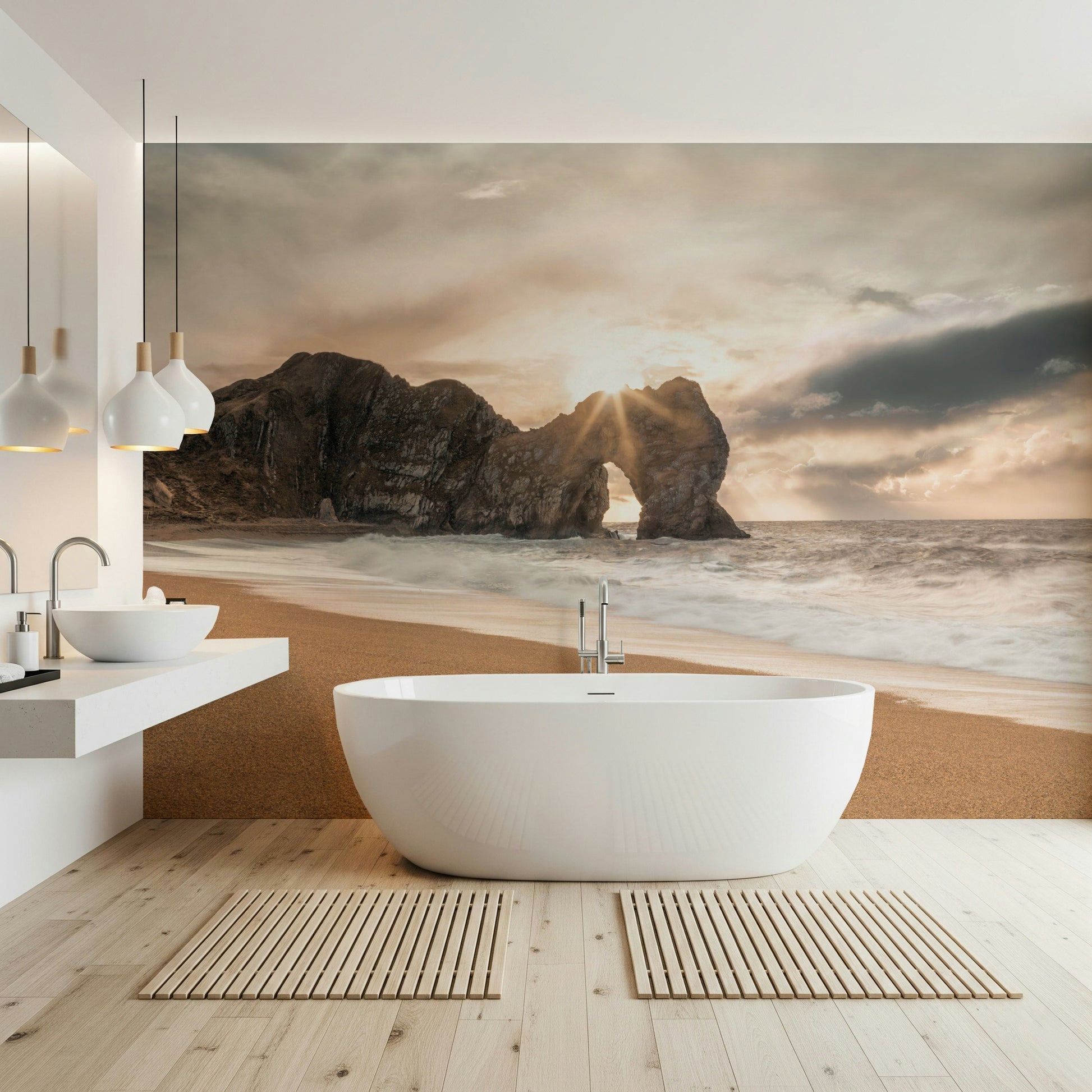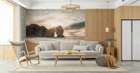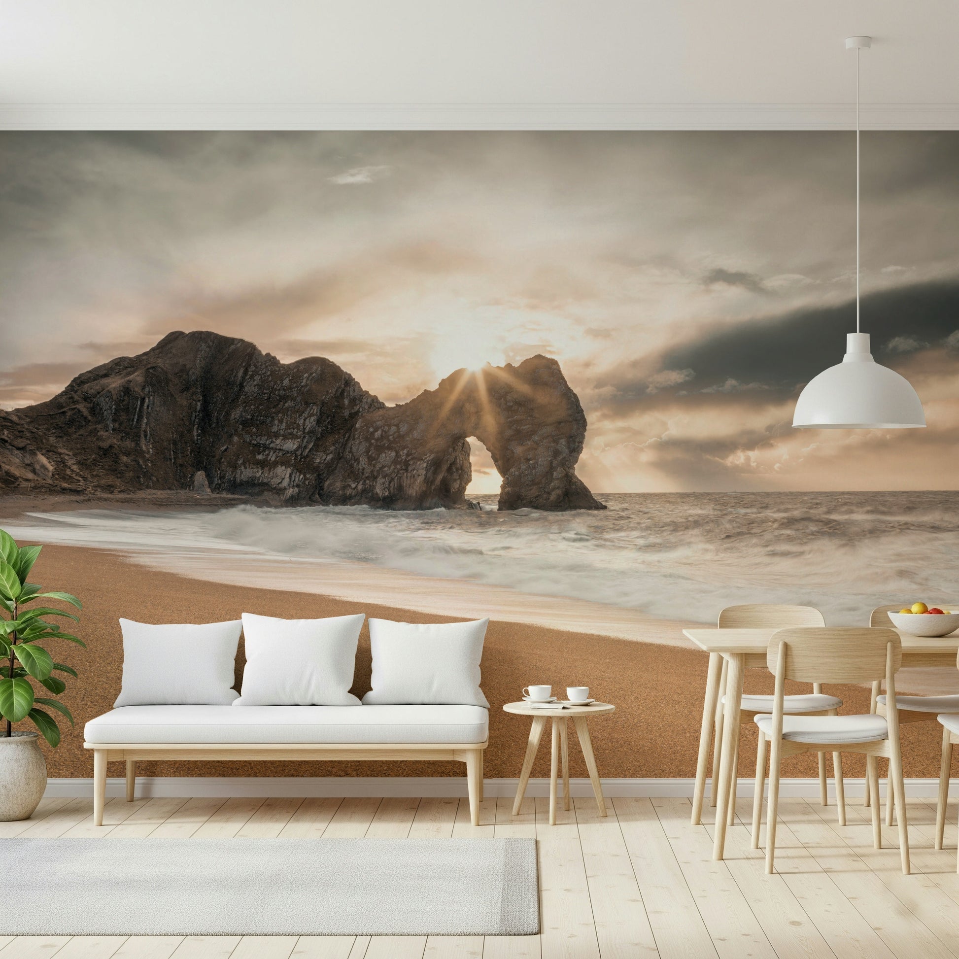 Bask in the tranquil beauty of this coastal scene. Warm sunlight pierces through a natural rock arch, illuminating the sandy beach and crashing waves. The muted colour palette creates a soothing ambience, perfect for any room seeking a touch of serenity. This wallpaper for walls brings the outdoors in, complementing interiors with its calming influence and natural elegance. Ideal for bedrooms, living rooms, or home offices.