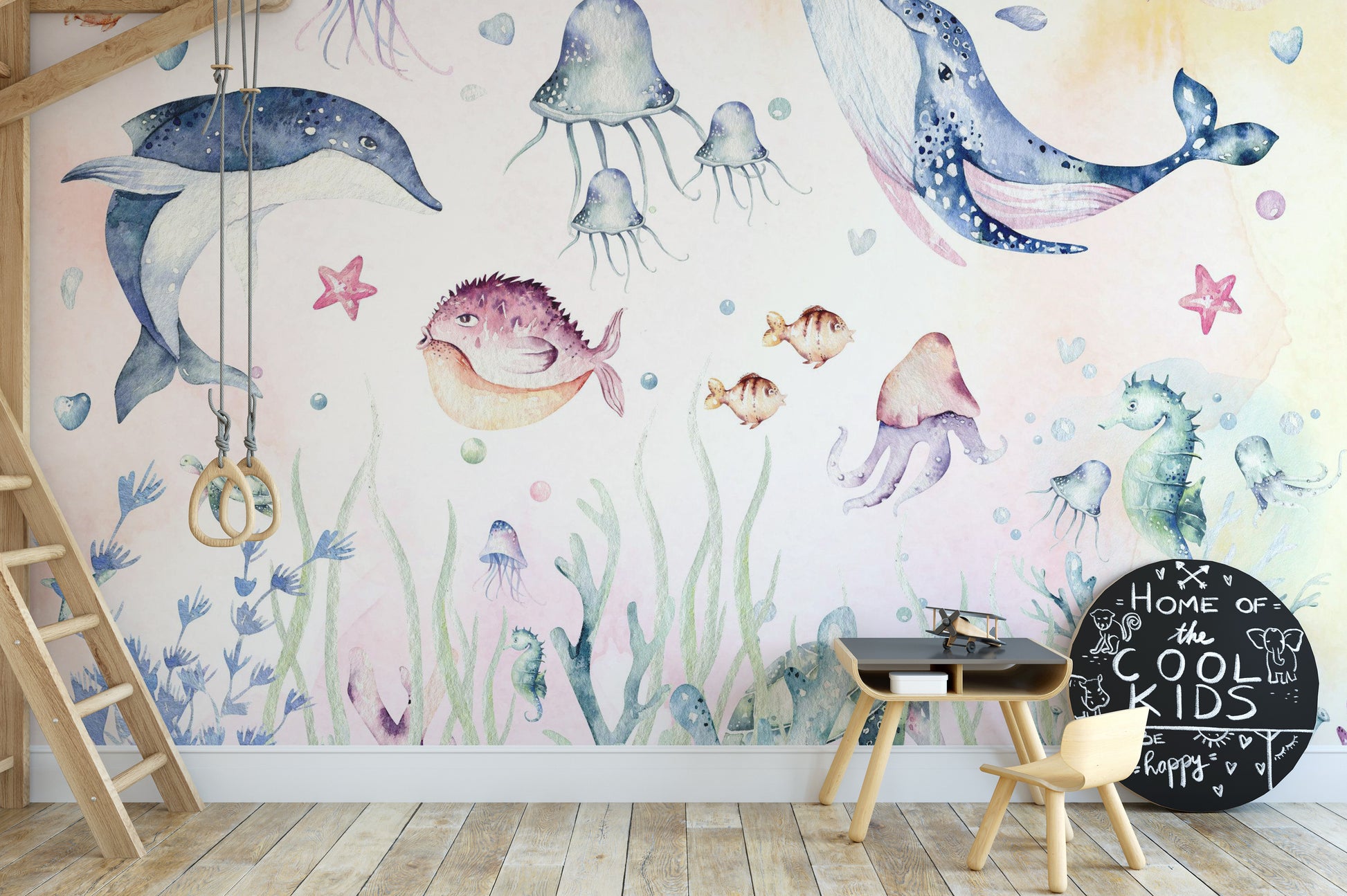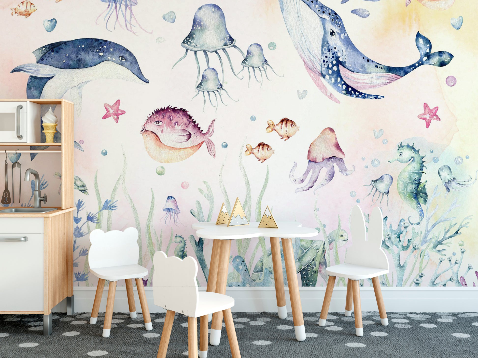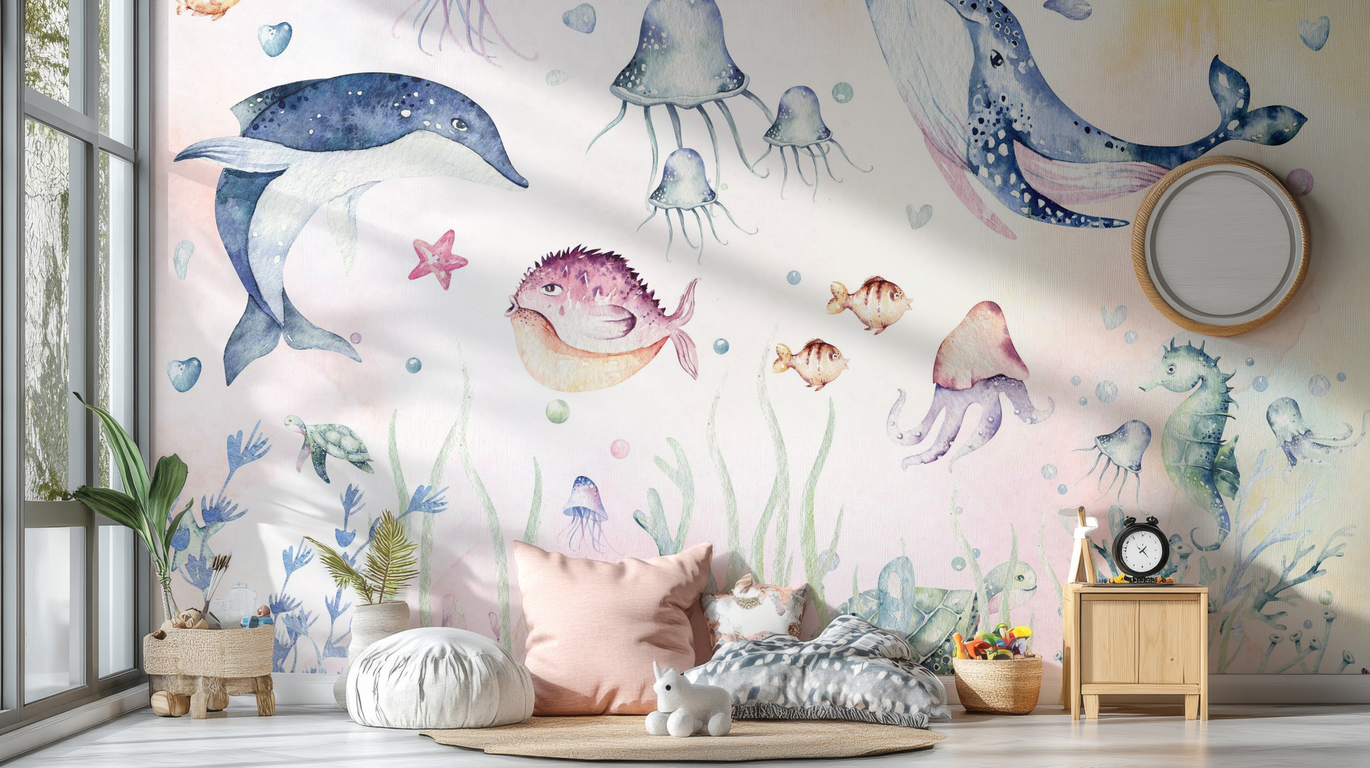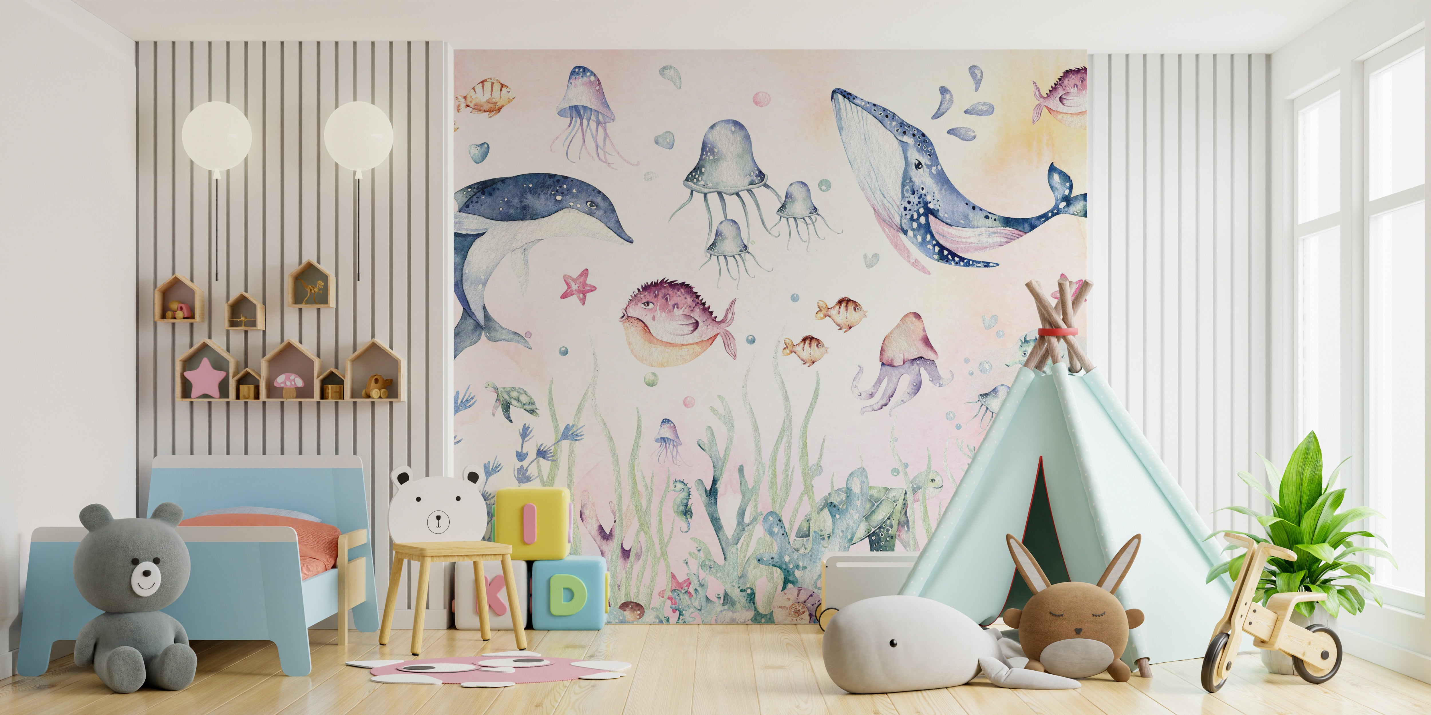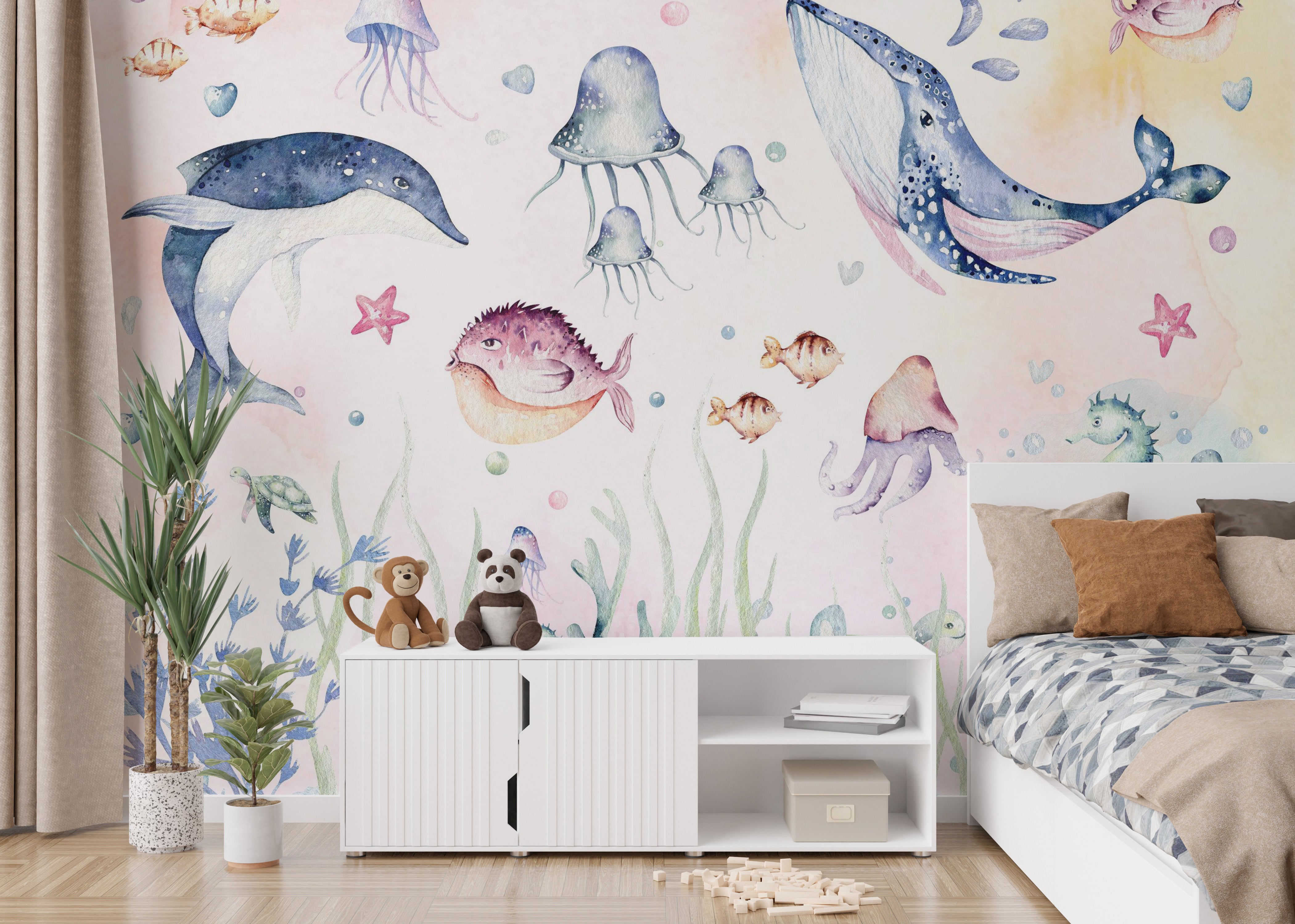 Dive into ocean magic with our nautical creatures wall mural for your little one's nursery. This playful kids nursery wallpaper teems with vibrant marine life, promising endless stories and dreams under the sea. Friendly dolphins, gentle whales, and colorful fish enliven the walls, creating a captivating backdrop for play and rest. It's a joyous oceanic journey for a child's imagination, inviting a sense of adventure without leaving the nursery. Brighten your youngster’s room with this charming seascape.