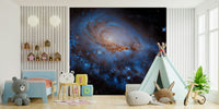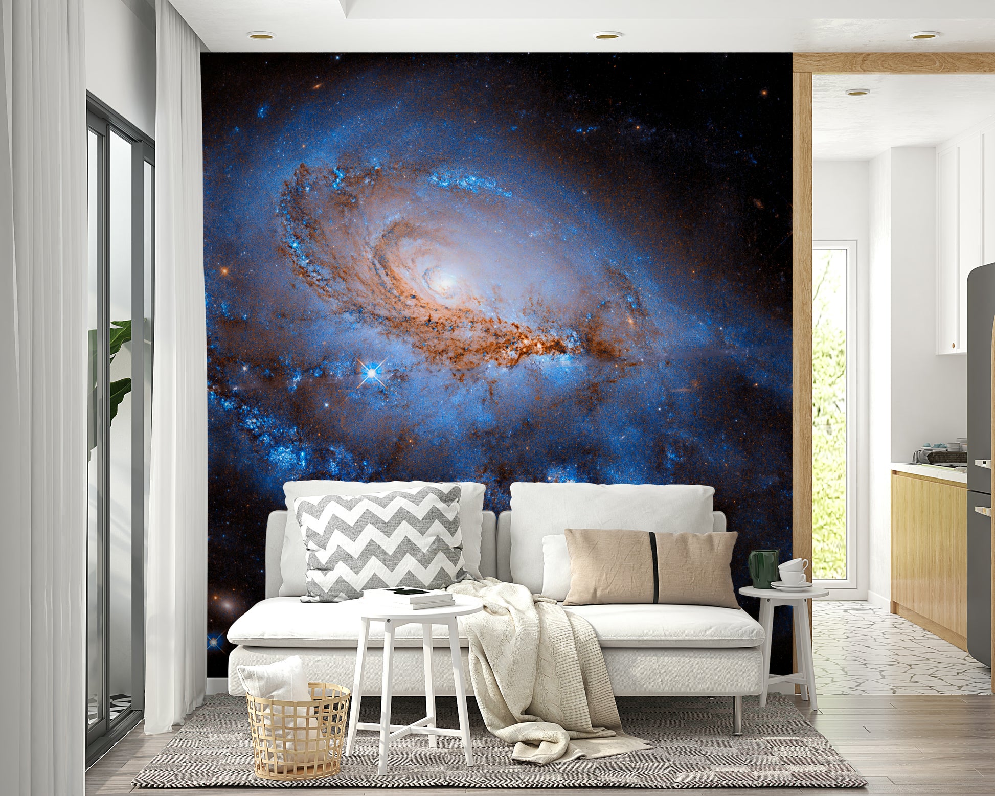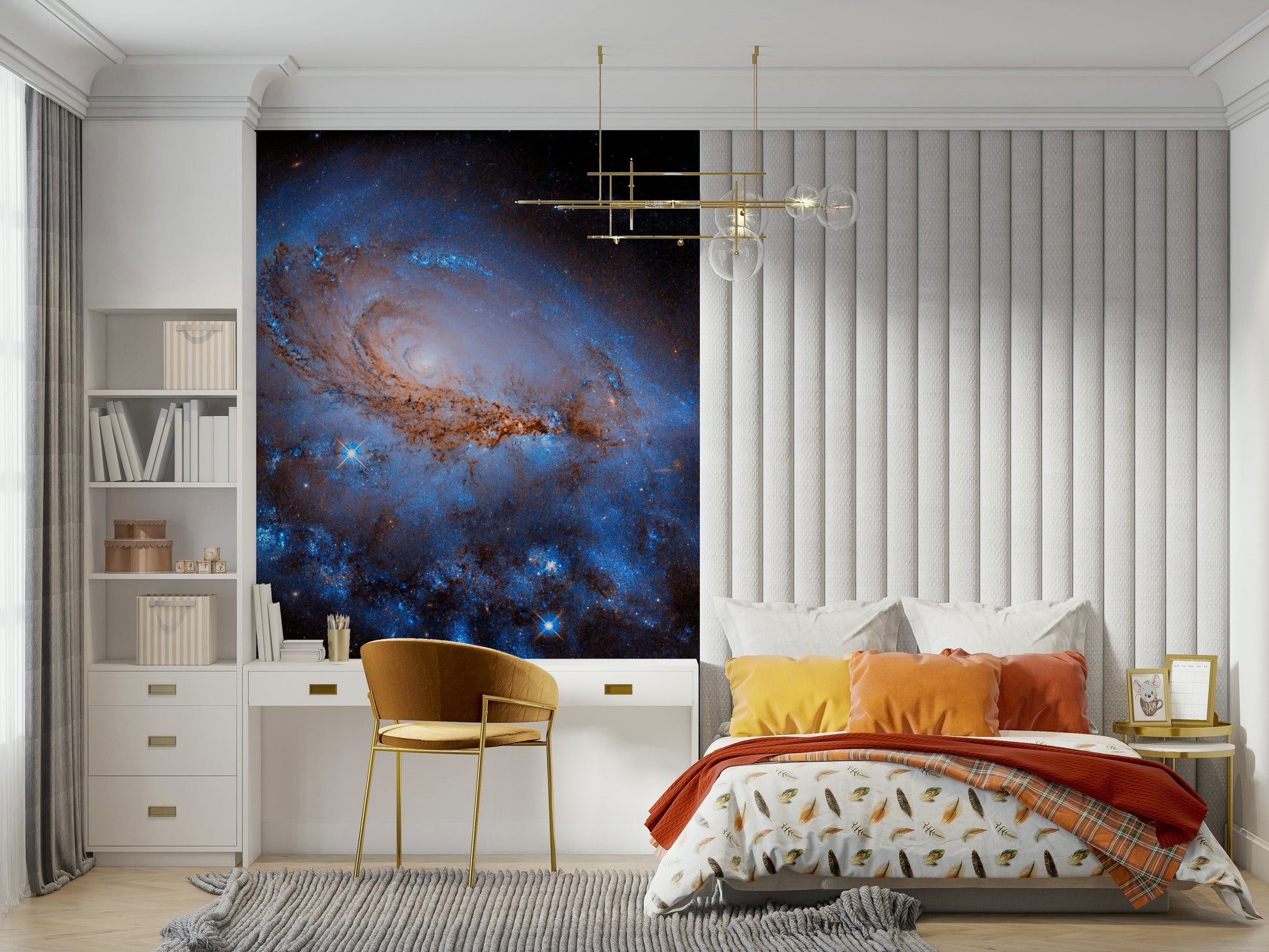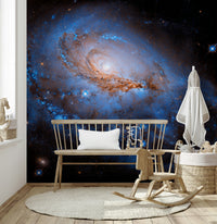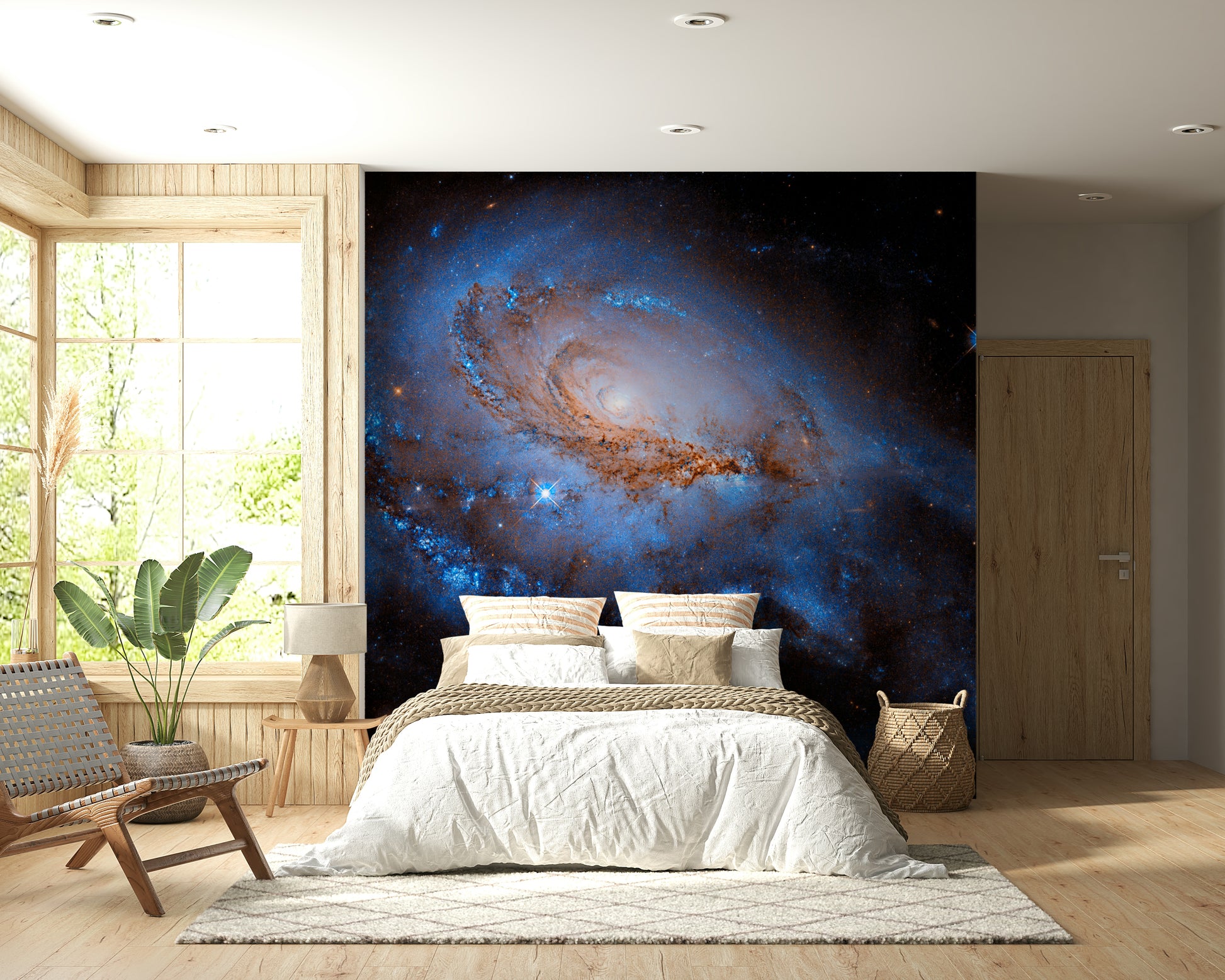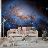 Elevate your interior with this breathtaking depiction of a distant galaxy, perfect as wallpaper for walls. This design showcases swirling nebulas in shades of deep blues and fiery oranges, creating a captivating visual effect. It adds depth and a sense of vastness to any room, making it an excellent choice for spaces where you want to inspire imagination or create a calming atmosphere. Picture it in a bedroom, living room, or even a home office where it serves as a stunning backdrop, complemented by modern furniture. Bring the beauty of outer space inside and watch as this wallpaper transforms your space with dramatic colour and light.