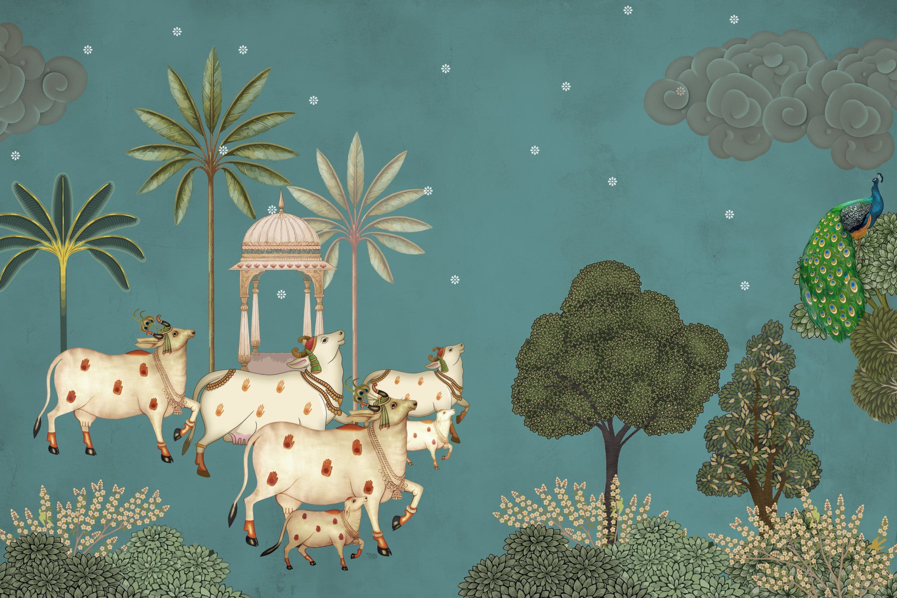 Immerse yourself in the tranquil beauty of 'Neel Pichwai,' a captivating wallpaper that draws inspiration from the traditional Indian art form. The serene teal backdrop, reminiscent of twilight skies, sets a calming stage for the detailed scene. Graceful cows, adorned with traditional markings, meander through a lush landscape dotted with stylised trees and a delicate pavilion. A majestic peacock, perched amidst verdant foliage, adds a touch of regal elegance. The gentle colour palette and intricate detailing evoke a sense of peace and serenity, making 'Neel Pichwai' a perfect choice to create a soothing and sophisticated ambience in any space. Subtle, stylised clouds and floral motifs further enhance the dreamlike quality of this artwork, bringing a touch of Indian heritage to your modern interiors.