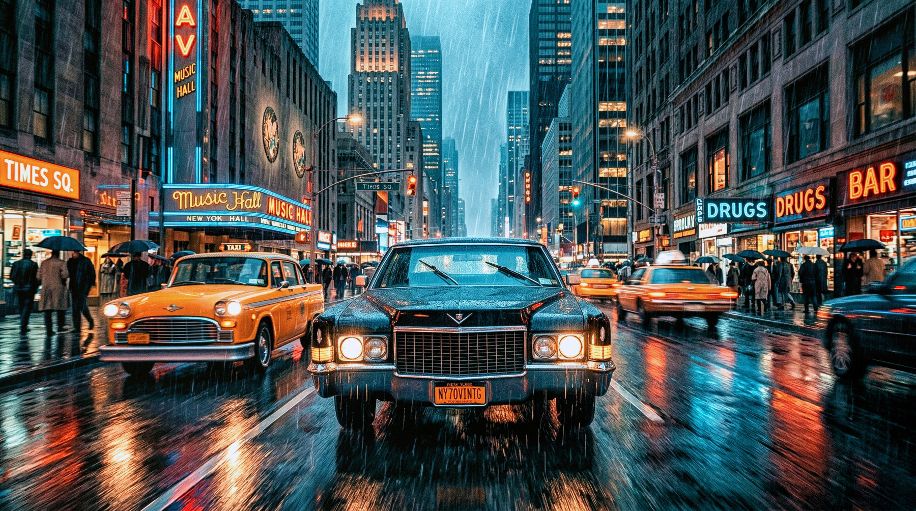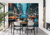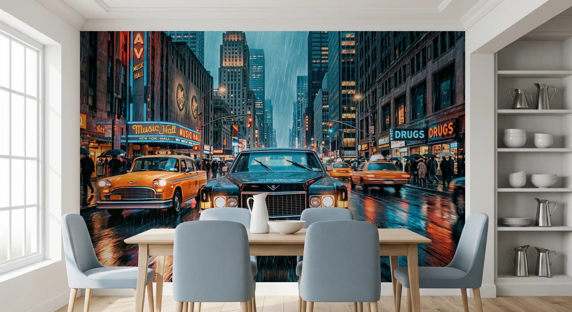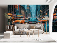 Immerse your space in the dynamic energy of a rainy New York City evening with this captivating wallpaper for walls. Vintage automobiles, including a bright yellow taxi, cruise down slick streets, reflecting the city's brilliant neon glow. Towering skyscrapers frame the bustling scene, illuminated by electric teal and warm orange lights from iconic signs like 'Music Hall' and 'Times Sq.' Pedestrians with umbrellas add to the atmospheric charm, creating a cinematic urban tableau. The rich palette of deep blues, contrasting yellows, and fiery oranges infuses any room with a dramatic, nostalgic ambience, making it a compelling focal point in a living room, study, or entertainment area.