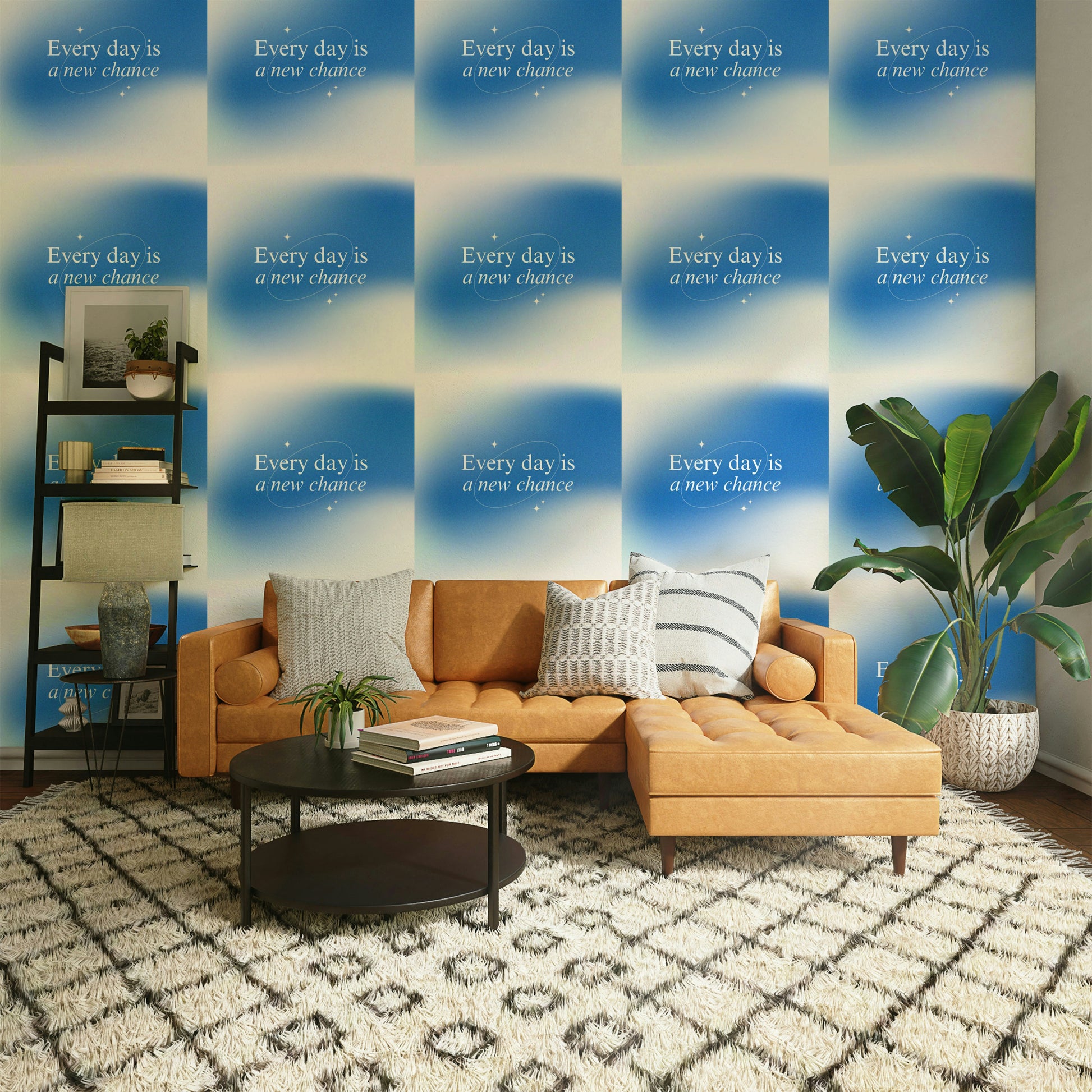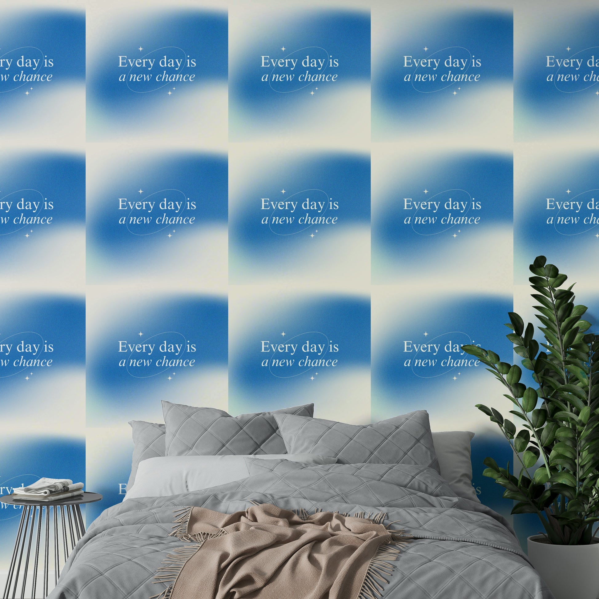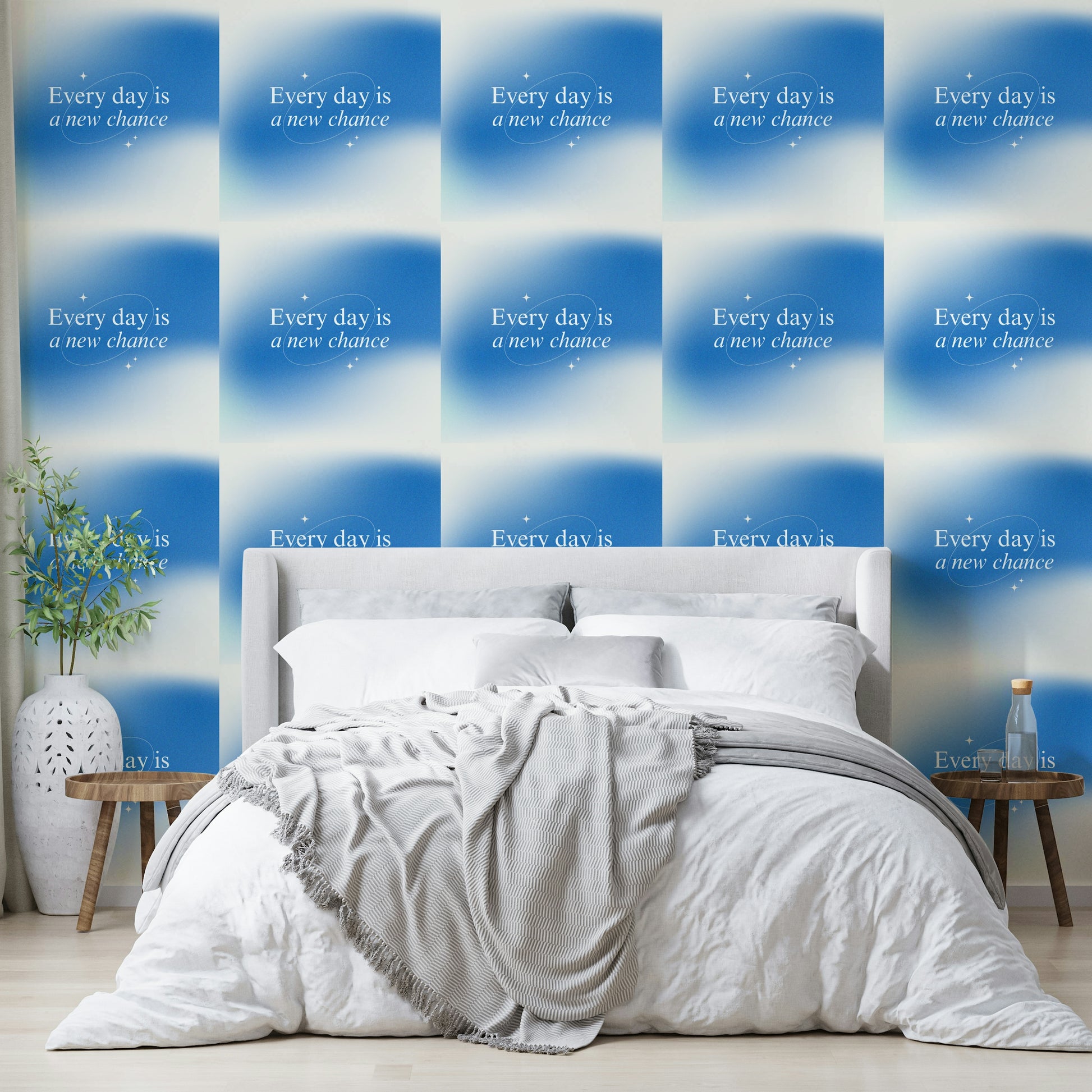 Embrace the serenity of a brand new day with this calming wallpaper. A soft, gradient blue sky, reminiscent of a hopeful dawn, forms the backdrop for the inspiring message: 'Every day is a new chance'. Delicate, sparkling stars add a touch of magic, enhancing the feeling of fresh beginnings and limitless possibilities. This minimalist design is perfect for those seeking a peaceful and motivating start to each day, promoting positivity and the pursuit of dreams. The subtle color palette and clean typography create a tranquil atmosphere, ideal for a desktop or mobile screen.