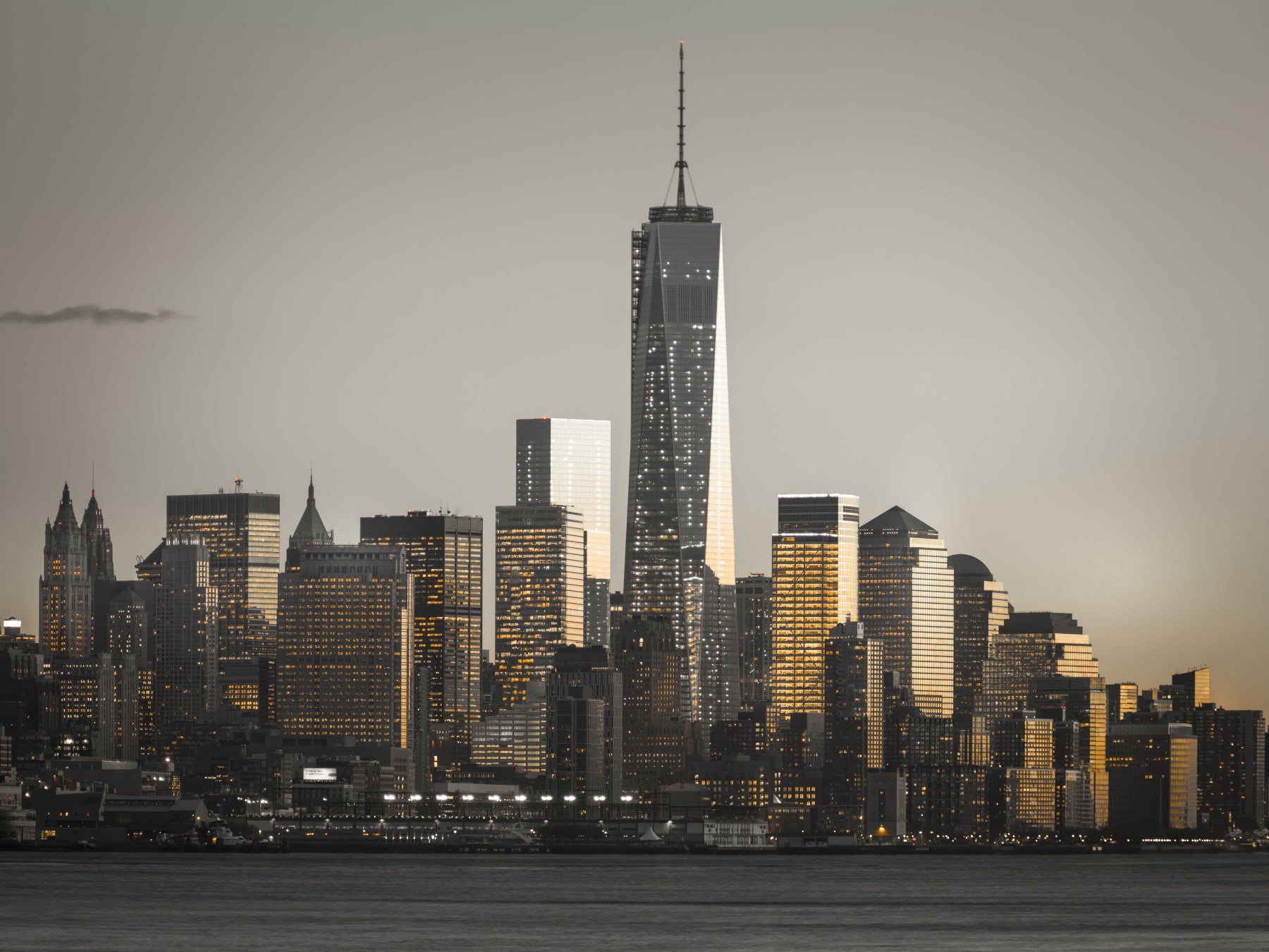 Modern architecture of Manhattan, New York. Capture the essence of urban allure with this cityscape wallpaper for walls. The image presents the iconic New York skyline bathed in a warm, golden glow against a muted sky. This design provides a striking contrast that enlivens modern living rooms, home offices, or even a teen's bedroom. It adds a touch of sophistication and metropolitan energy, perfectly complementing minimalist, industrial, or modern interiors with its neutral palette and architectural detail.