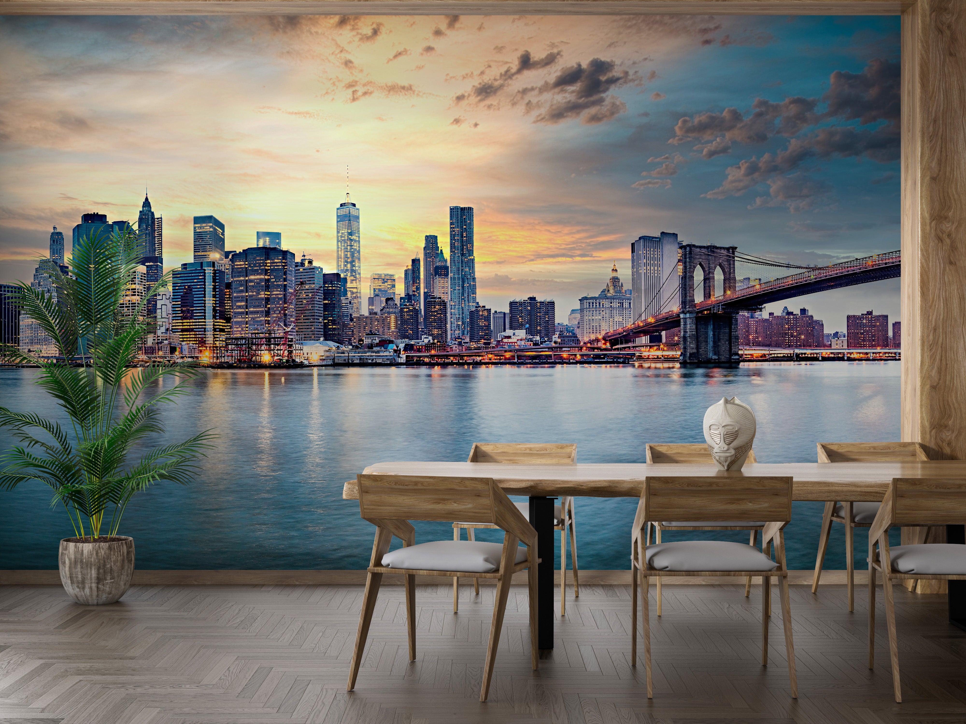 Immerse your workspace in the warm glow of the New York sunset panorama wall mural. This captivating image, featuring the iconic cityscape and bridge, bathes your office in the serene yet invigorating colors of dusk. This mural is more than decor it's a daily backdrop of inspiration, where the sun bids farewell against a bustling city wallpaper silhouette. Perfect for enlivening any office environment, the rich gradient of sunset shades seamlessly blends with the dynamic skyline. Bring the essence of New York's evening charm to your walls and let this mural ignite creativity and passion in your professional haven.