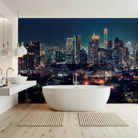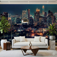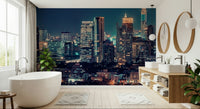 Transform your living space with this captivating cityscape **wallpaper for walls**. The design presents a sprawling metropolis illuminated against the night sky. The deep blues and oranges create a dramatic, modern aesthetic. This wall decor brings a touch of urban sophistication to any room. The detailed architecture contrasts beautifully with the natural elements of the parks below, creating a balanced and visually engaging scene. Ideal for a living room, office, or hallway, this design enhances the feeling of depth and space, adding an element of contemporary elegance to your home. Elevate your interiors with this stunning piece of urban art.