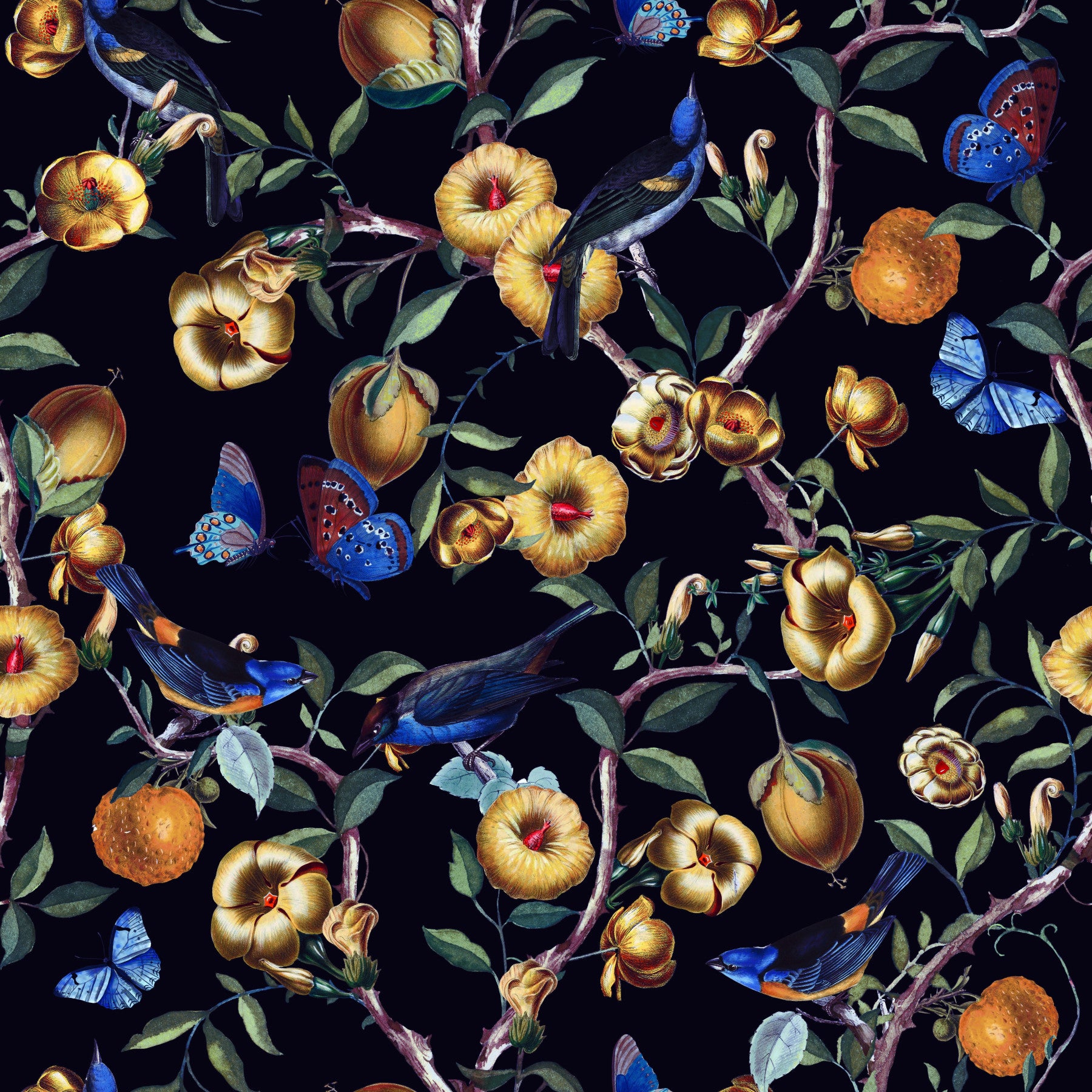 Escape into the enchanting world of 'Nocturnal Garden,' a wallpaper design that captures the magic of a moonlit night. Rich, deep hues paint a vivid scene of golden flowers, ripe fruits, and vibrant blue butterflies, all meticulously rendered in exquisite watercolor detail. Graceful birds perch amongst the blossoms, adding a touch of life and movement to this nighttime paradise. The contrasting dark background enhances the luminescence of the flora and fauna, creating a mesmerizing and sophisticated ambiance, ideal for adding a touch of mystery and wonder to any room in your home.