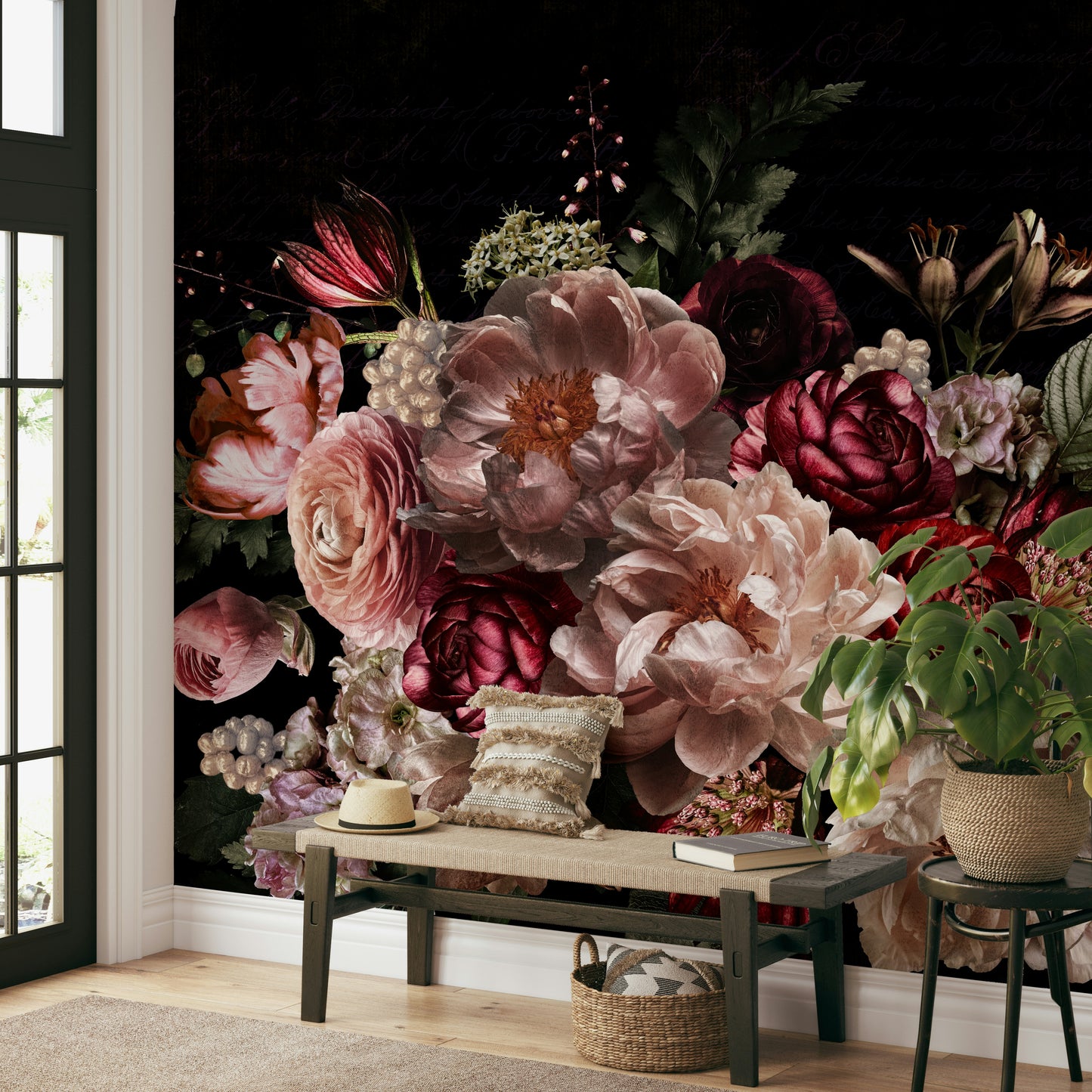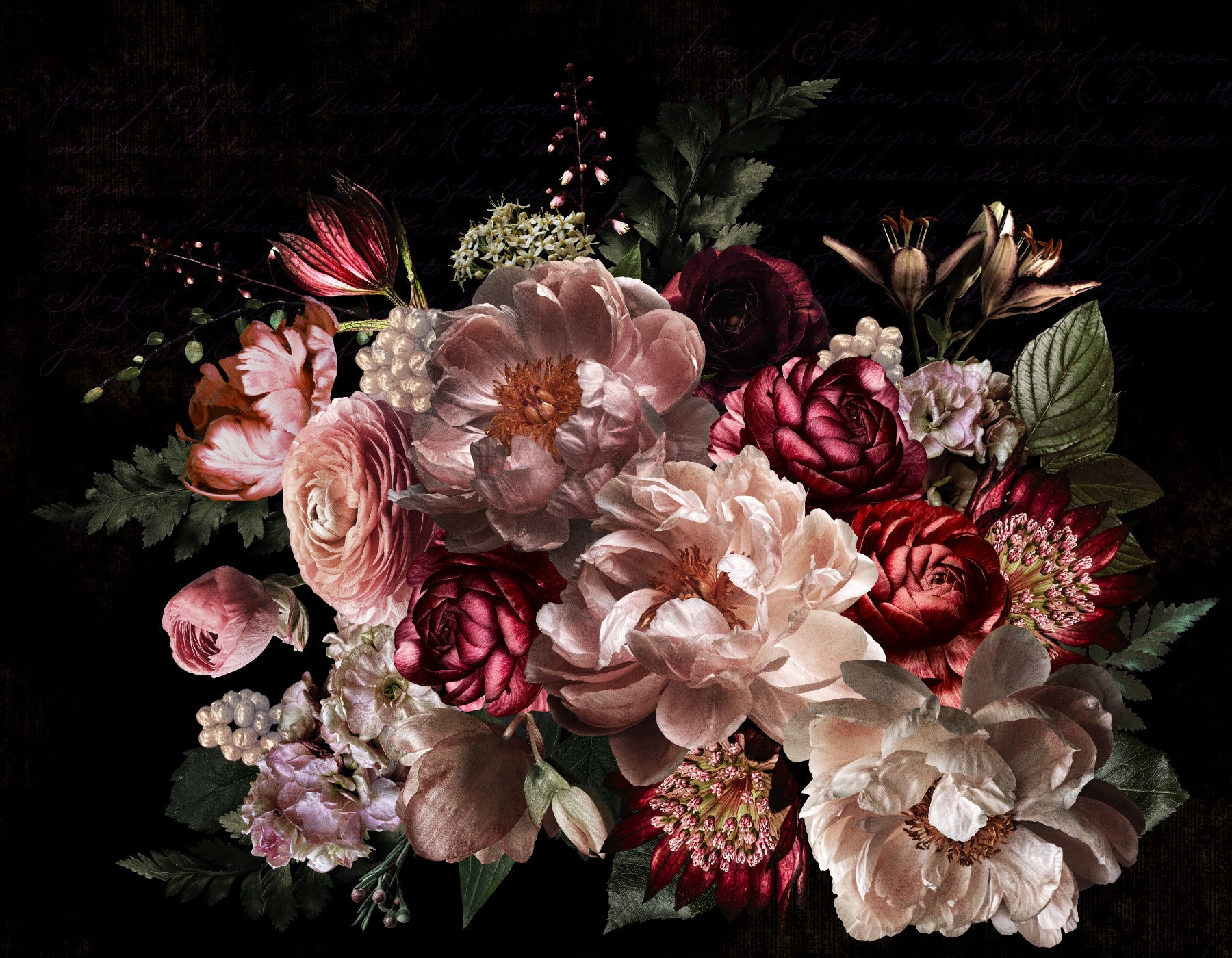 Transform your space into a captivating nocturnal garden with 'Nocturne in Bloom.' This wallpaper design features a breathtaking arrangement of deep crimson and blush pink peonies, ranunculus, and lilies, their rich textures and velvety petals rendered with exquisite detail. The dark background intensifies the flowers' vibrant hues, creating a dramatic and alluring effect. Subtle antique script adds a touch of old-world charm and mystery, making this wallpaper a statement piece for those who appreciate both beauty and intrigue. Its sophisticated elegance is perfect for creating a romantic and luxurious atmosphere.