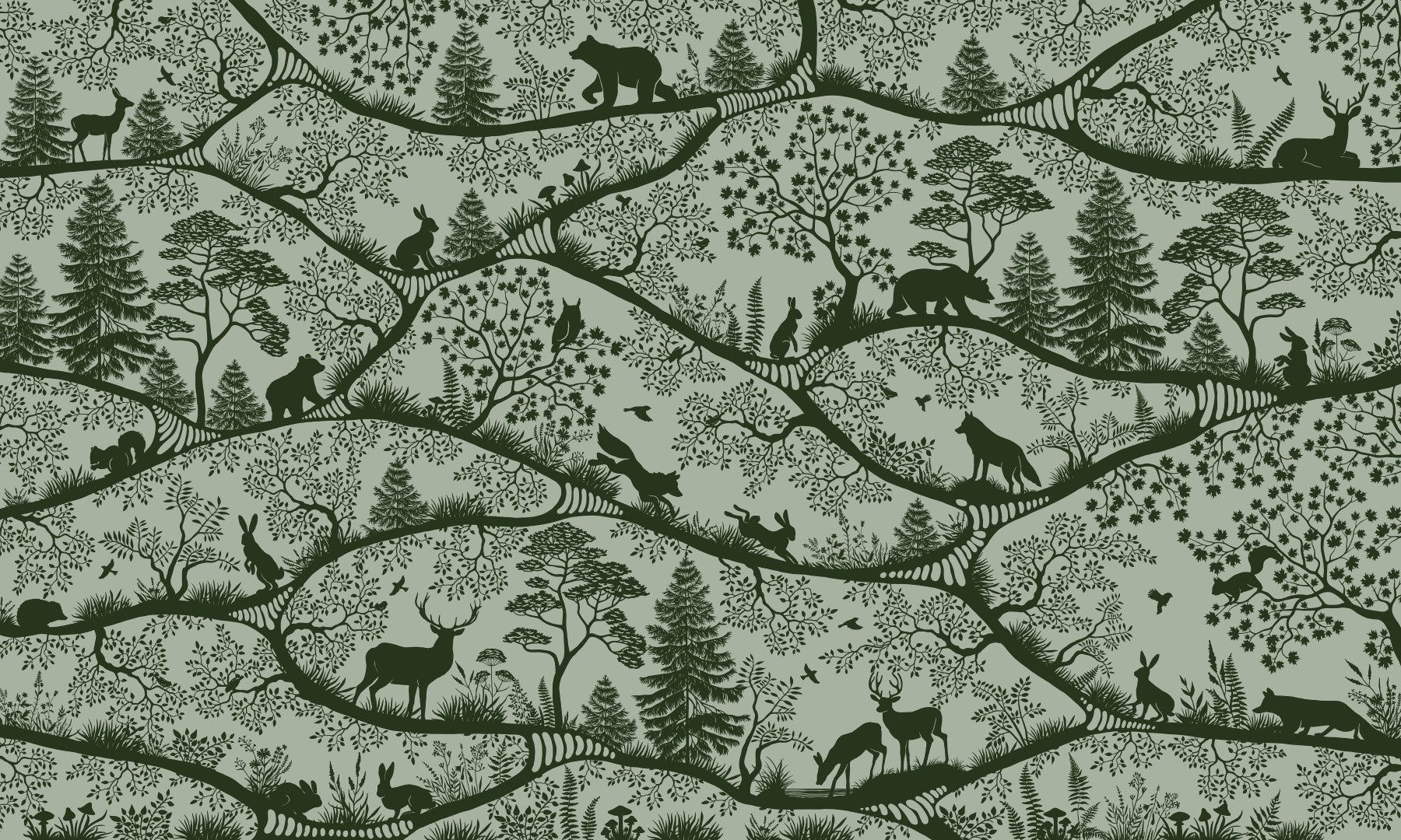 Deep green forest animals wall mural Nordic wildlife pattern design