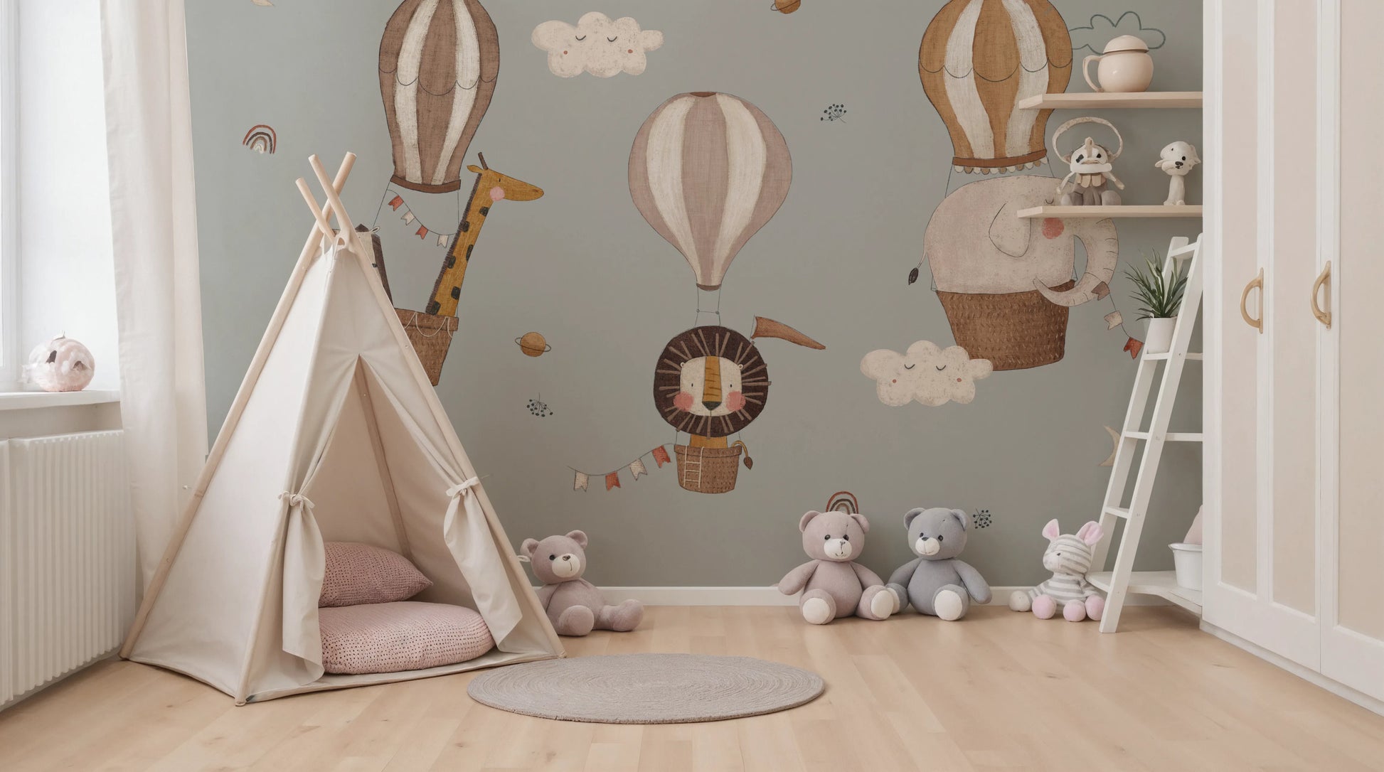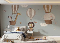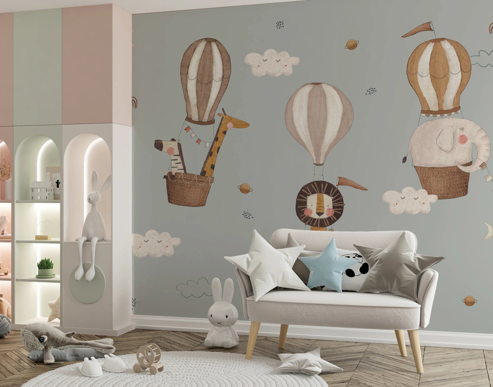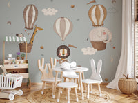 Embark on a whimsical journey with this enchanting "Nursery Hot Air Balloons" wall décor. Featuring a delightful ensemble of friendly animals soaring through a serene sky in charming hot air balloons, this design evokes a sense of wonder and adventure. A giraffe and zebra share a balloon, while a lion and elephant each have their own. Gentle clouds, tiny crescent moons, planets and miniature rainbows drift among the balloons, creating a soothing and dreamlike atmosphere perfect for a nursery or child's room. The soft, muted colour palette and delicate illustration style bring a touch of warmth and playfulness to any wall, turning it into a captivating focal point. Let your little one's imagination take flight with this adorable and heartwarming scene.