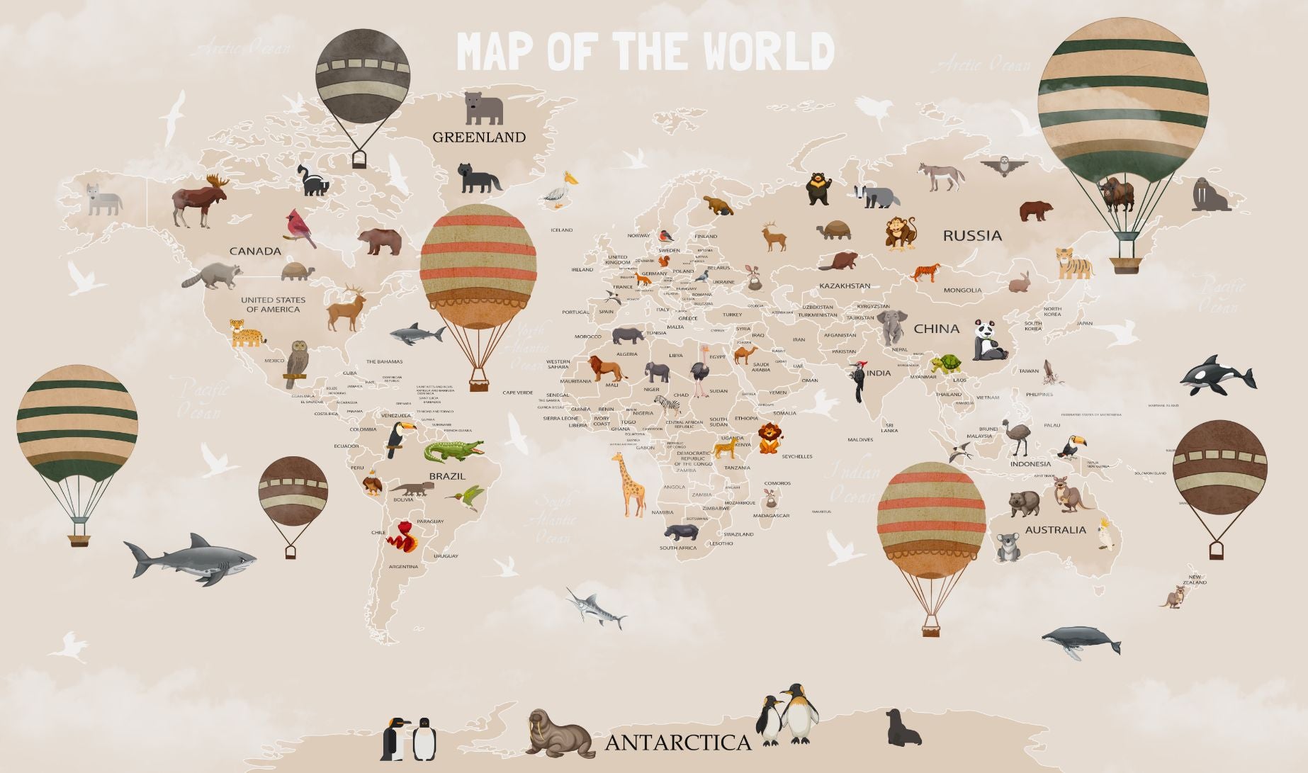 Add a splash of adventure and charm to your child's room with this enchanting animals world map mural wallpaper in a delightful pink hue. Perfectly designed for a young explorer's space, this wall covering features a whimsical illustration of the world map, adorned with playful animals native to their respective regions. Hot air balloons float gently across the map, inspiring dreams of global journeys. Each continent is artfully depicted with a selection of creatures that will ignite curiosity and learning, making this not just a decorative piece but also an educational tool. This world map wallpaper is a delightful choice for creating a stimulating and joyful environment in any kid's bedroom or play area.