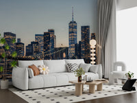 Transform your living space with this captivating wallpaper for walls, presenting the iconic New York City skyline bathed in the soft glow of twilight. The image captures the majestic Brooklyn Bridge and towering skyscrapers illuminated against a serene sky. The design features a harmonious blend of warm, golden lights from the buildings and cool, muted blues of the sky, creating a sense of urban serenity. This wallpaper adds a touch of sophistication to any room, especially living rooms, home offices, or bedrooms, infusing a modern and cosmopolitan vibe while maintaining a calming atmosphere. Perfect for creating a feature wall that celebrates cityscapes and architectural beauty.