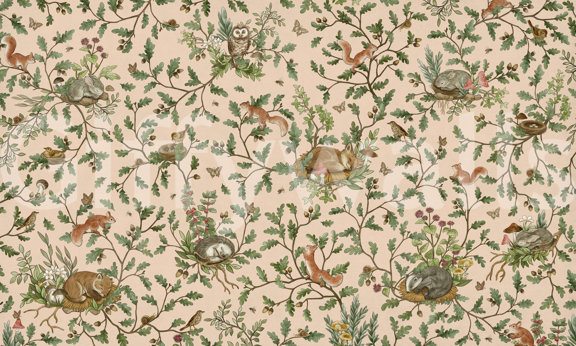 Create a calming retreat with this exquisite wallpaper for walls showcasing woodland creatures. This design portrays sleeping animals within the embrace of oak branches. The soft palette of beige, brown, and green creates a soothing effect. Ideal for a bedroom or nursery, it adds a touch of nature. Enhance your interiors with this elegant and whimsical design that brings peaceful charm to any room.