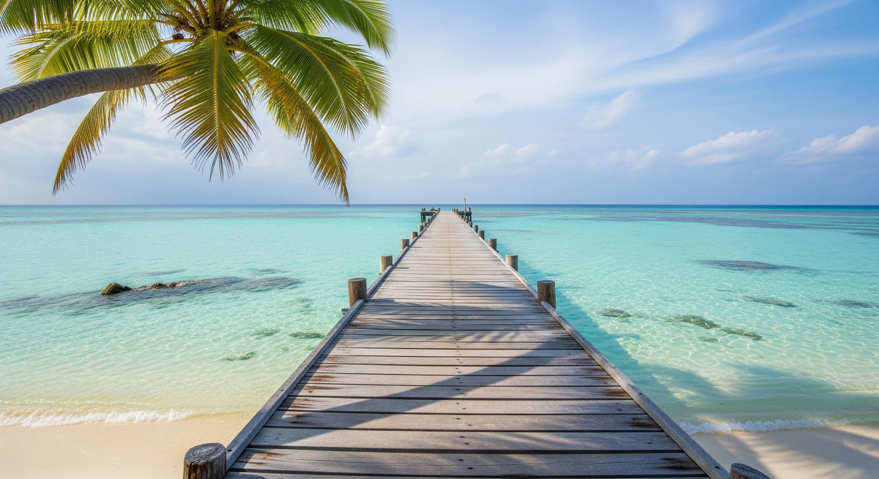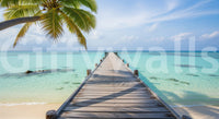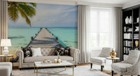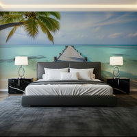 Transform your living space with this serene ocean pier scene. This wallpaper for walls features a wooden pier stretching into crystal-clear turquoise waters, framed by a lush palm tree. The soft colour palette creates a calming, coastal atmosphere. It's perfect for bringing a touch of paradise to living rooms, bedrooms, or even bathrooms, creating a sense of spaciousness and tranquility. The design enhances the natural light in any room, making it feel brighter and more inviting. The realistic detail adds depth, turning your wall into a picturesque escape.