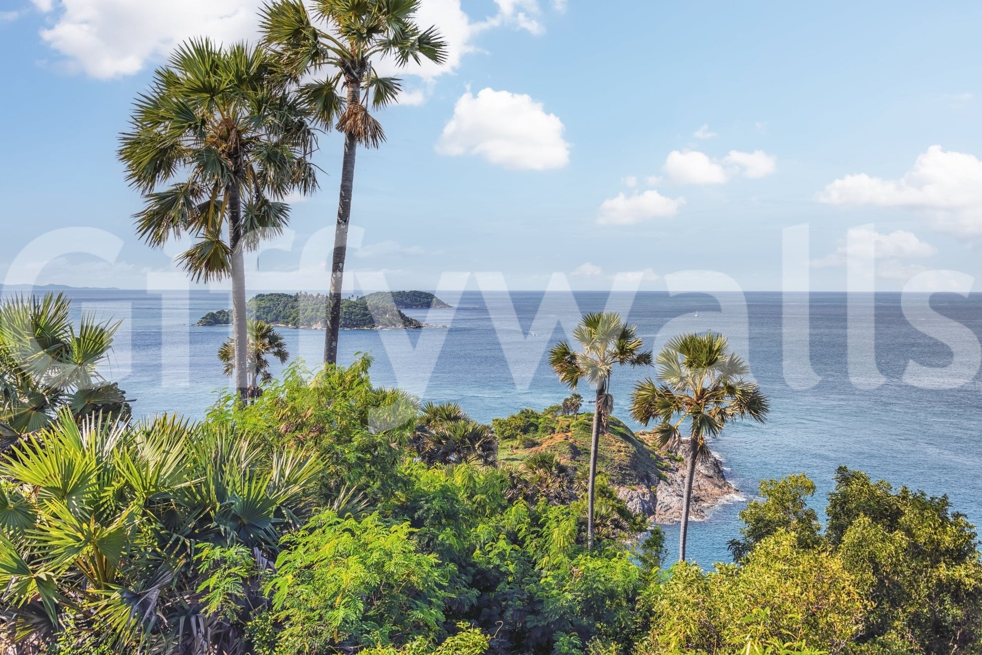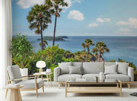 Escape to paradise with this breathtaking oceanic view. This wallpaper for walls features stunning turquoise water, lush greenery, and swaying palm trees. The high-resolution detail brings the beauty of the coast indoors. Ideal for transforming bedrooms, living areas, or a home office, this design creates a tranquil and inviting atmosphere. Let the serene colours and scenic composition enhance your interior design. Bring a touch of the tropics home. Enjoy the peaceful essence of an island getaway daily.