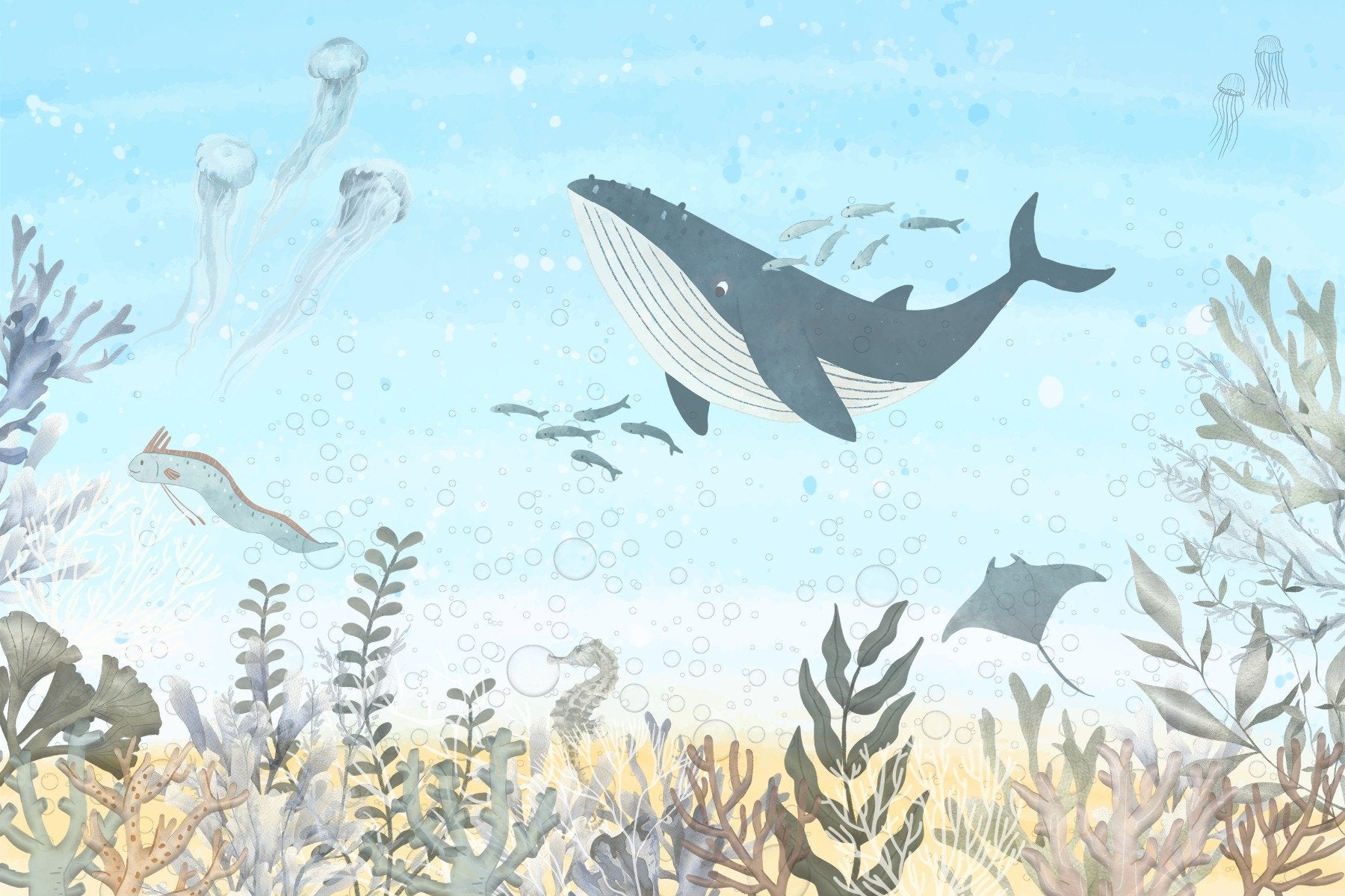 The oceanic harmony wall mural envelops any room in the serene embrace of the sea. This ocean wallpaper is a tribute to the underwater world, featuring a majestic whale accompanied by a school of fish, with jellyfish floating gracefully in the current. The vibrant ecosystem of the coral reef comes to life in exquisite detail, offering a window to the marine wonders beneath the waves. It's a celebration of oceanic life that brings a sense of depth and peace to any environment. Perfect for an accent wall, this Ocean wallpaper mural is like a daily dive into the cool, calm waters of a vast and vibrant ocean, inviting the viewer to pause and appreciate the splendor of nature's underwater ballet. It's a statement piece silently narrates the profound stories hidden in the ocean's depths.