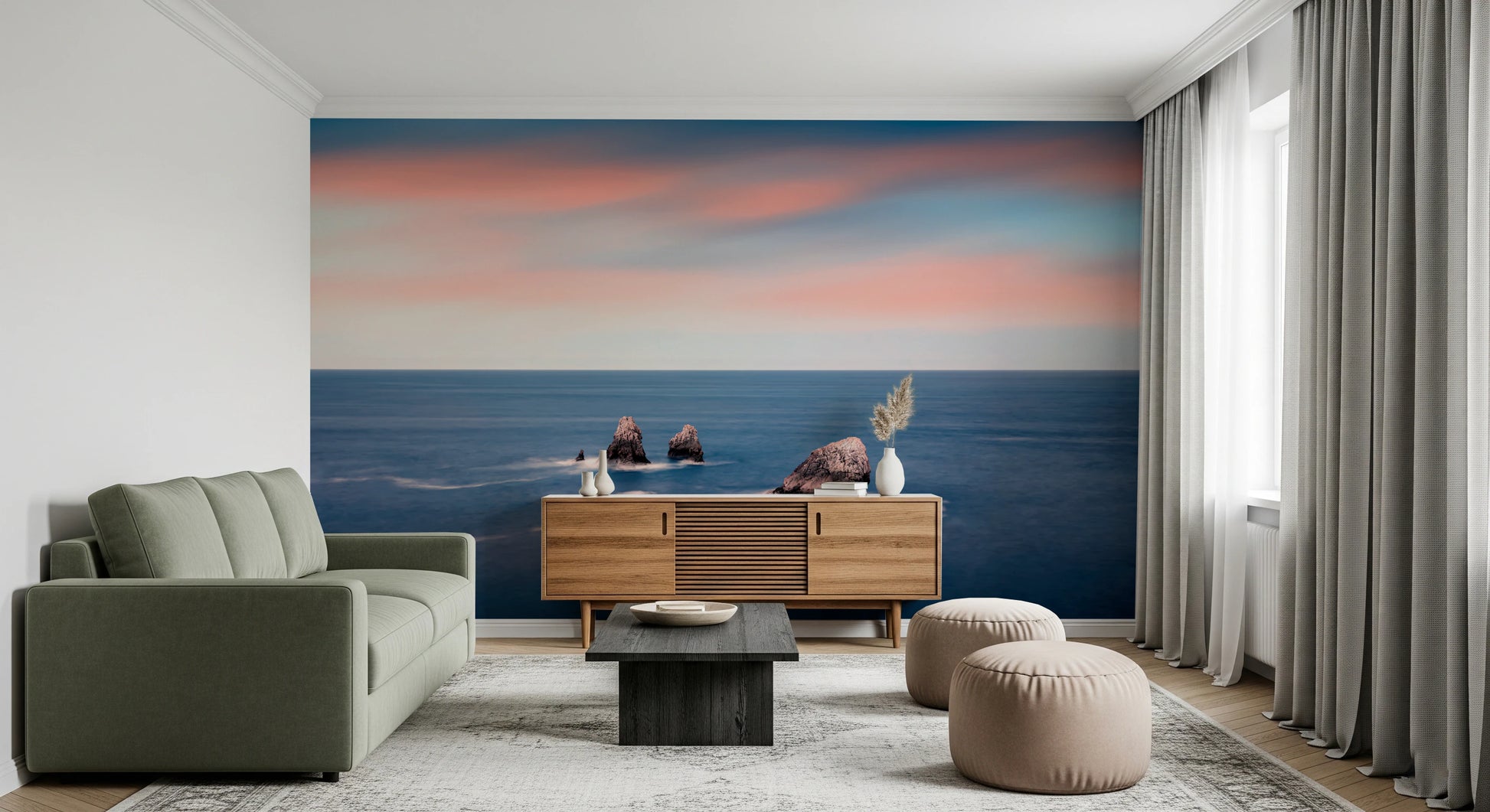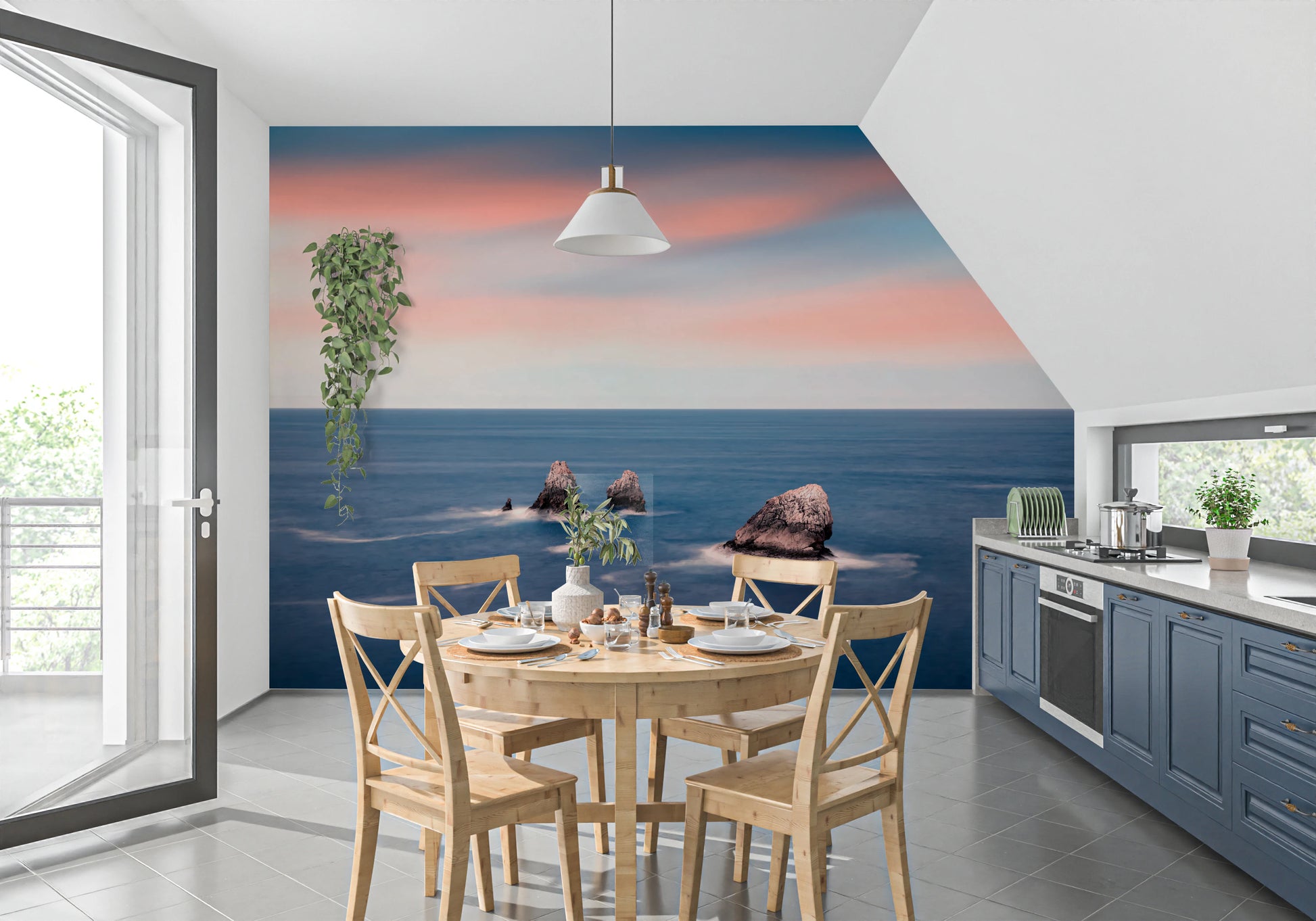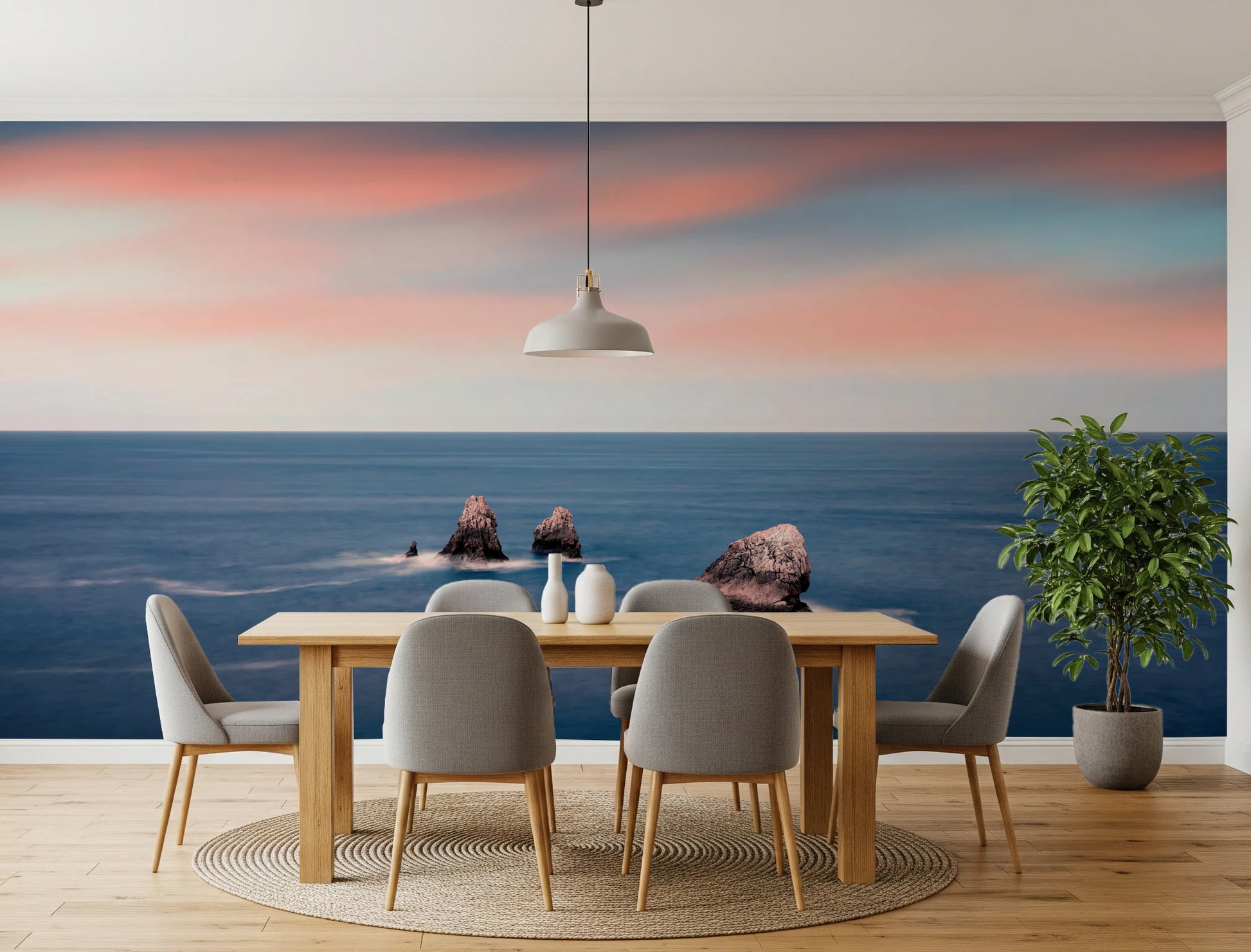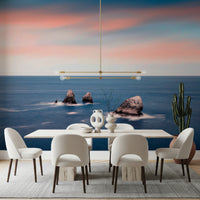 Transform any room into a serene coastal escape with this stunning wallpaper for walls. The design showcases striking rock formations rising from a smooth, deep blue sea. A blend of blush pink and soft blue hues paints the sky, creating a calming, sunset-like atmosphere. Ideal for living rooms, bedrooms, or offices, this wallpaper adds depth and visual interest. It works beautifully as a feature wall, complementing both modern and minimalist interiors. Enhance your space with this tranquil landscape.